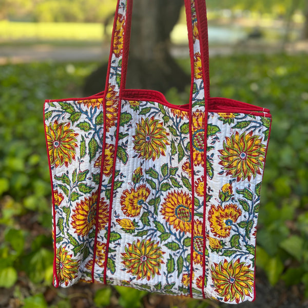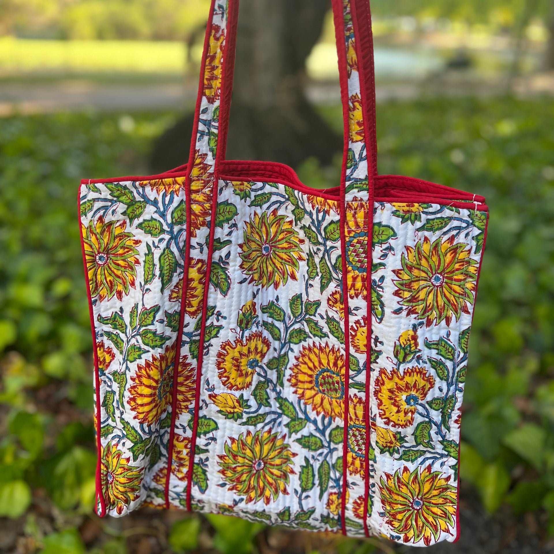 Pretty, quality, quilted, hand block printed tote bag  featuring  beautiful bright sunflowers, finished with complementary piping. It is perfect for the beach, shopping, school, picnic, the gym, home storage, or traveling... Details you'll love... Spacious Hand block printed Ethically sourced Pure...View more