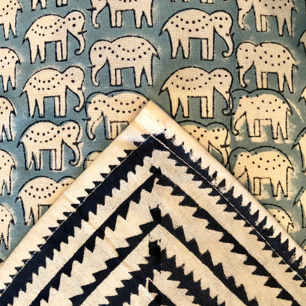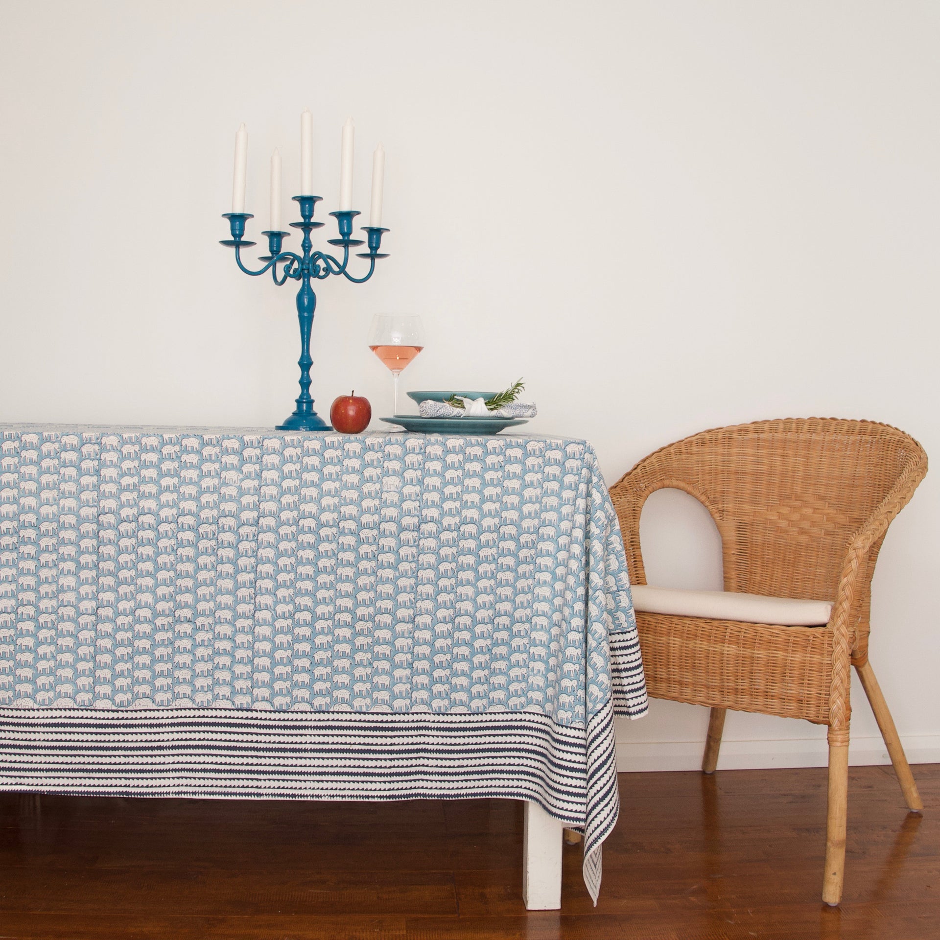Share your mealtimes with this adorable herd of mini blue elephants surrounded on all sides by an intricate border detail. This large rectangular tablecloth is perfect for an 8-10 seater table and doubles beautifully as a throw on a favourite sofa.
