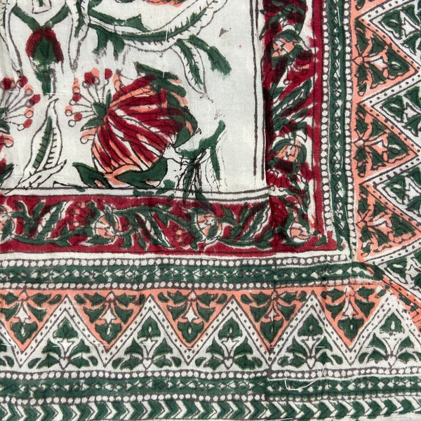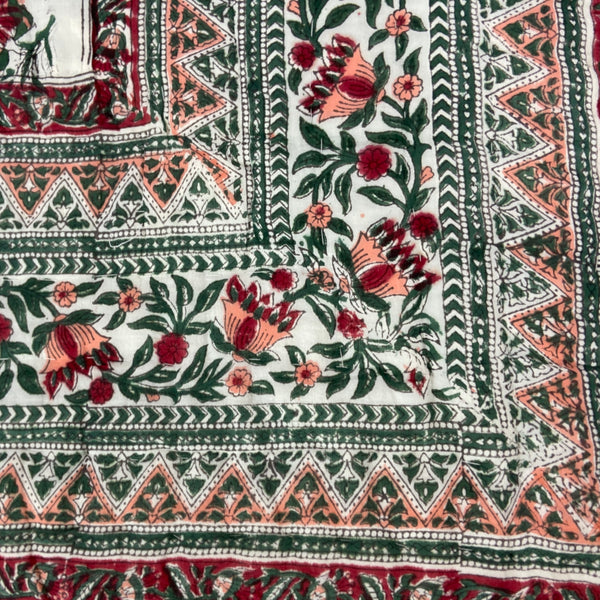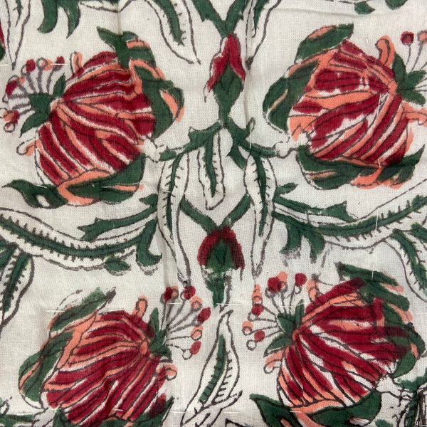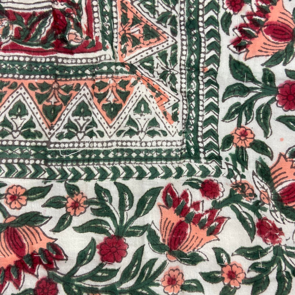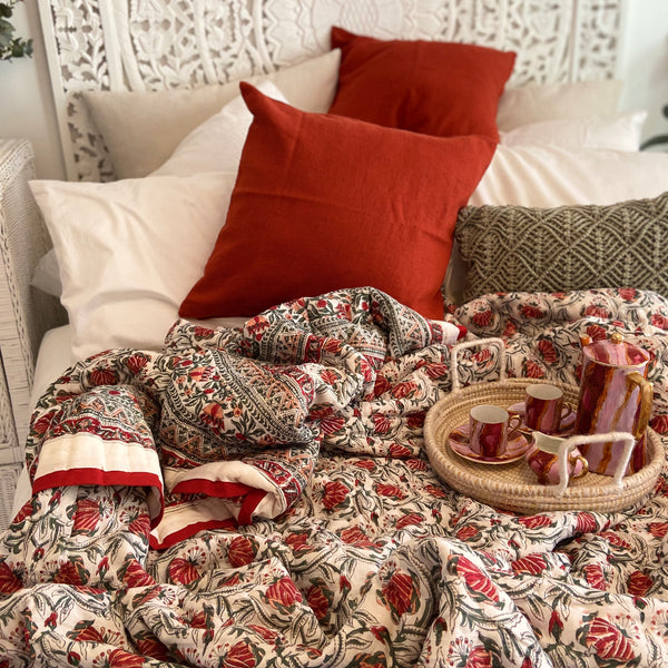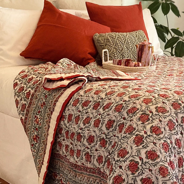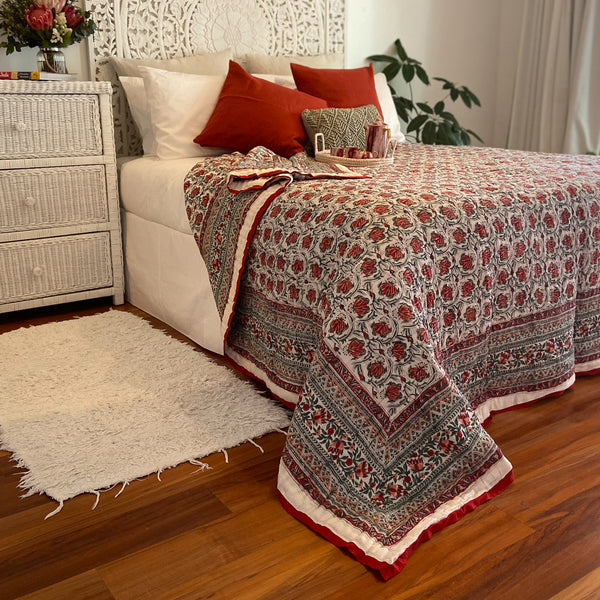 These quilts are lovingly hand block printed by skilled artisans in Jaipur, India using traditional techniques. They are then filled with natural cotton padding and hand quilted by a skilled group of beautiful ladies in a labour of love that shines through in these beautiful heirloom quilts. Due to their handcrafted nature, irregularities may occur rendering each piece unique.
