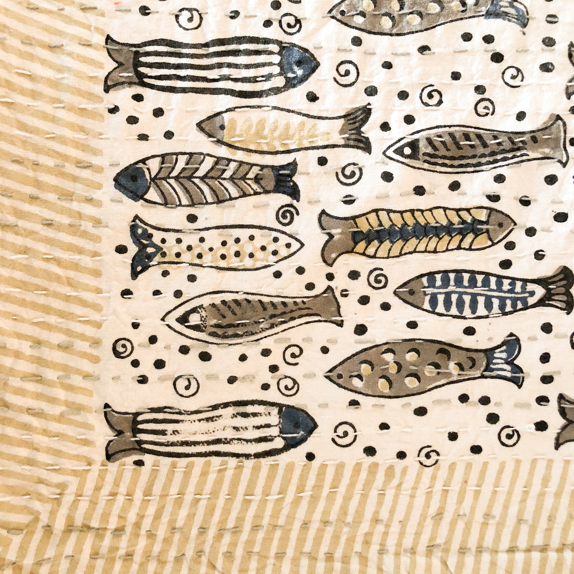 This charming quilt features pastel grey, beige and lemon fish, on a soft white background, with plain white cotton on the reverse. It is finished with a gentle lemon striped border, corresponding Kantha stitching and cross-stitched edges. Perfect for the warmer weather as a bed cover or sofa throw.