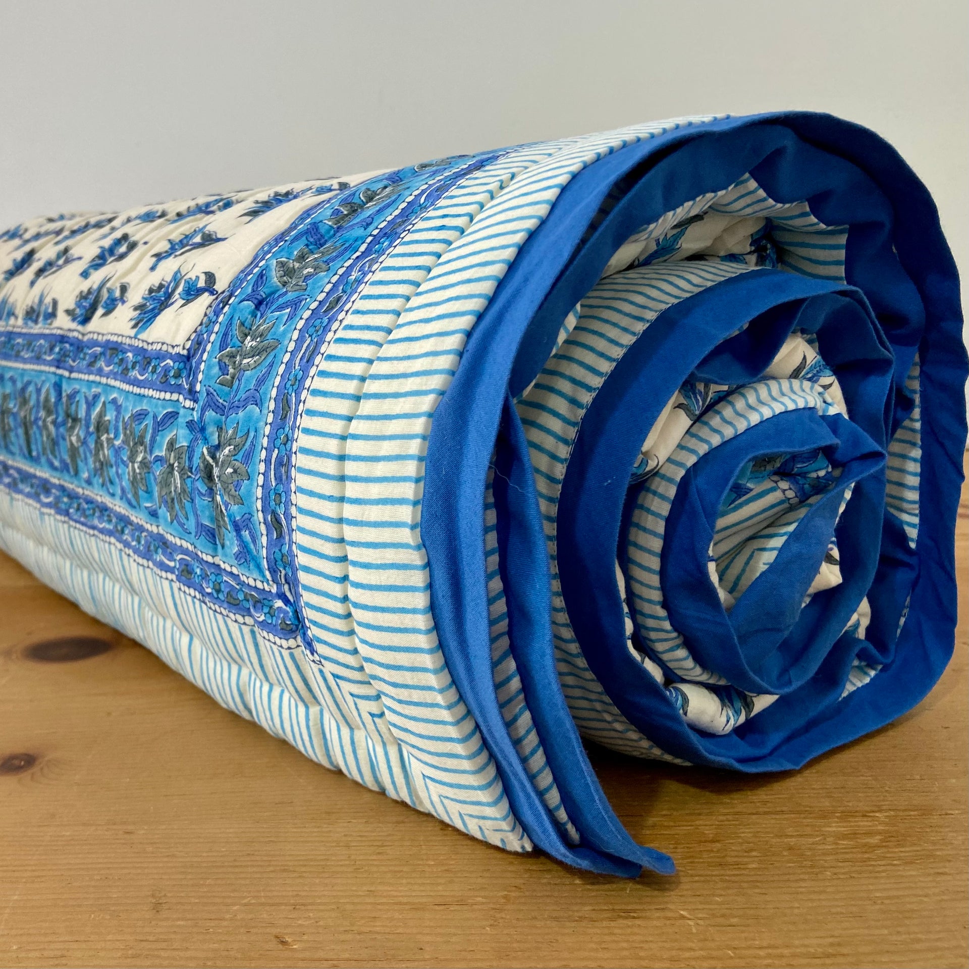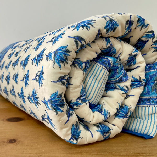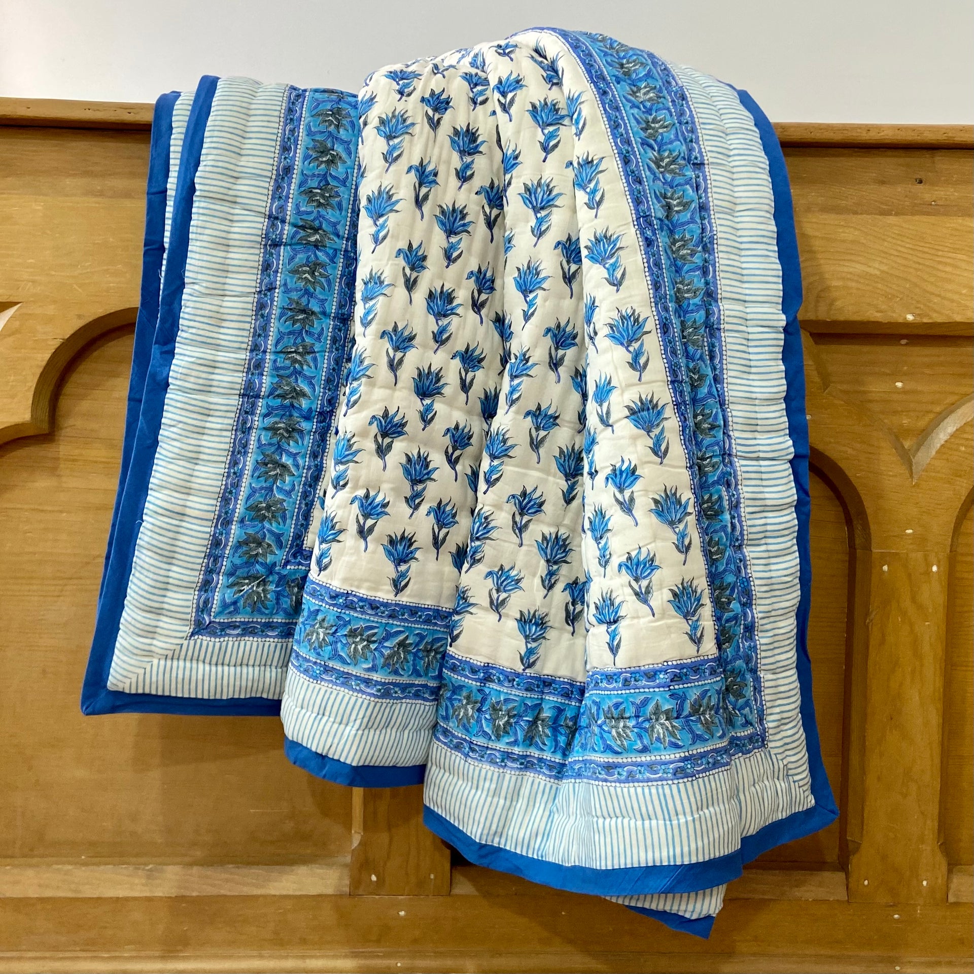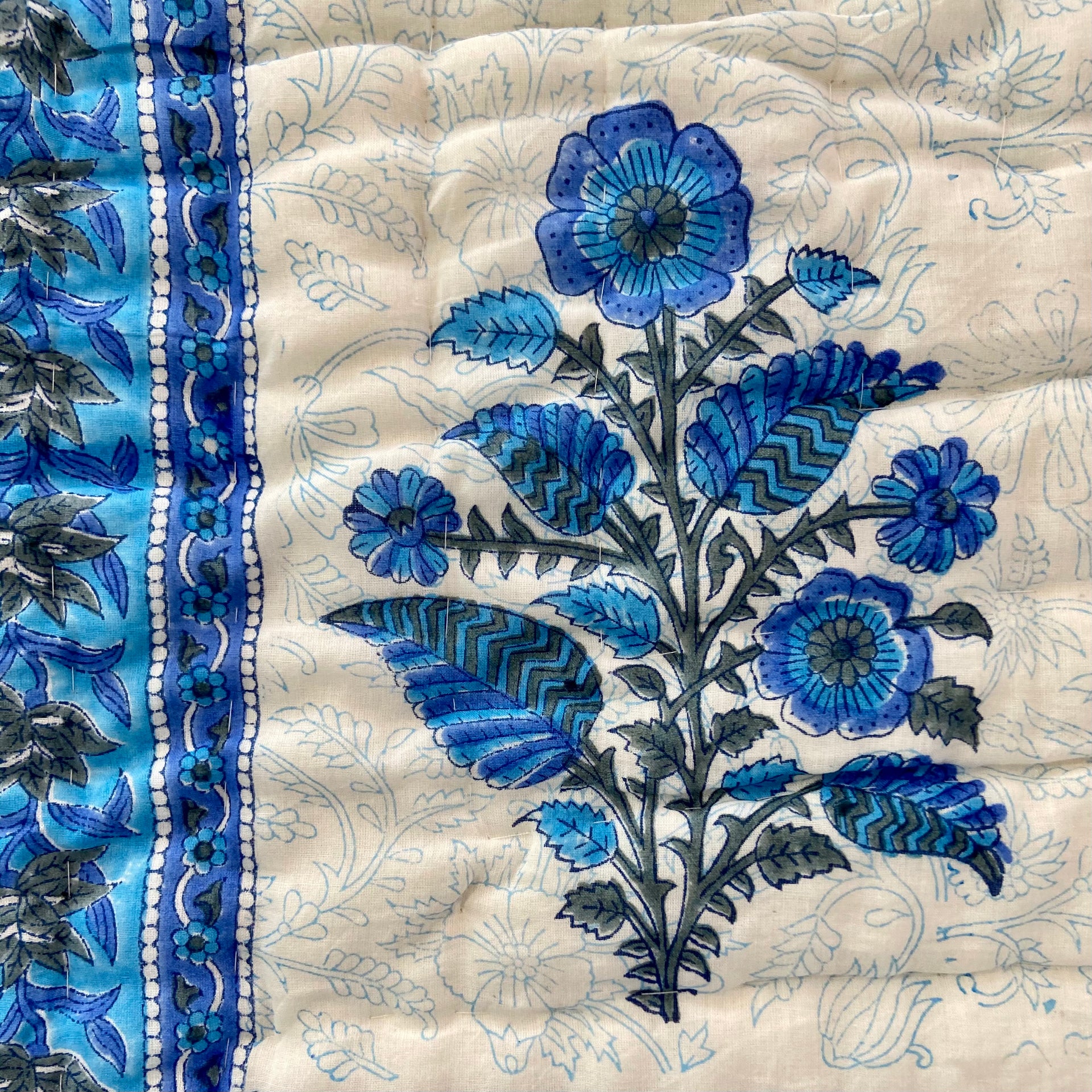 These quilts are lovingly hand block printed by skilled artisans in Jaipur, India using traditional techniques. They are then filled with natural cotton padding and hand quilted by a skilled group of beautiful ladies in a labour of love that shines through in these beautiful heirloom quilts. Due to their handcrafted nature, irregularities may occur rendering each piece unique.
