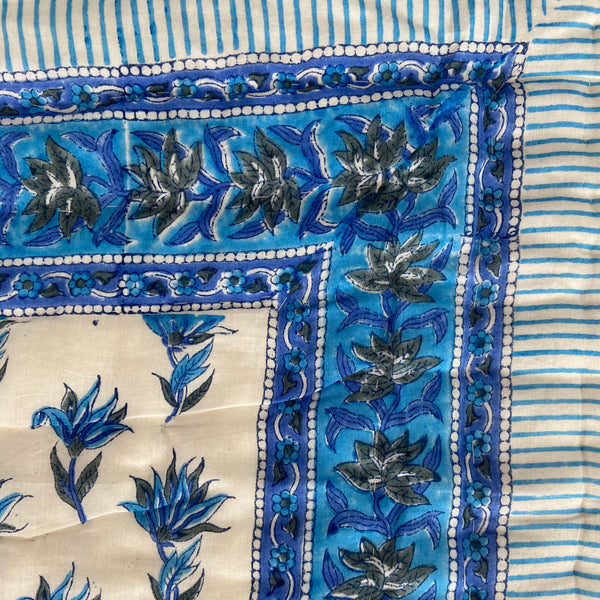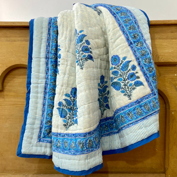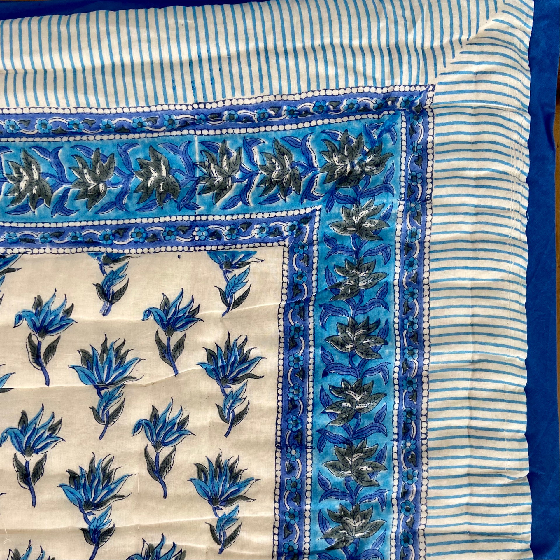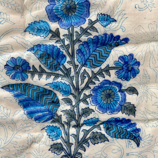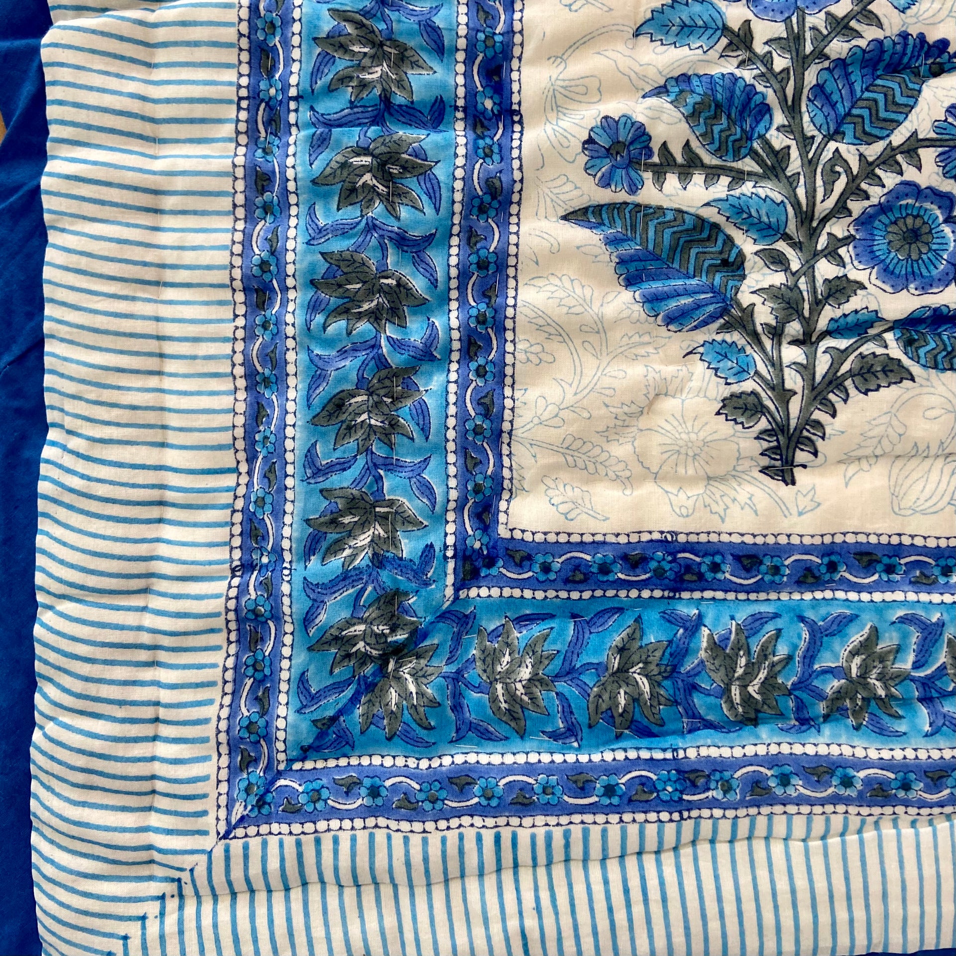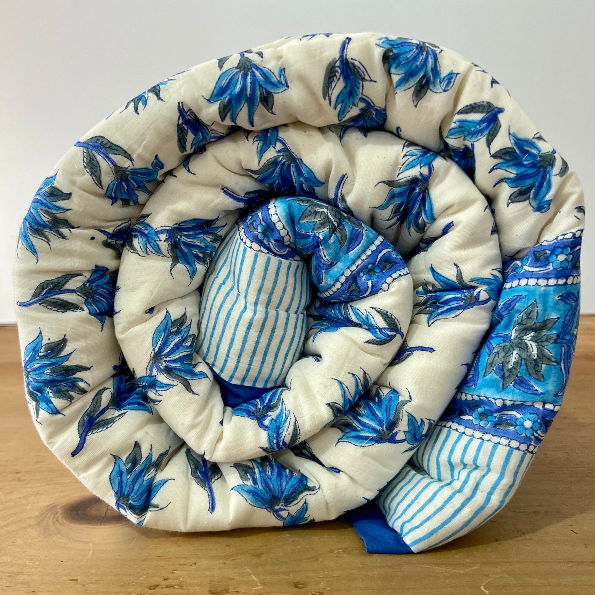 These quilts are lovingly hand block printed by skilled artisans in Jaipur, India using traditional techniques. They are then filled with natural cotton padding and hand quilted by a skilled group of beautiful ladies in a labour of love that shines through in these beautiful heirloom quilts. Due to their handcrafted nature, irregularities may occur rendering each piece unique.