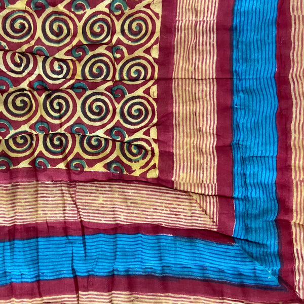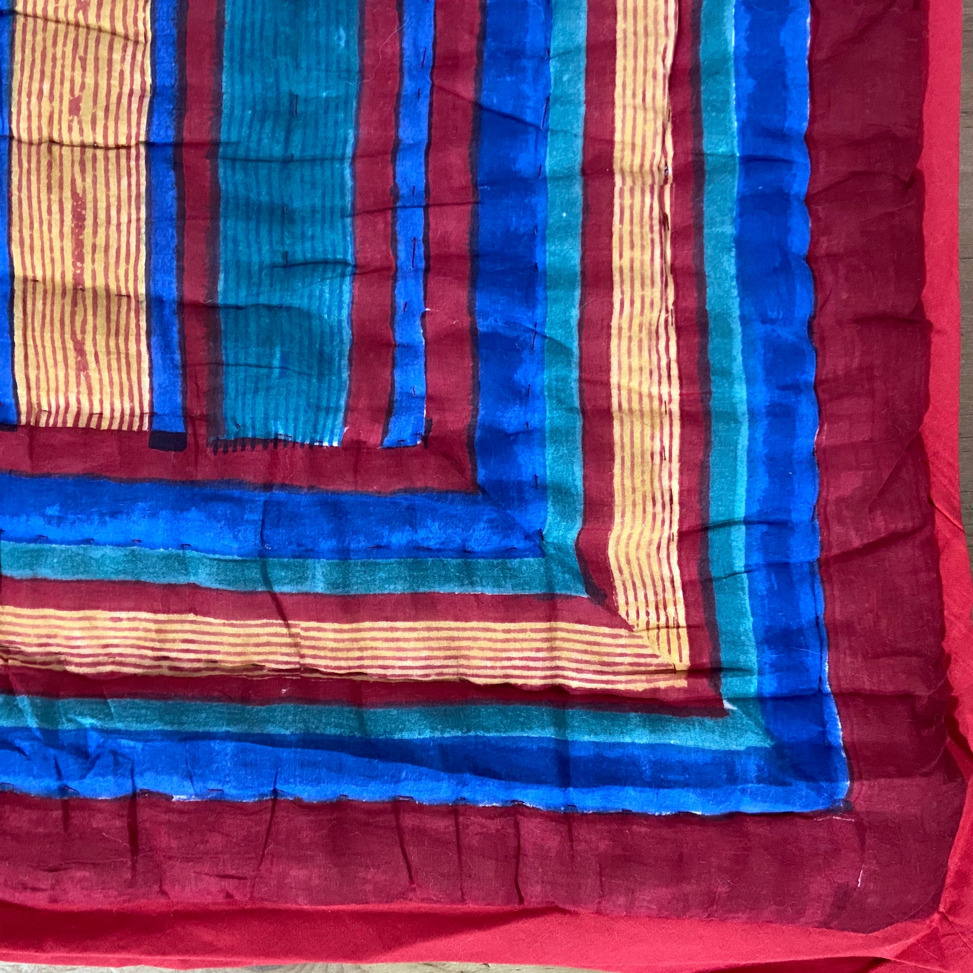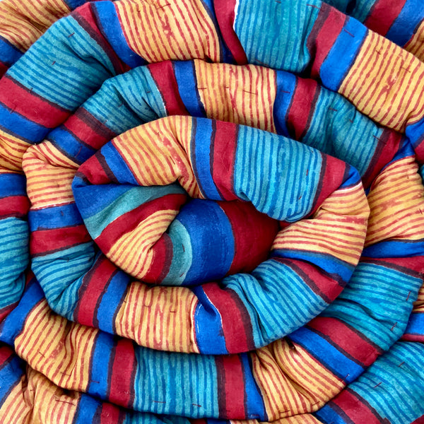 Stunning and colourful to spread joy! Named after the popular sweet snack that you see in India made with batter and soaked in sugar syrup! One side has a Jalebi design and the other, a delicious stripe. Both sides feature rich reds, blues and ochres for a warm glow.