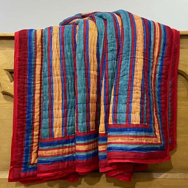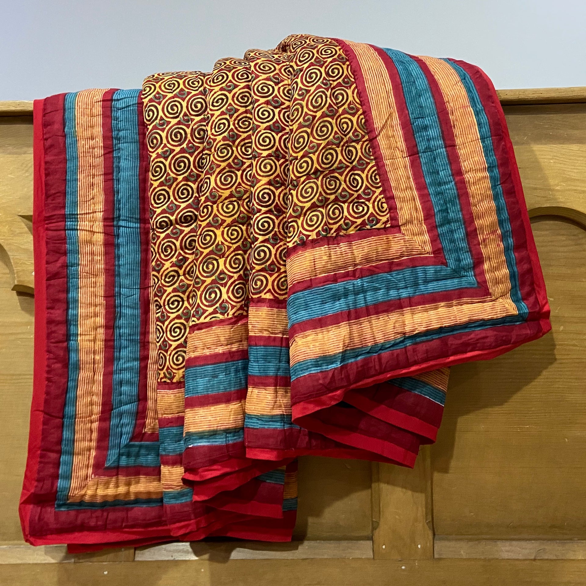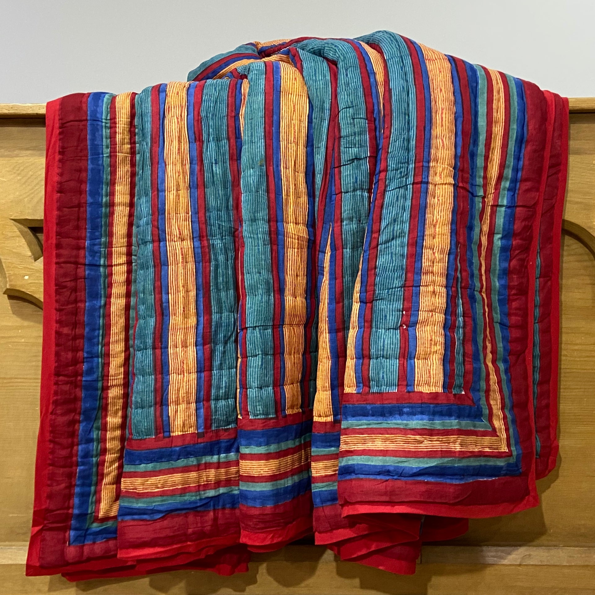 These quilts are lovingly hand block printed by skilled artisans in Jaipur, India using traditional techniques. They are then filled with natural cotton padding and hand quilted by a skilled group of beautiful ladies in a labour of love that shines through in these beautiful heirloom quilts. Due to their handcrafted nature, irregularities may occur rendering each piece unique.