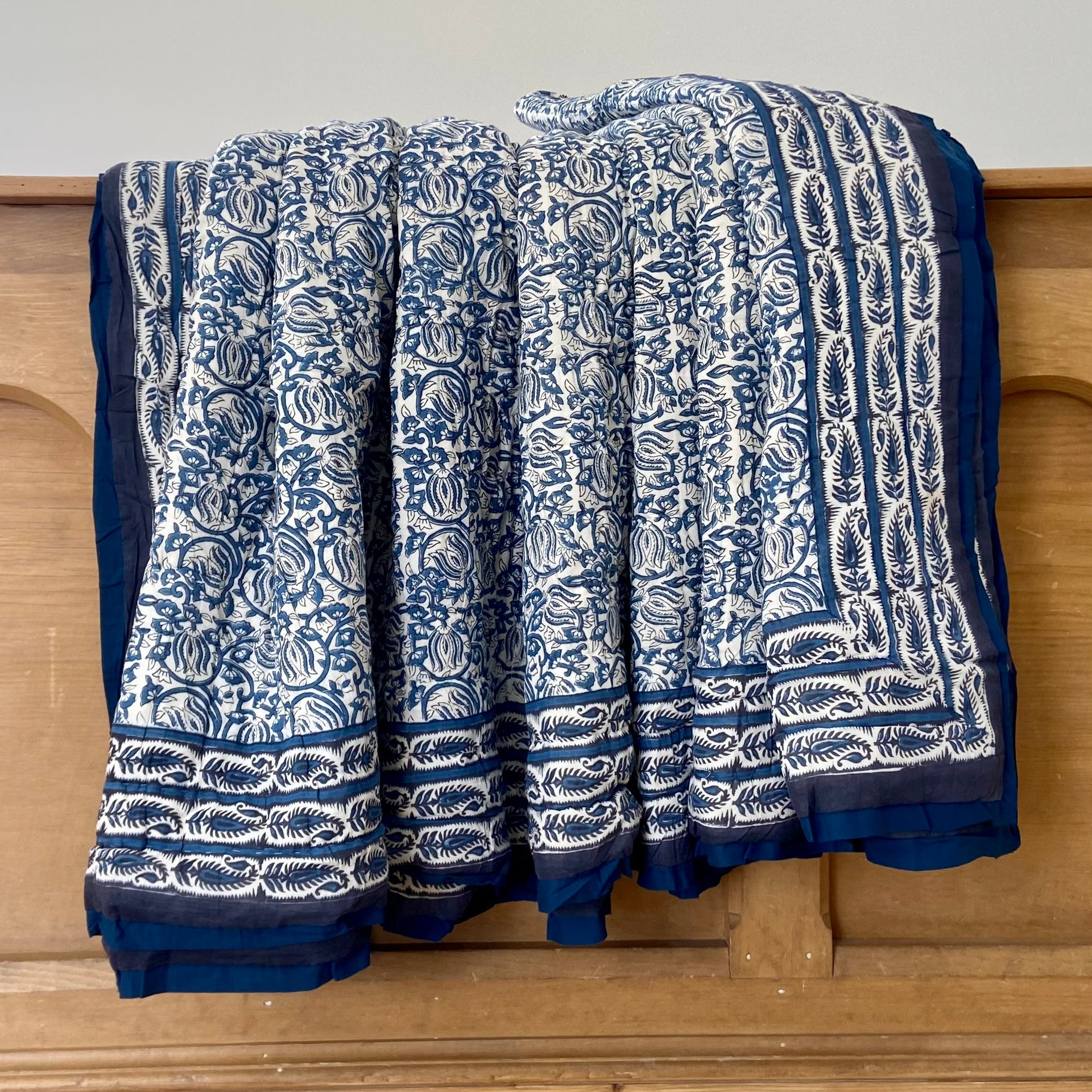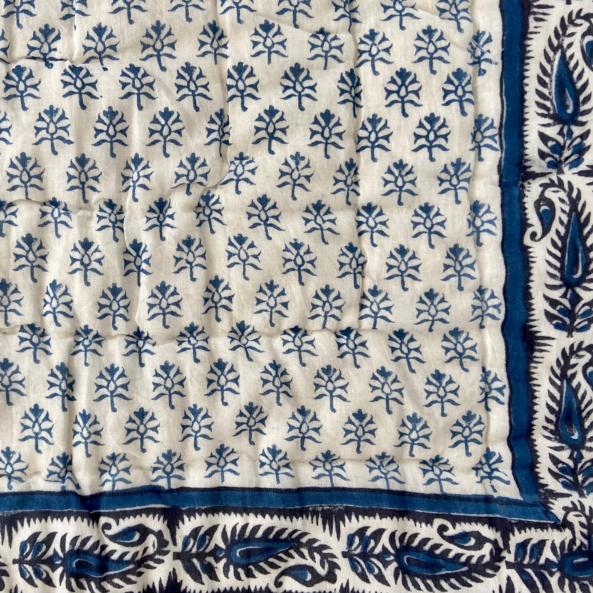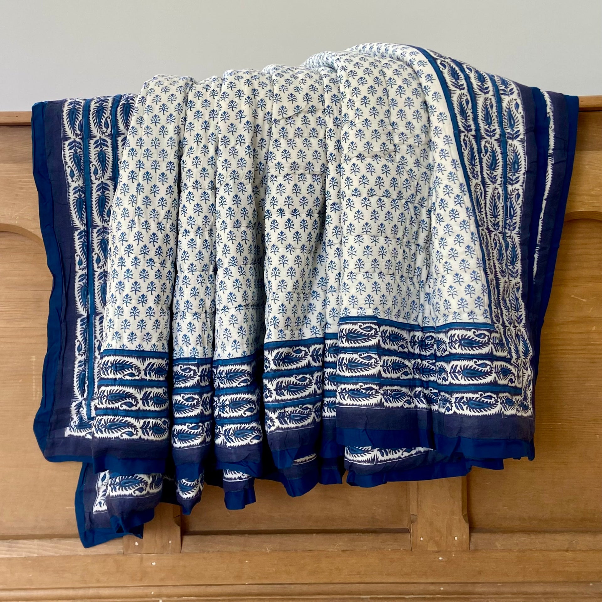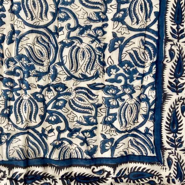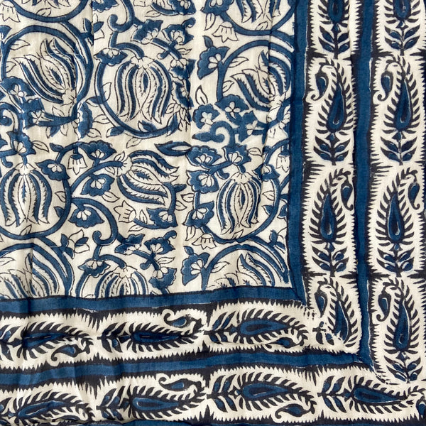 Handmade Indian Cotton Quilt- Two Lotus Blue
