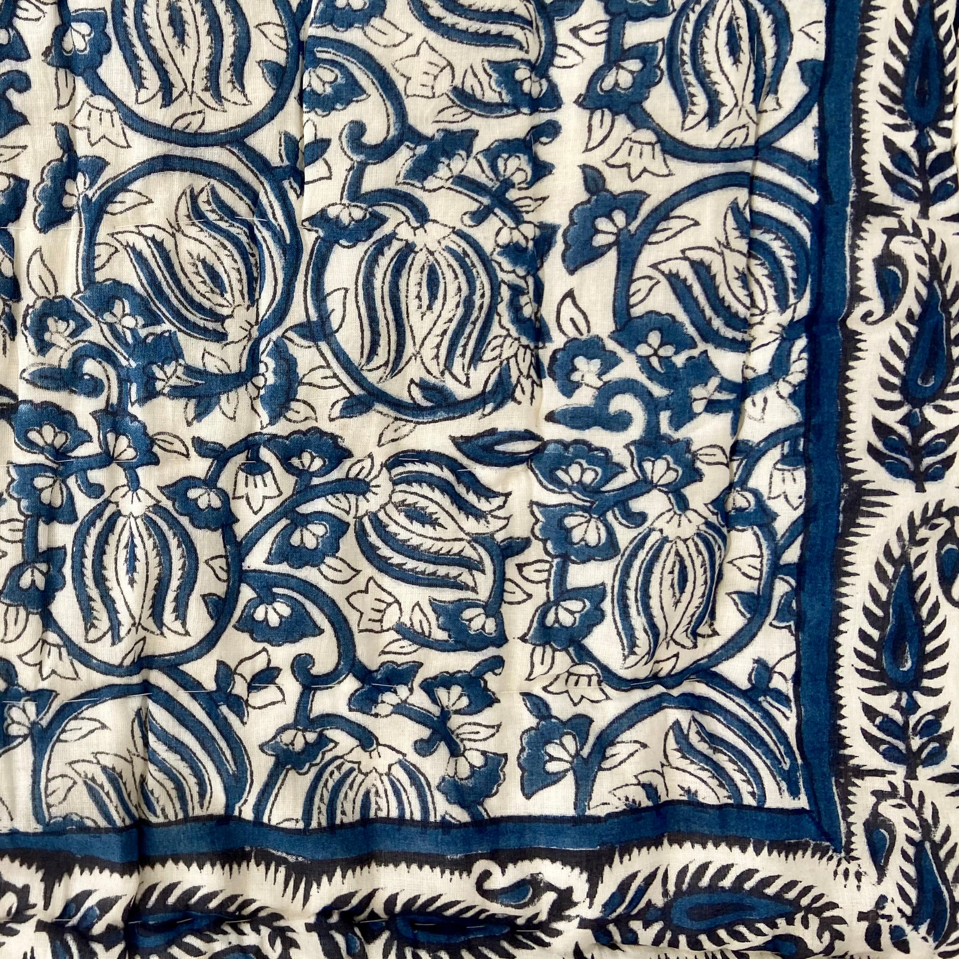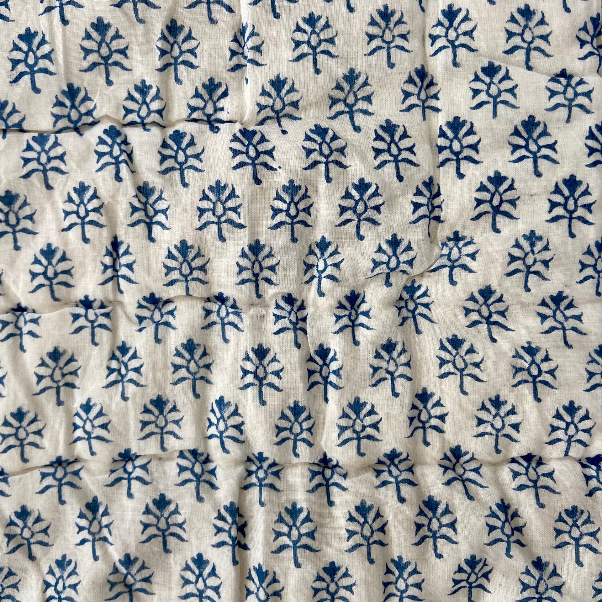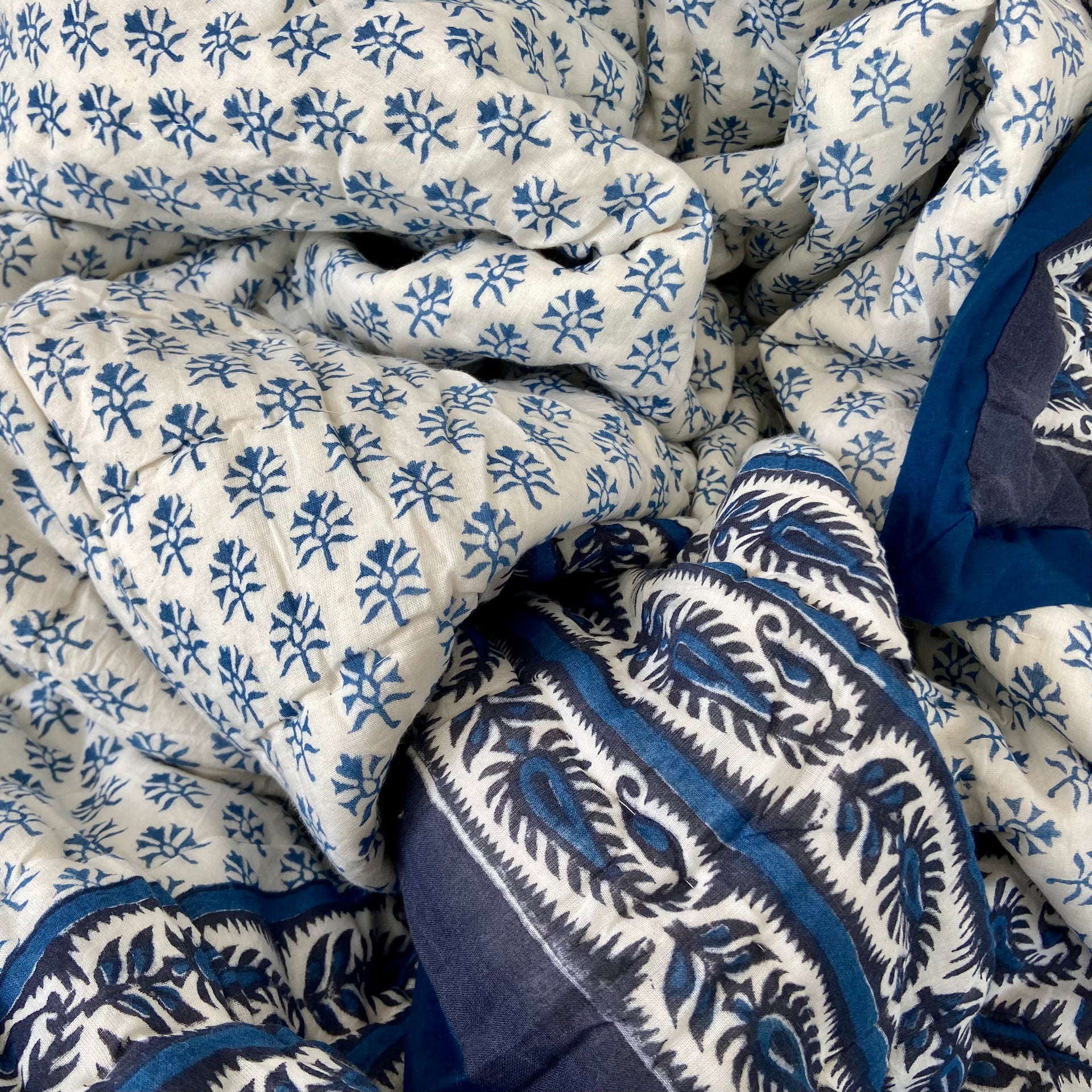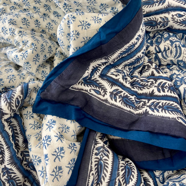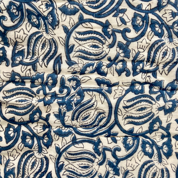 Handmade Indian Cotton Quilt- Two Lotus Blue