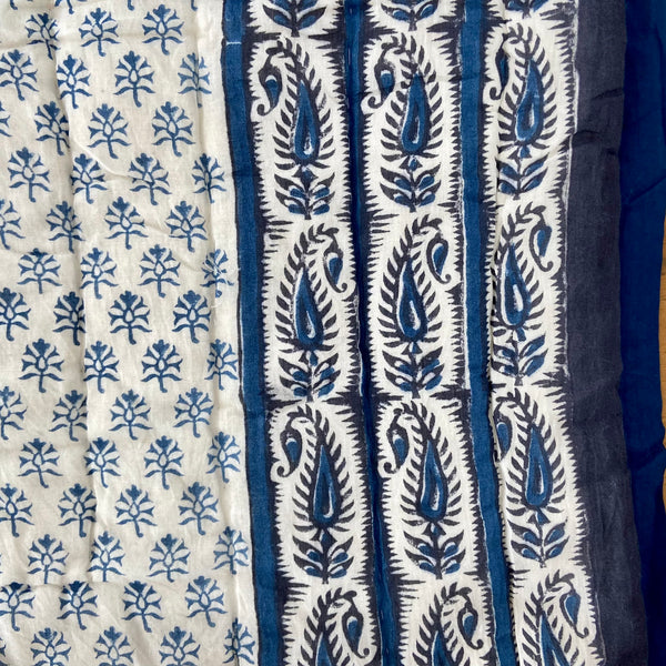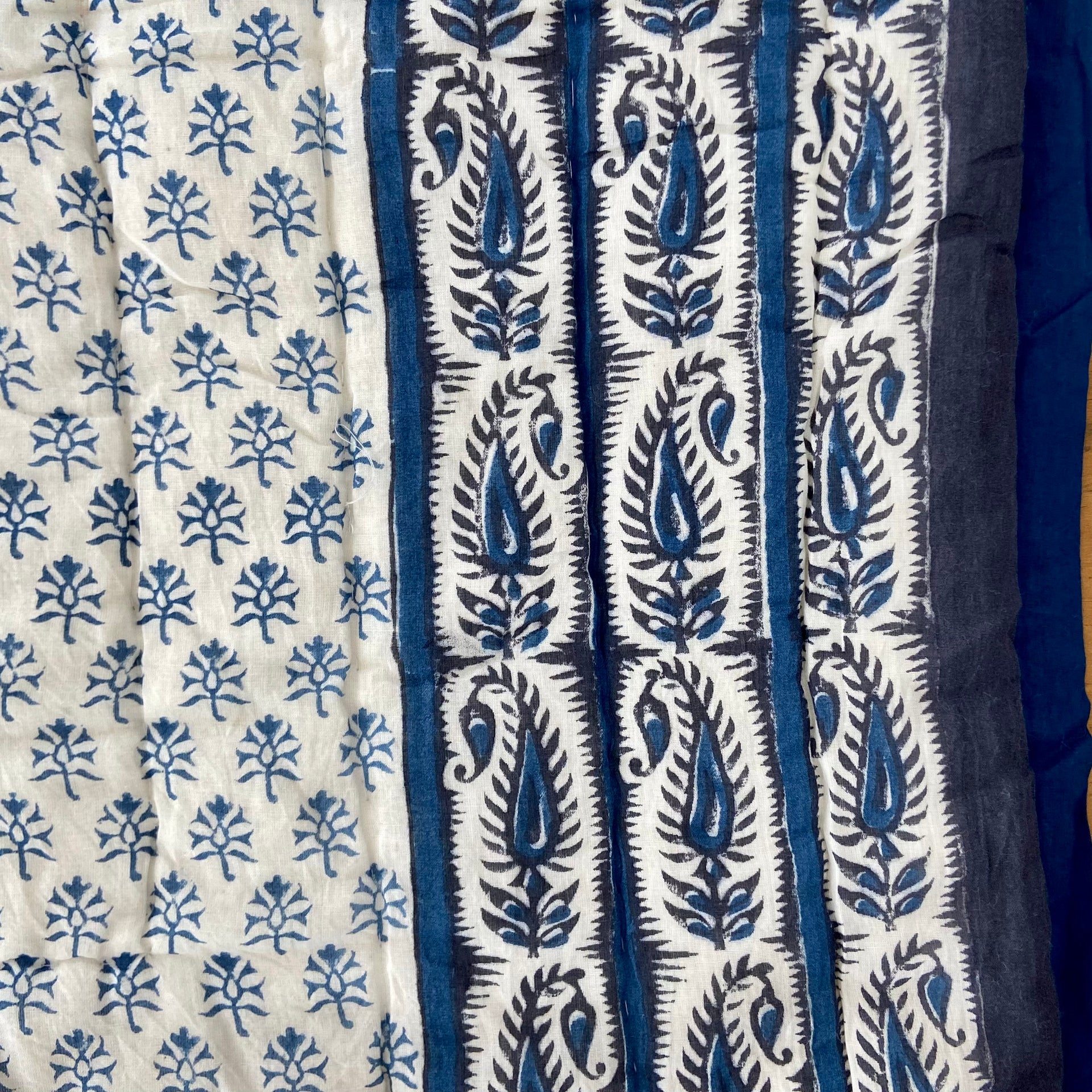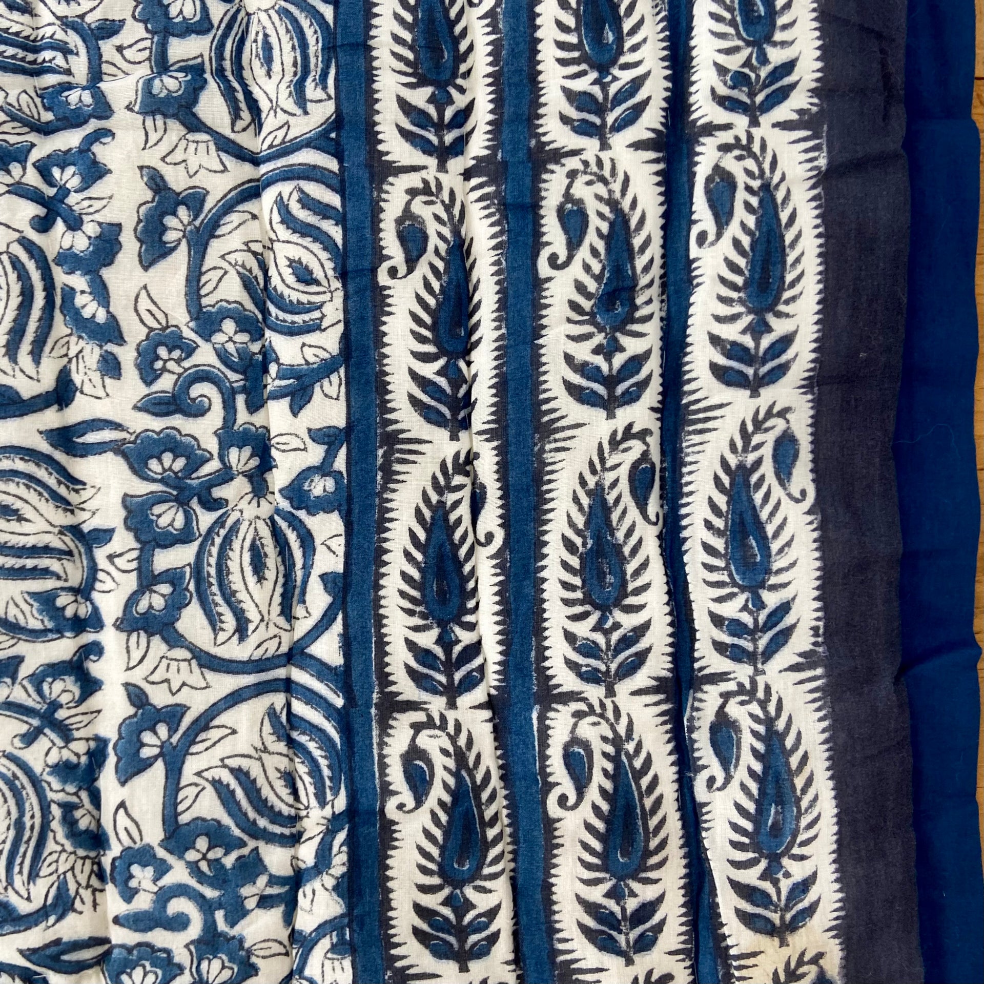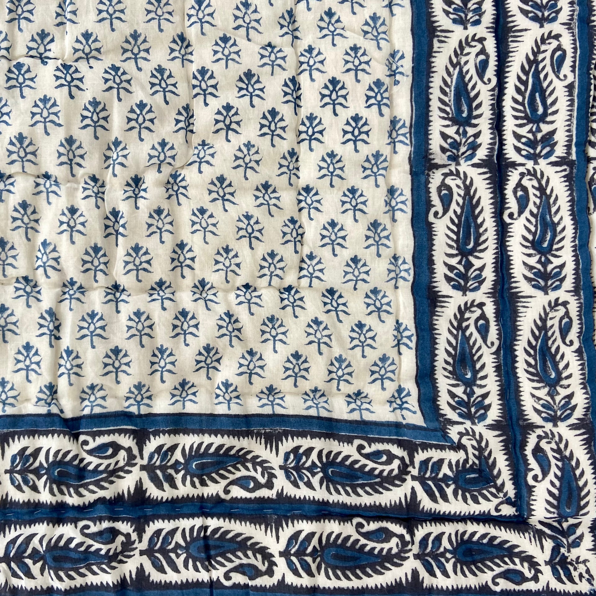 Such a pretty quilt featuring true blues, dark and light with a white background on both sides. One side has a lotus flower design and the reverse a traditional Indian neem flower design and both are framed with a pretty...View more