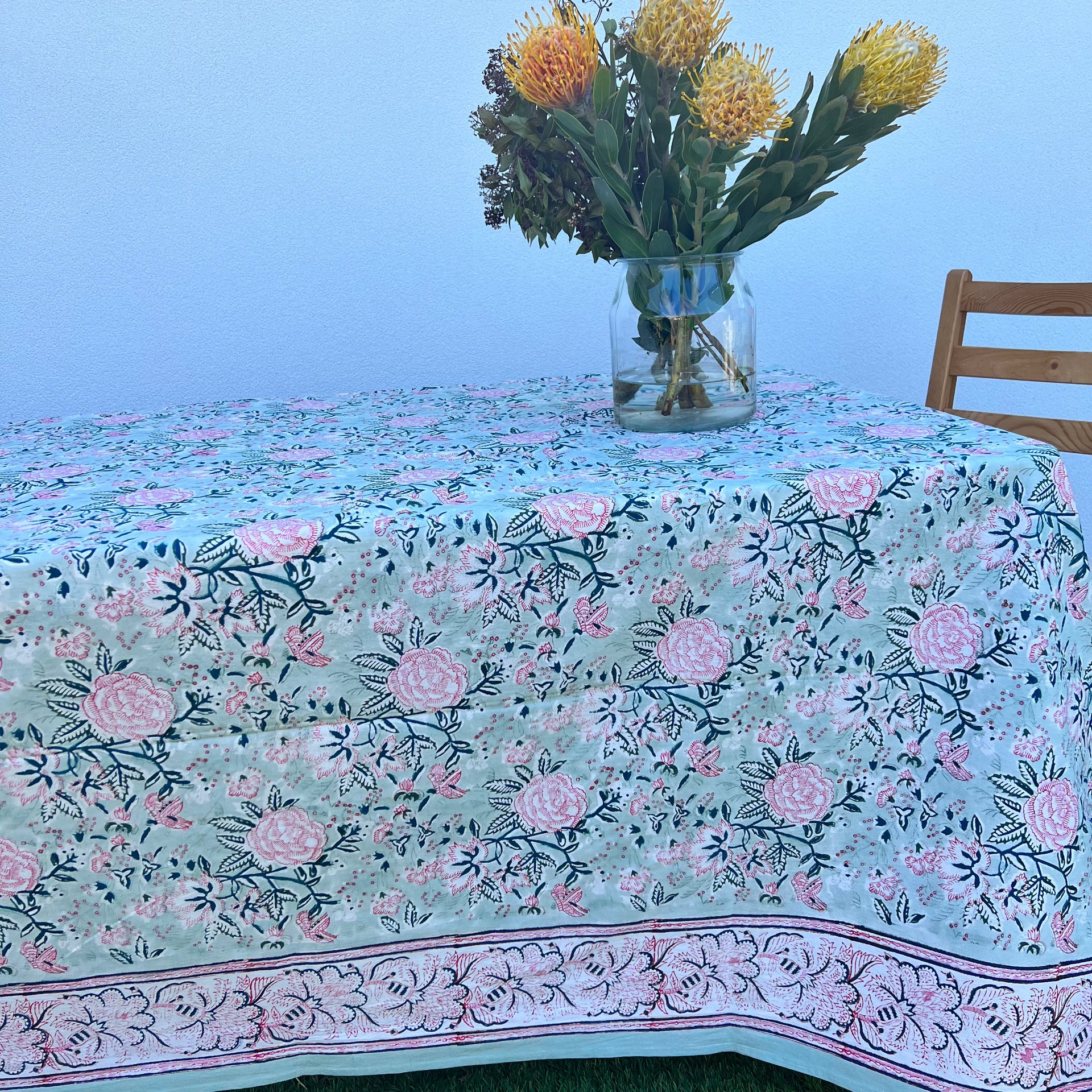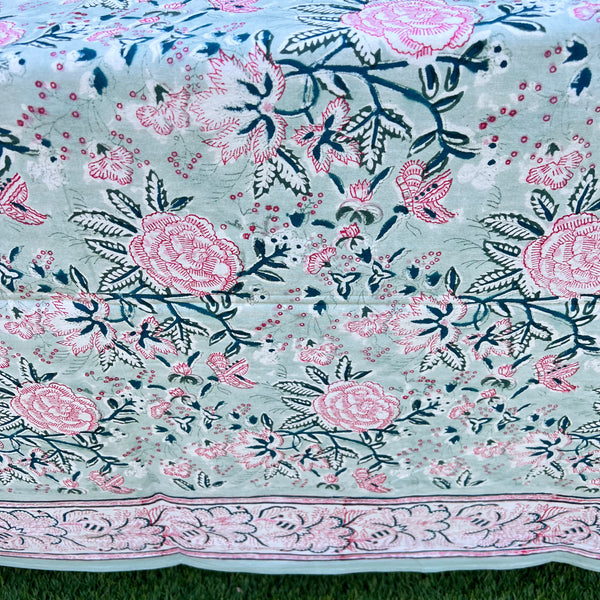 10-12 Seater Hand Block Printed Table Cloth - Rose Garden Green