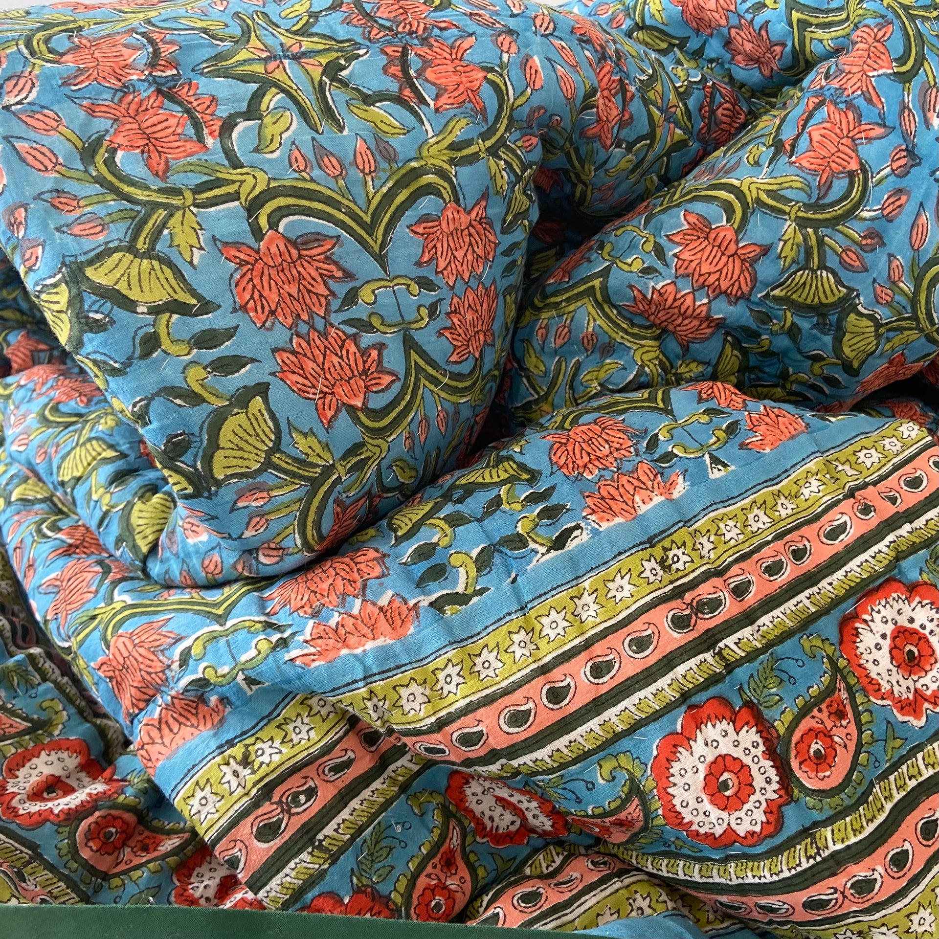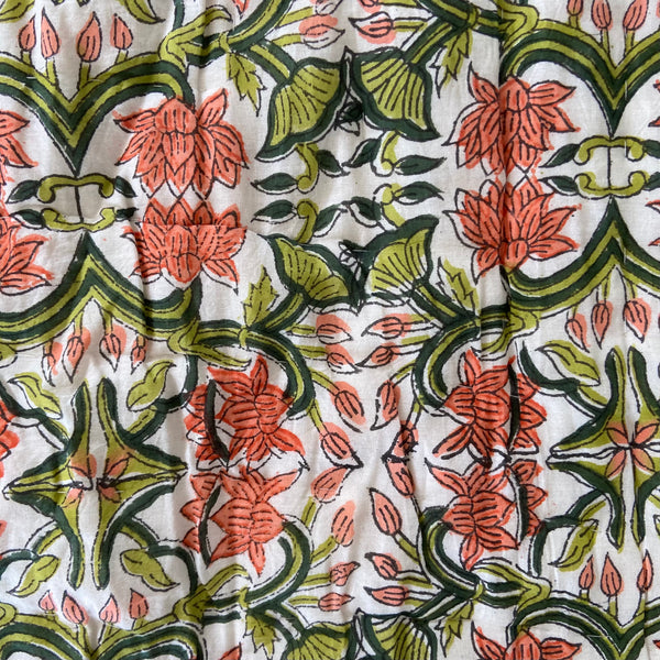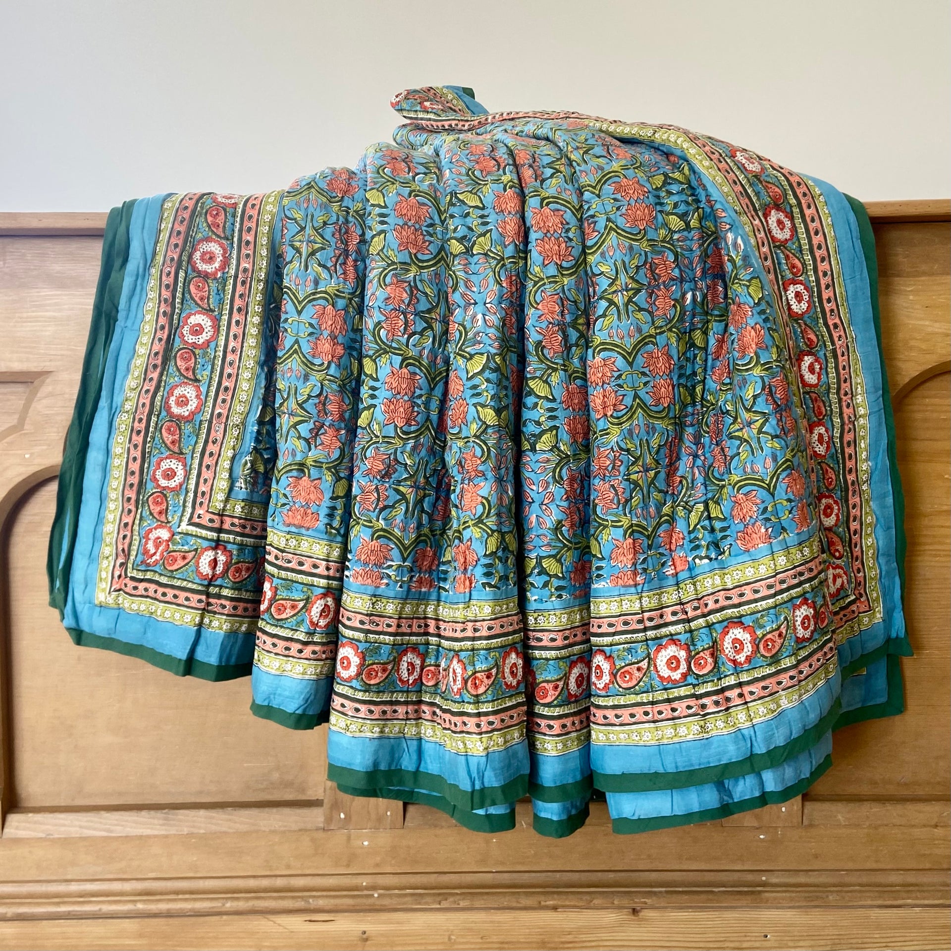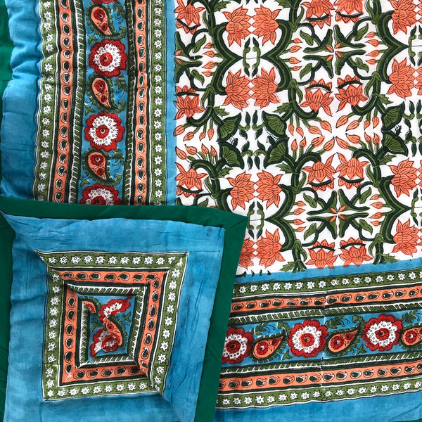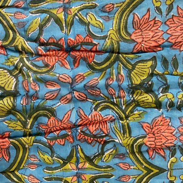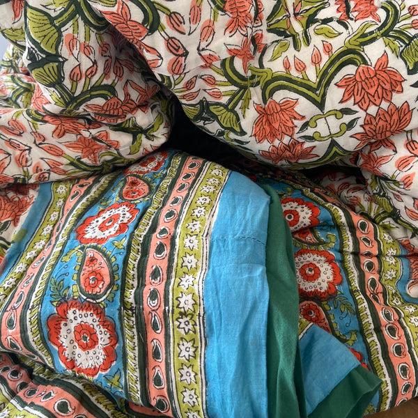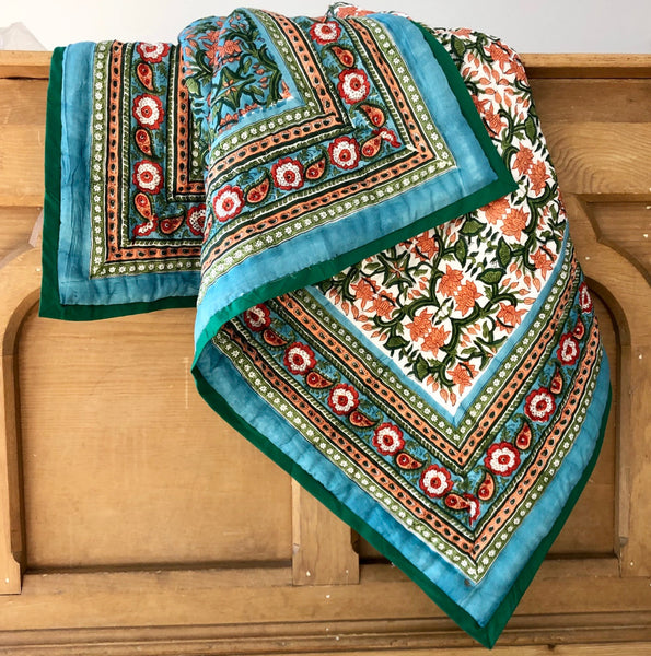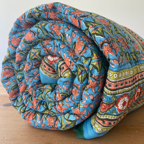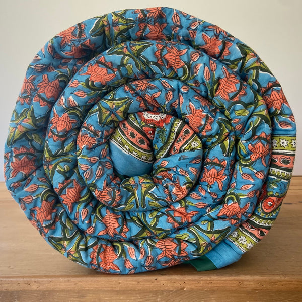 These quilts are lovingly hand-block printed by skilled artisans in Jaipur, India using traditional techniques. They are then filled with natural cotton padding and hand quilted by a skilled group of beautiful ladies in a labour of love that shines through in these beautiful heirloom quilts. Due to their handcrafted nature, irregularities may occur rendering each piece unique.