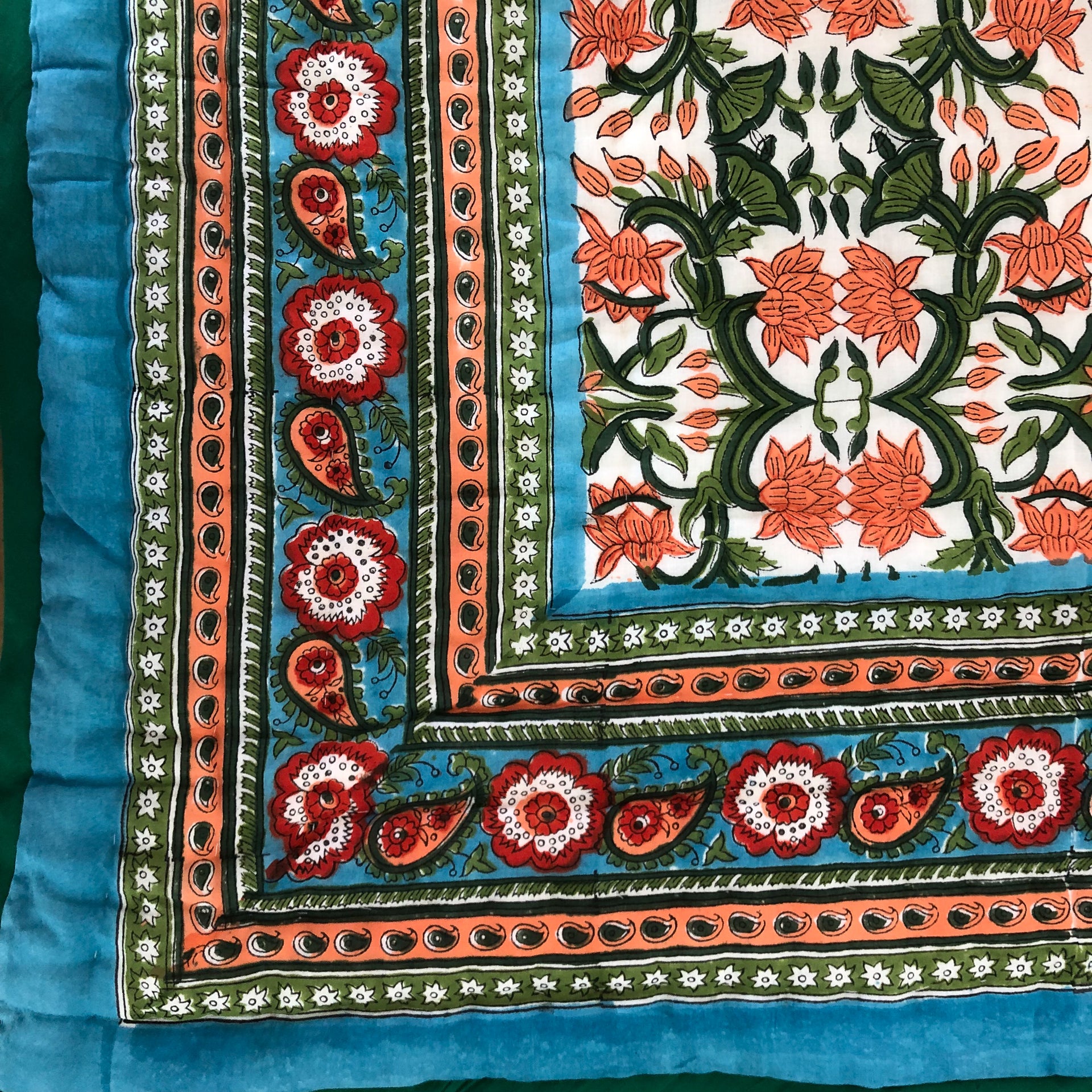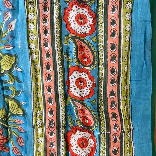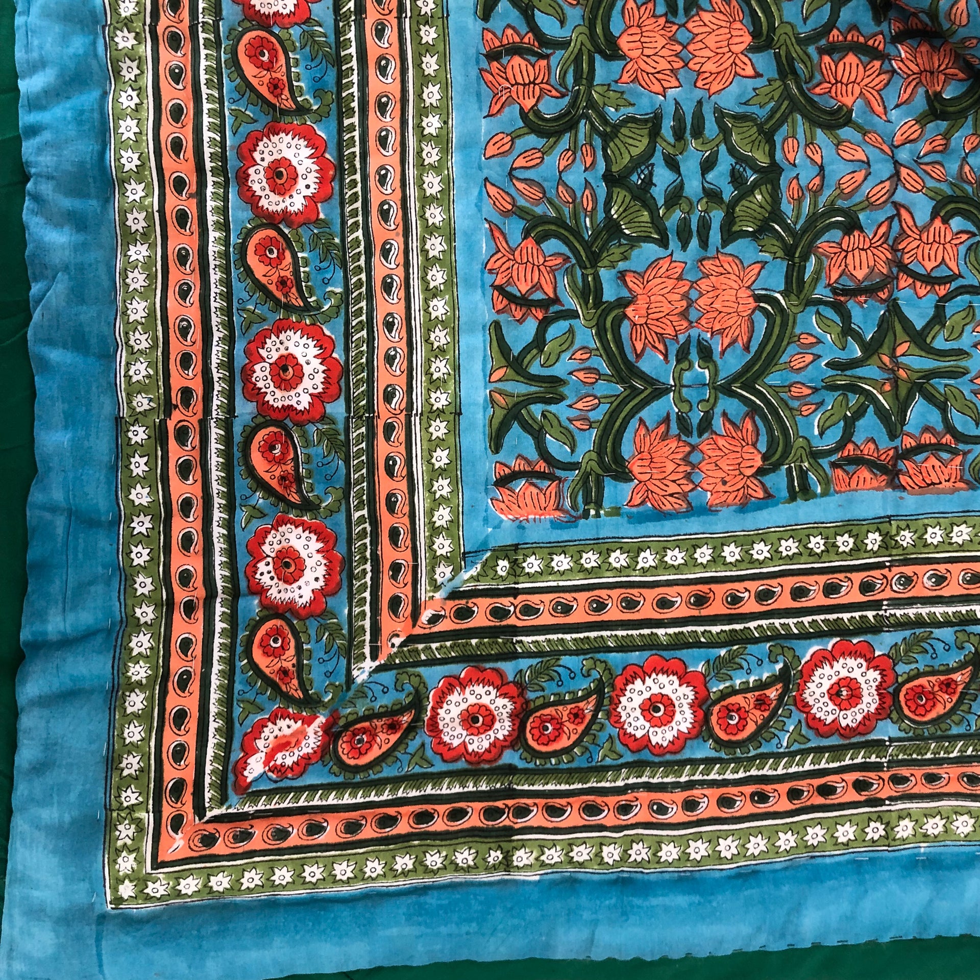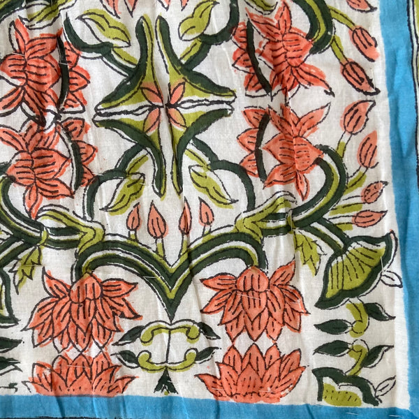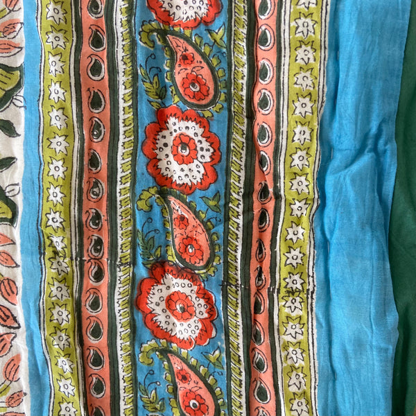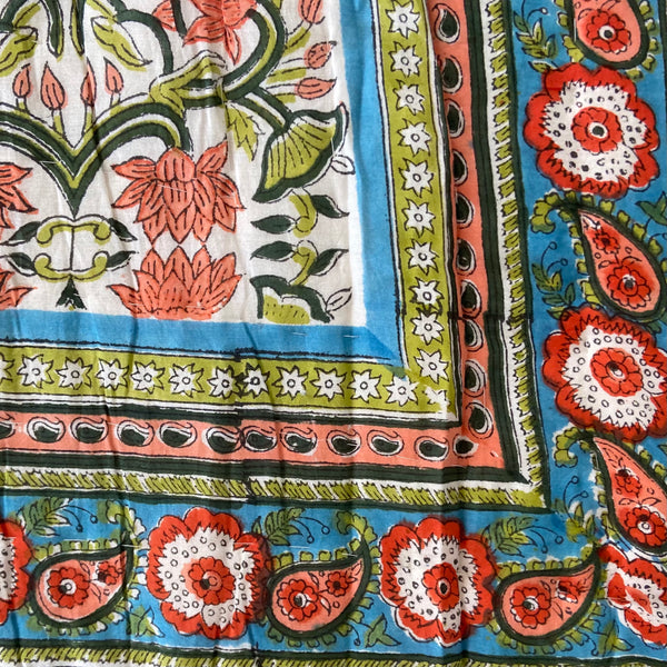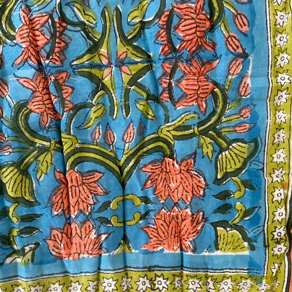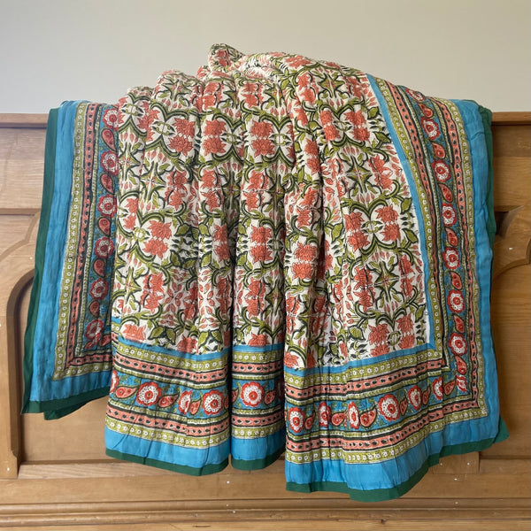 Splash into colour with this stunning quilt in deep blues, greens, corals, and reds in a tasteful lotus flower design on both sides (one on a pale background) and a complimentary border. Beautiful detailing and super soft lightweight 100% cotton voile. The only cover you will need in summer and perfect for an extra layer on your bed or sofa throw to keep off the winter chill. A fabulous addition enhancing the look and feel of your bedroom.