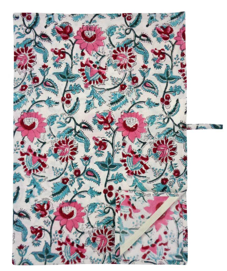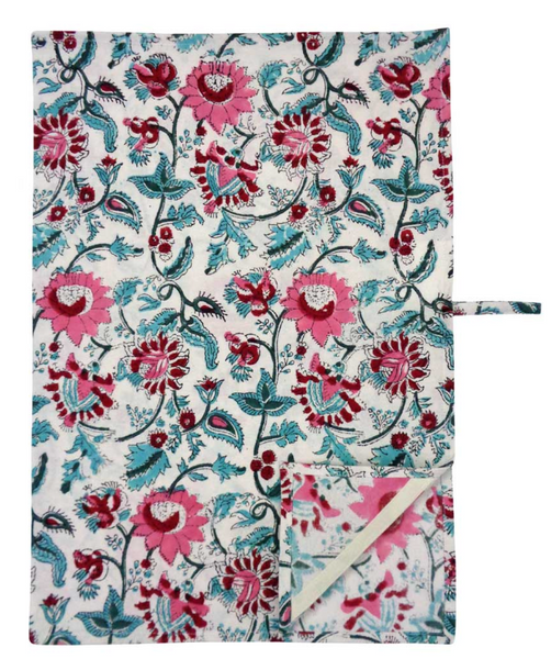 This pretty cotton tea towel in a pink, blue and green  floral design will brighten up your kitchen and make an ideal gift. It has hanging tapes for ease and will soften with each wash.   Details you'll love... Hand block printed on 100%...View more