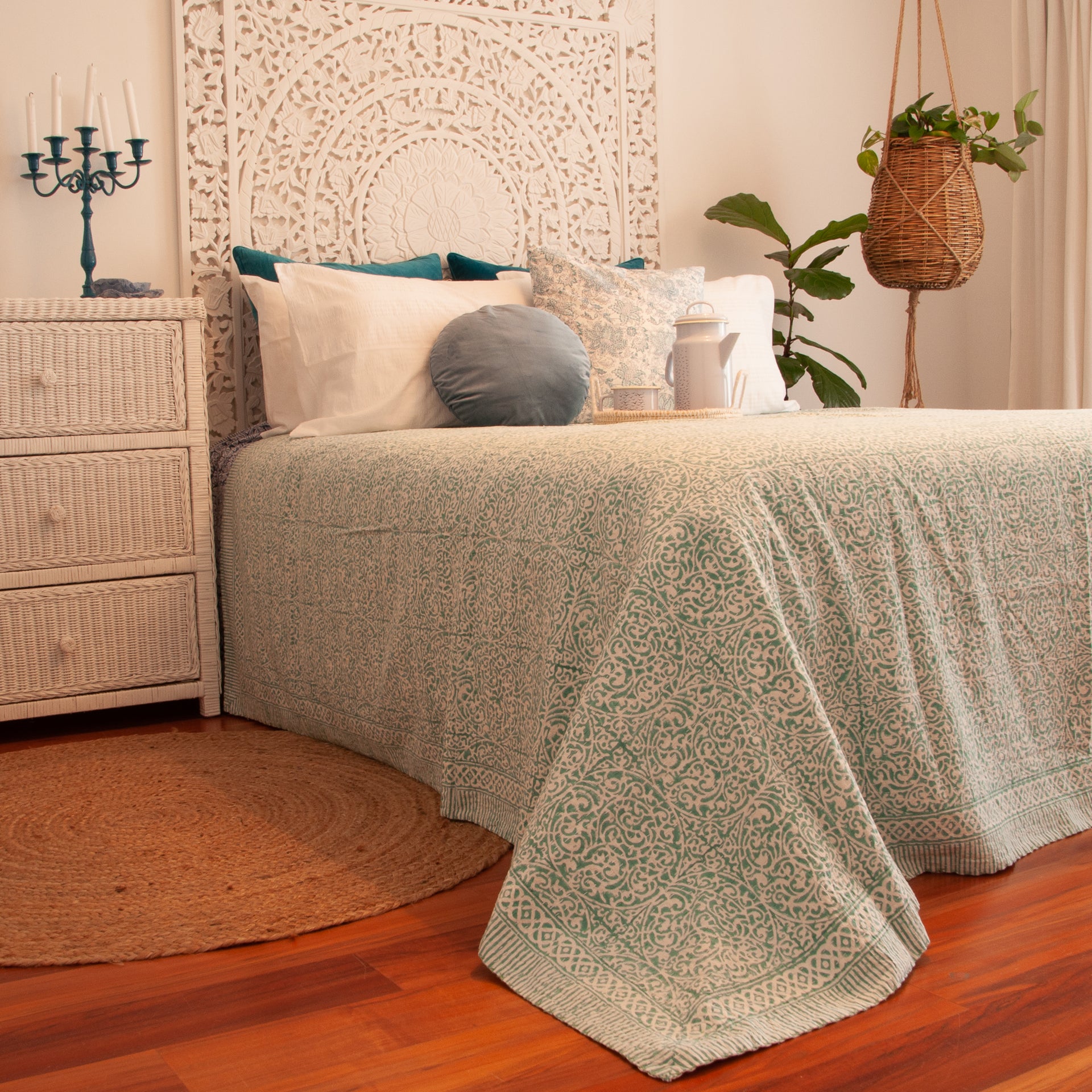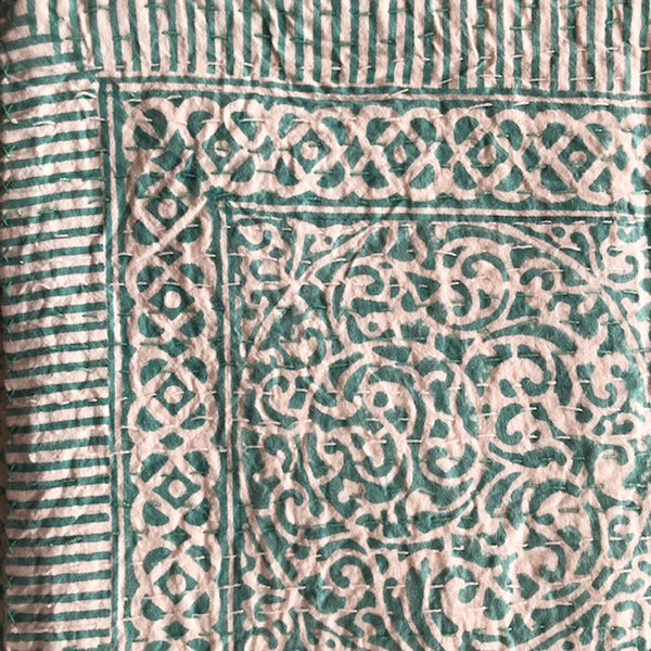 Hand Block Printed Kantha Quilt, Aqua Vine