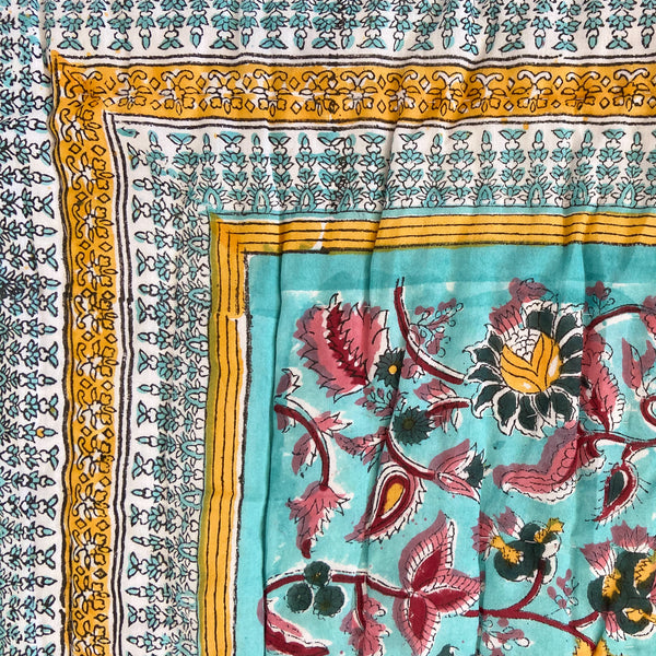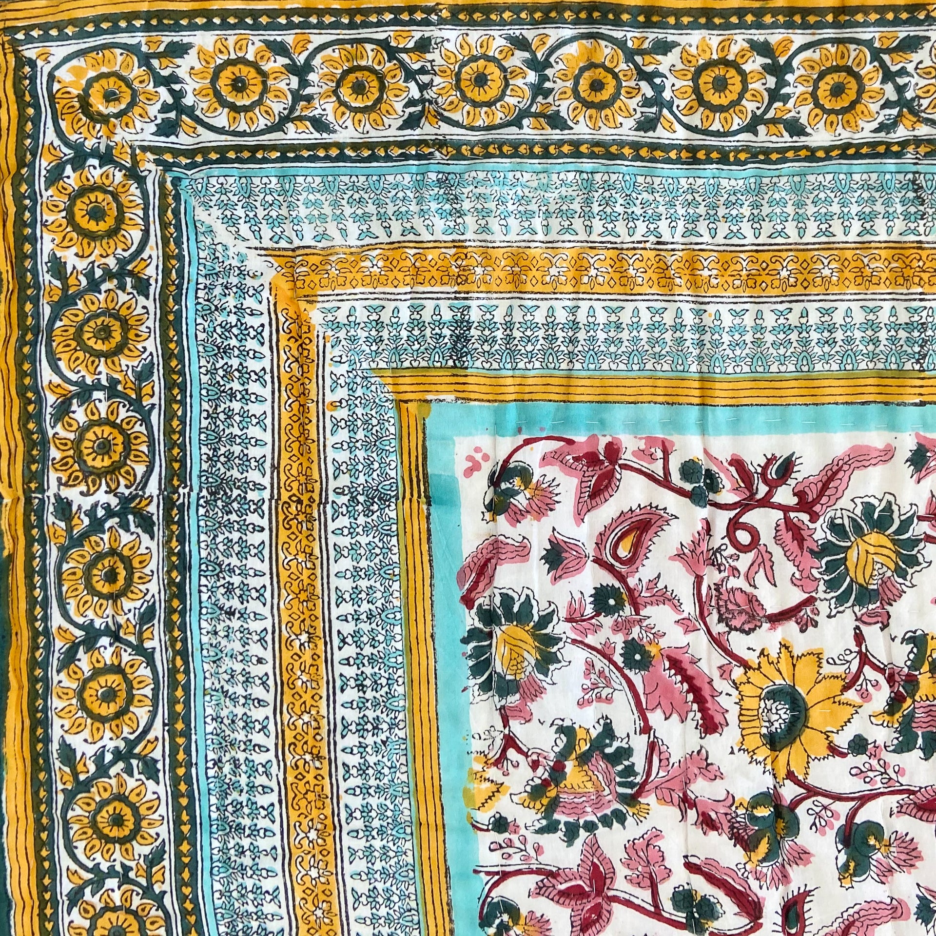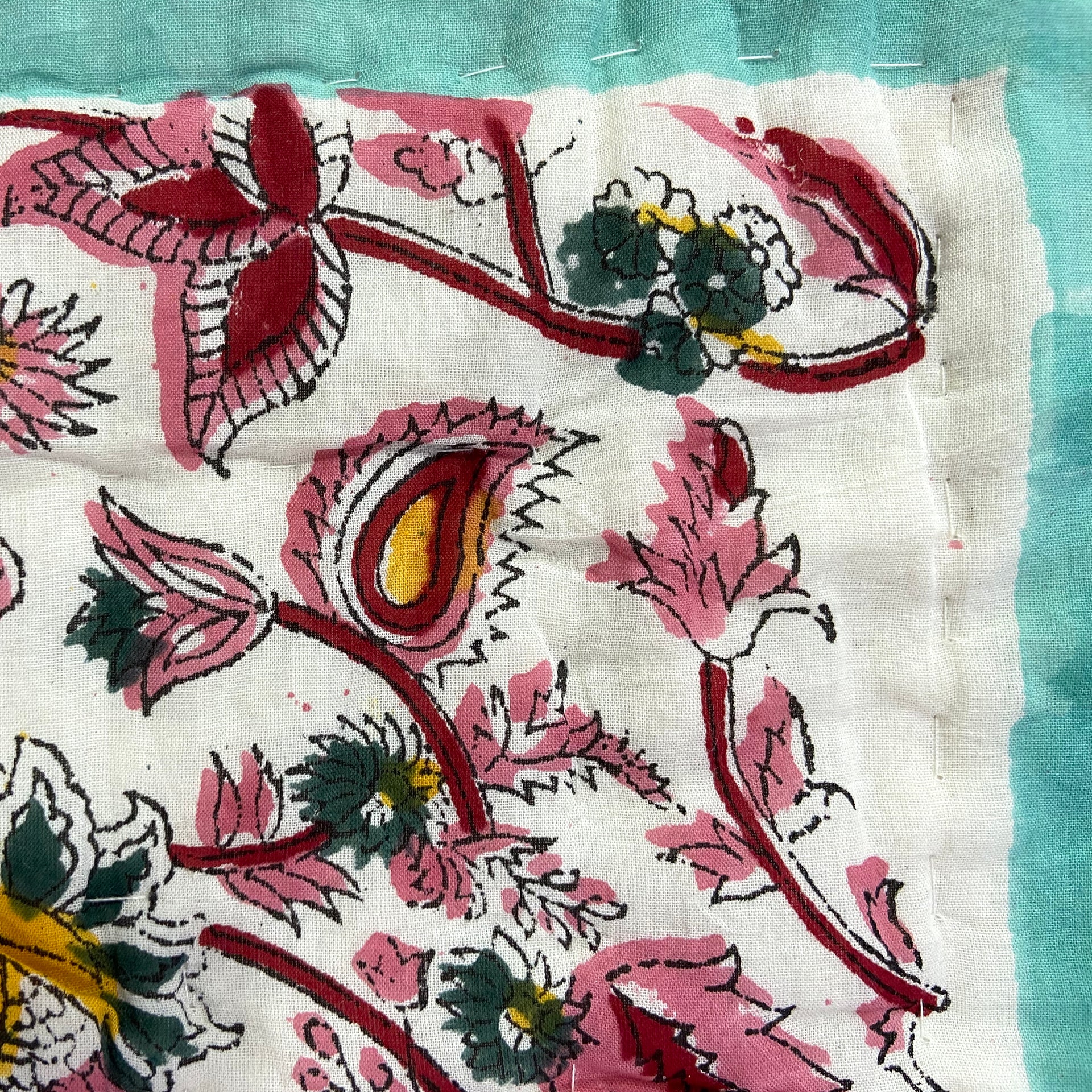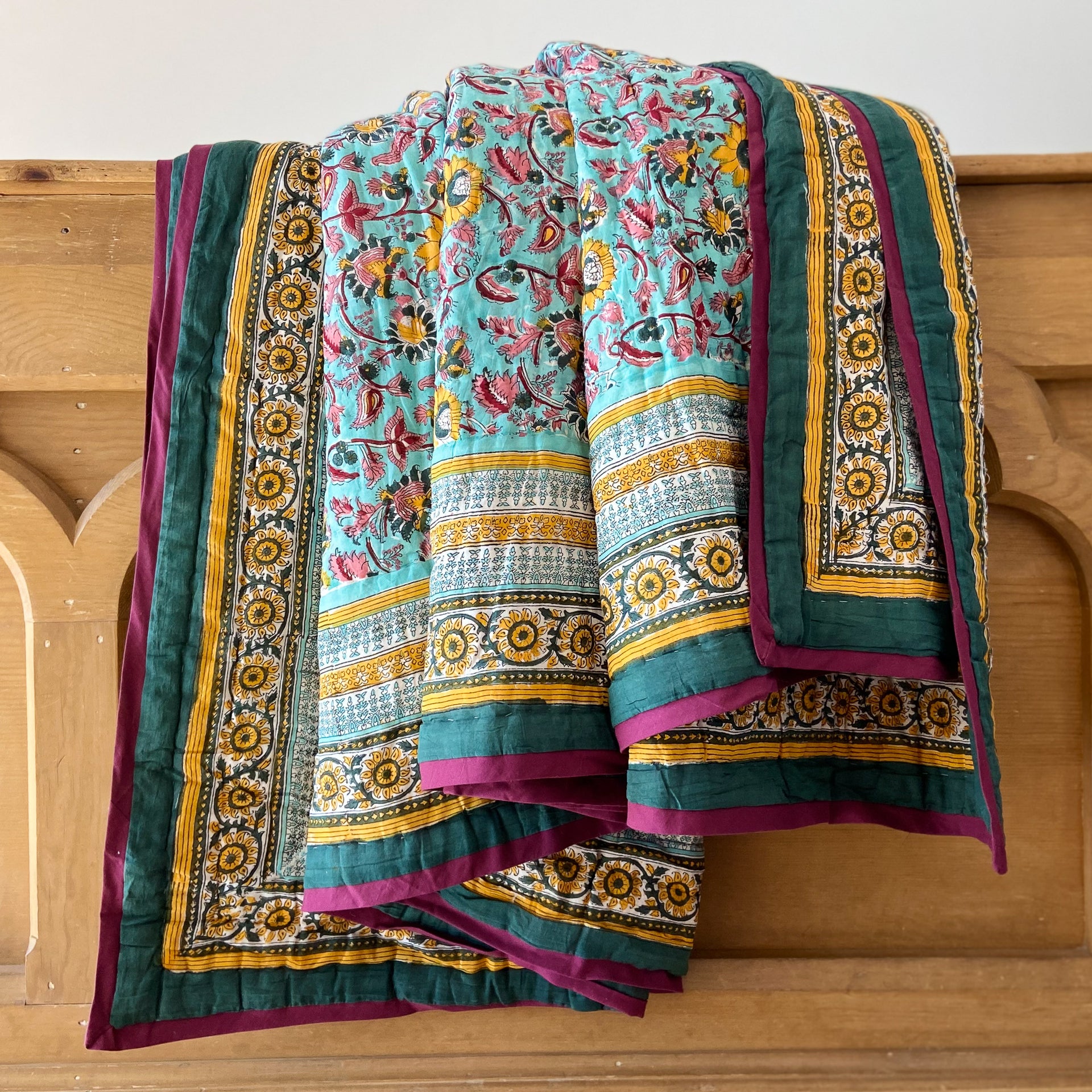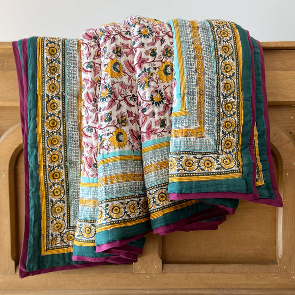 This lovely quilt features floral designs on both sides. A riot of colour in pink, yellow, jade, and green with a jade background on one side and white background on the reverse. Both sides have a deep decorative border. Beautiful...View more