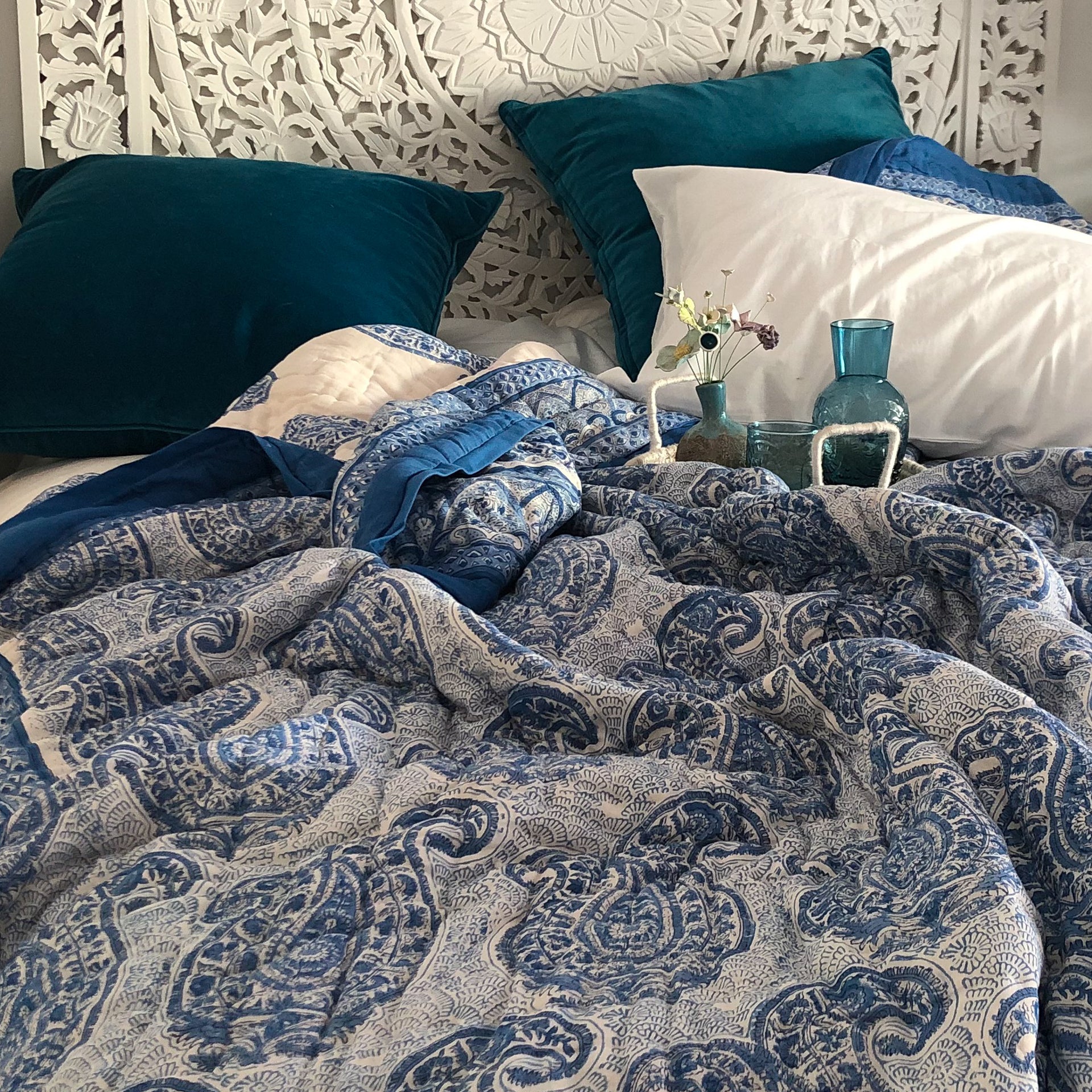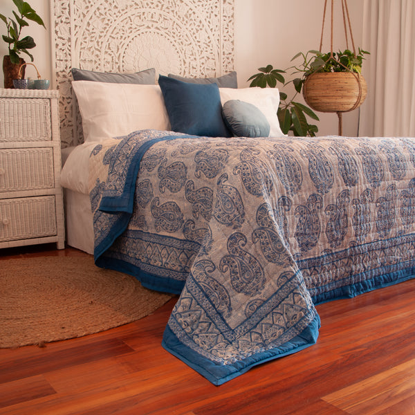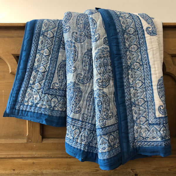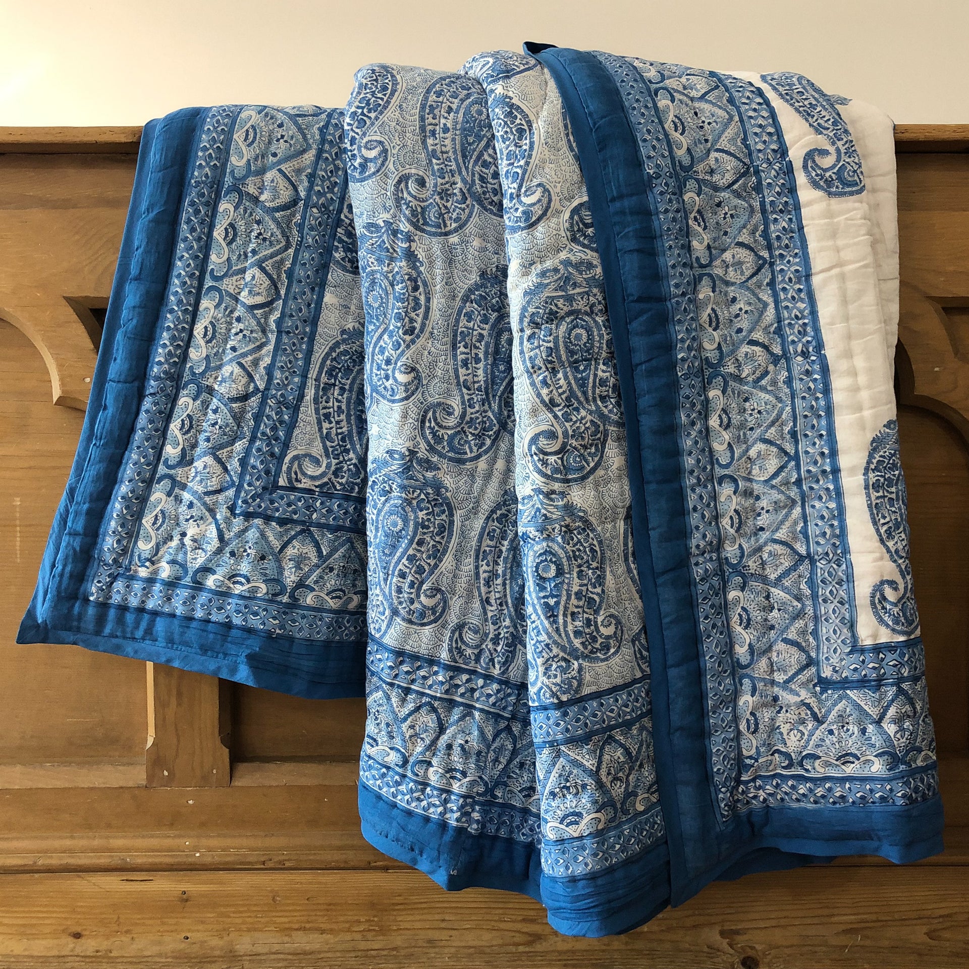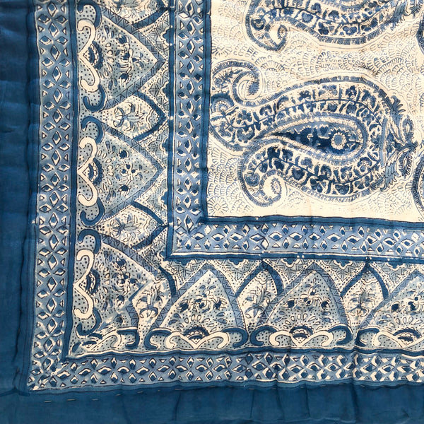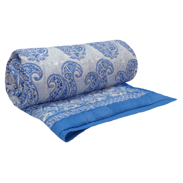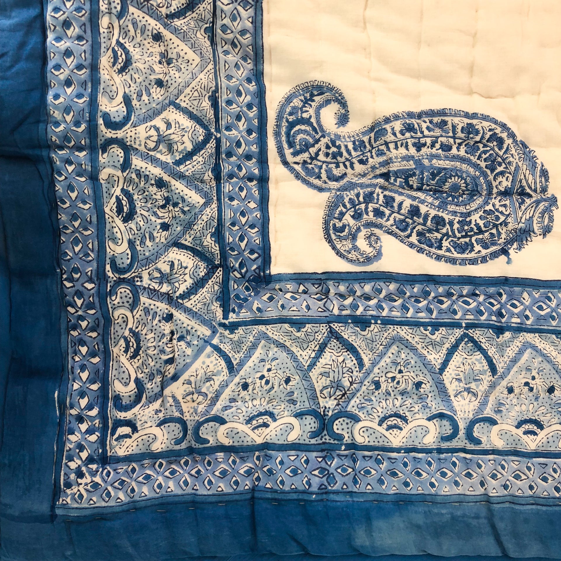 You'll have a snuggly night's sleep under this pretty Indian bed cover in soft Hamptons blue featuring a contemporary paisley design.  It has an intricate border on both sides showing delicate blue and white lotus shapes and the reverse is predominately white with...View more