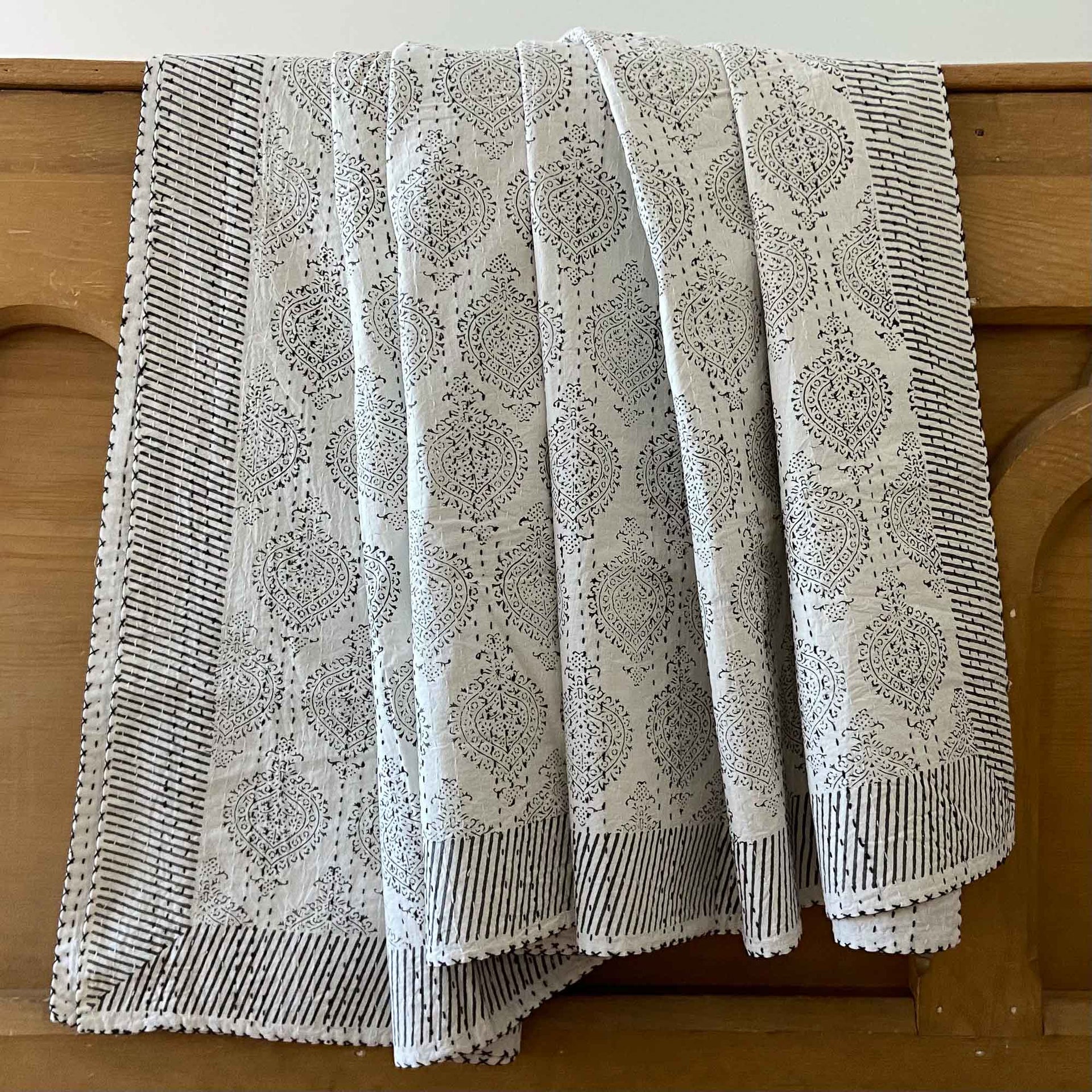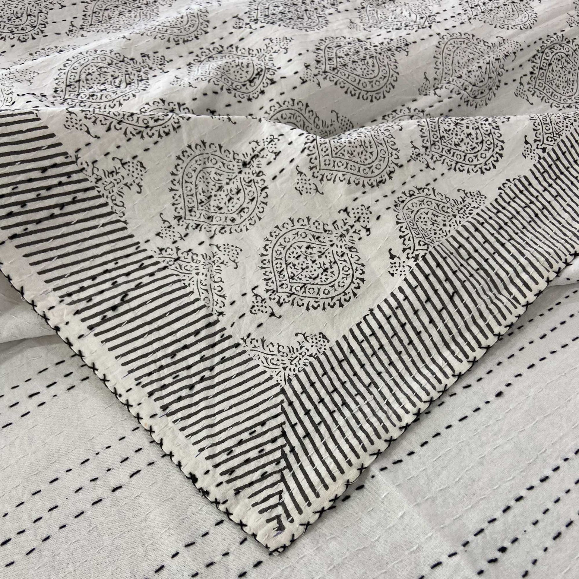 Hand Block Printed Queen Kantha quilt in Smoky Black