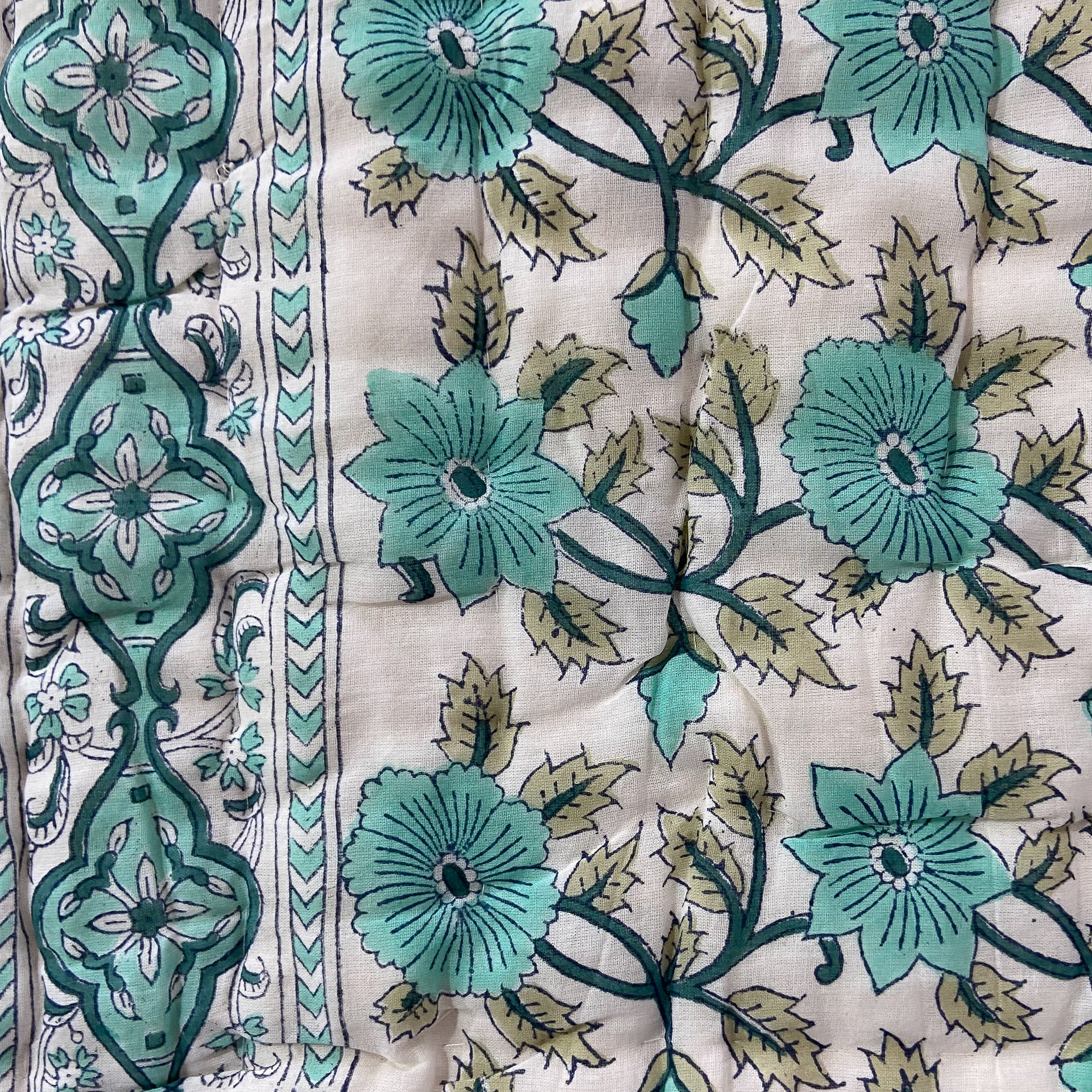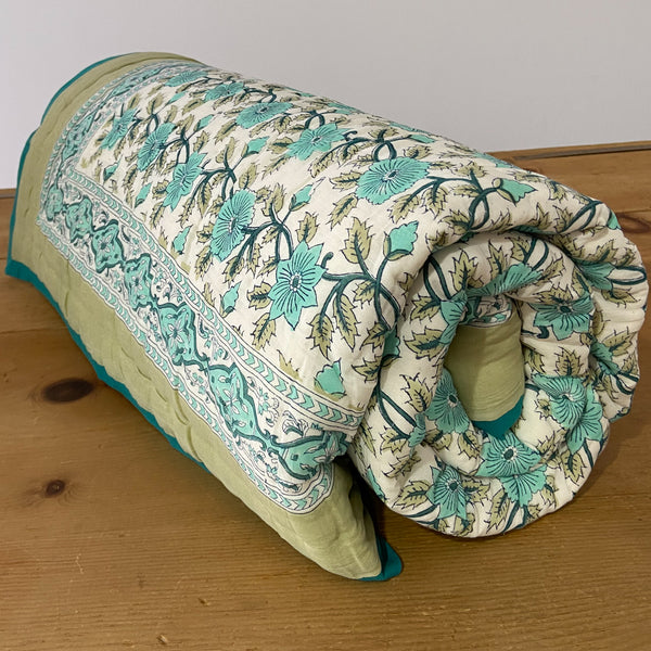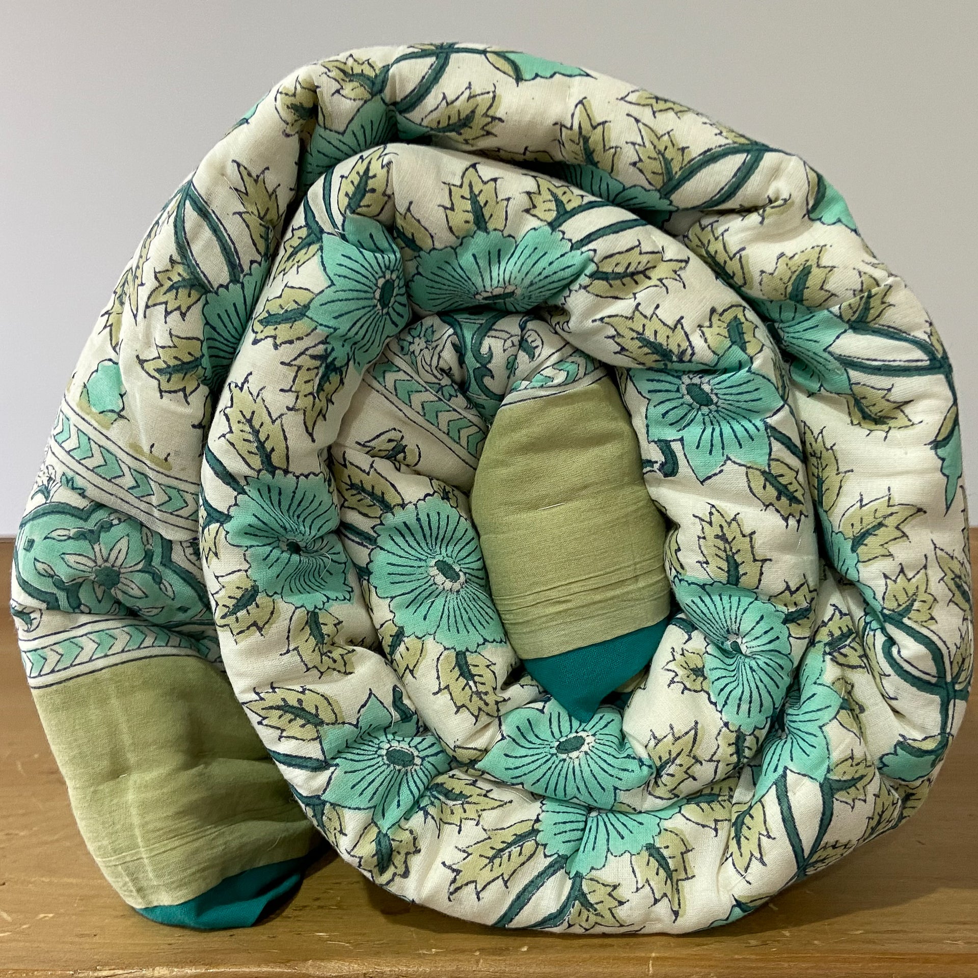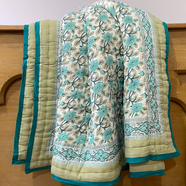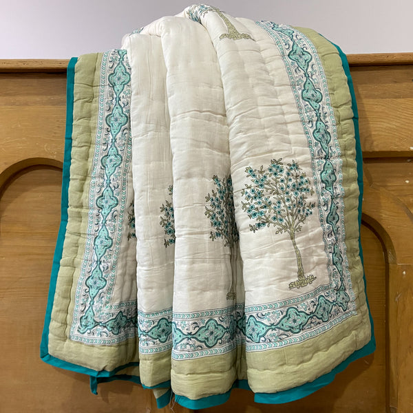 Pretty fresh soft, cotton-filled, reversible quilt in soft shades of aqua and green. Both sides have a white background, one with a contemporary floral design and the reverse with a pretty tree motif both framed with a delicate, narrow, complimentary...View more