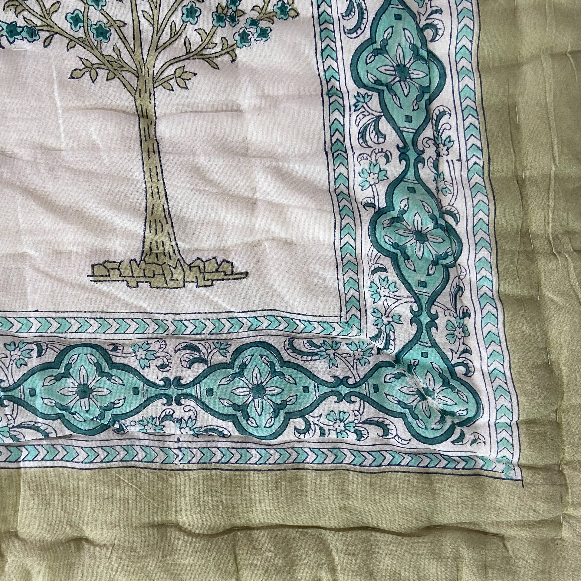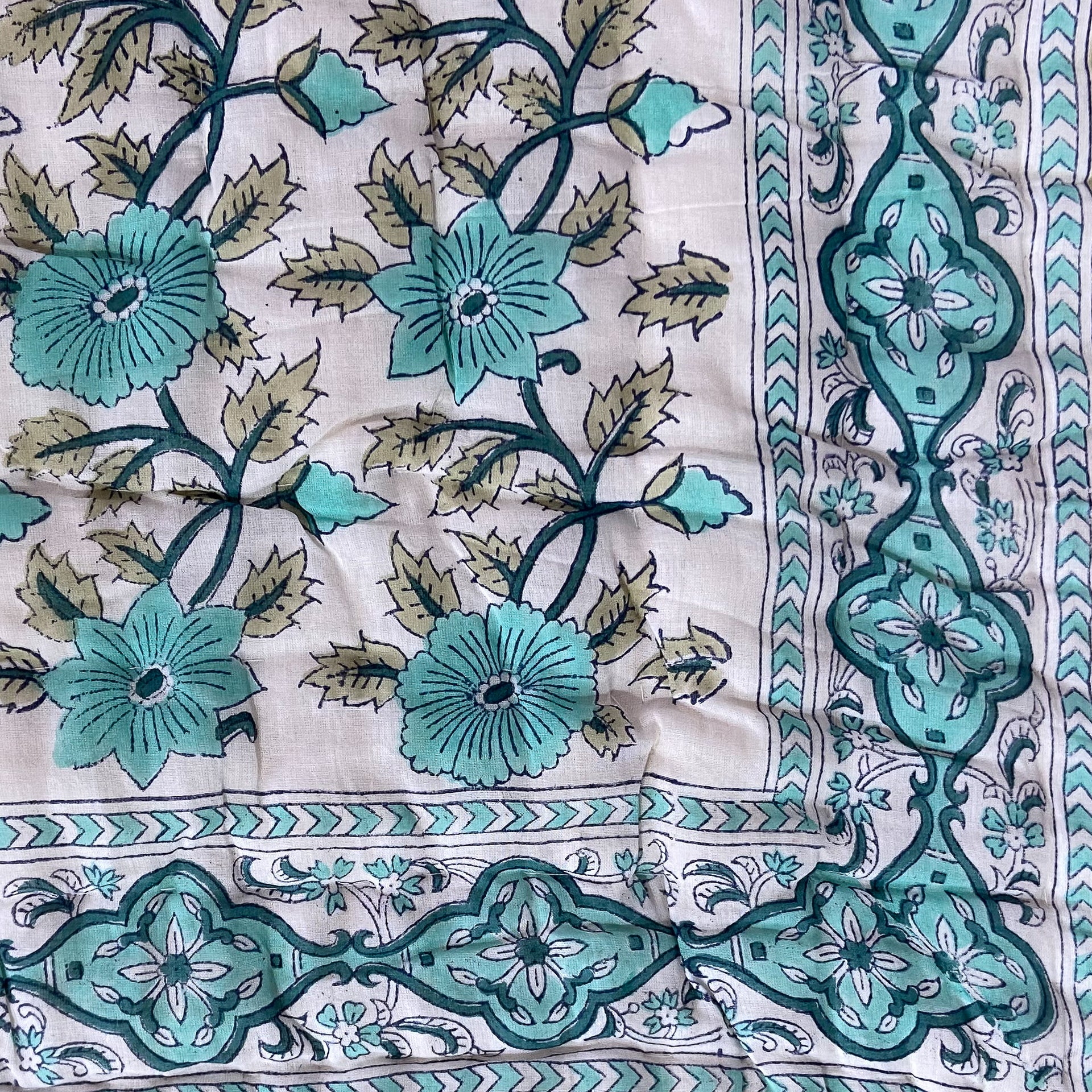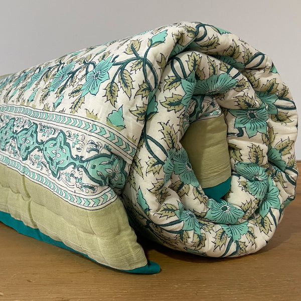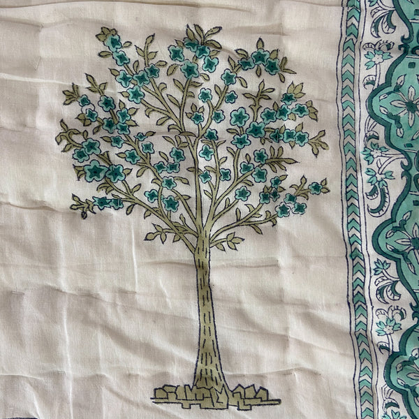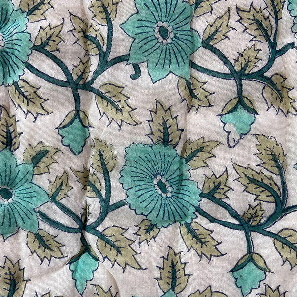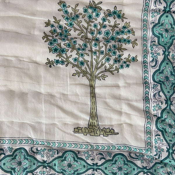 Pretty fresh soft, cotton-filled, reversible quilt in soft shades of aqua and green. Both sides have a white background, one with a contemporary floral design and the reverse with a pretty tree motif both framed with a delicate, narrow, complimentary...View more