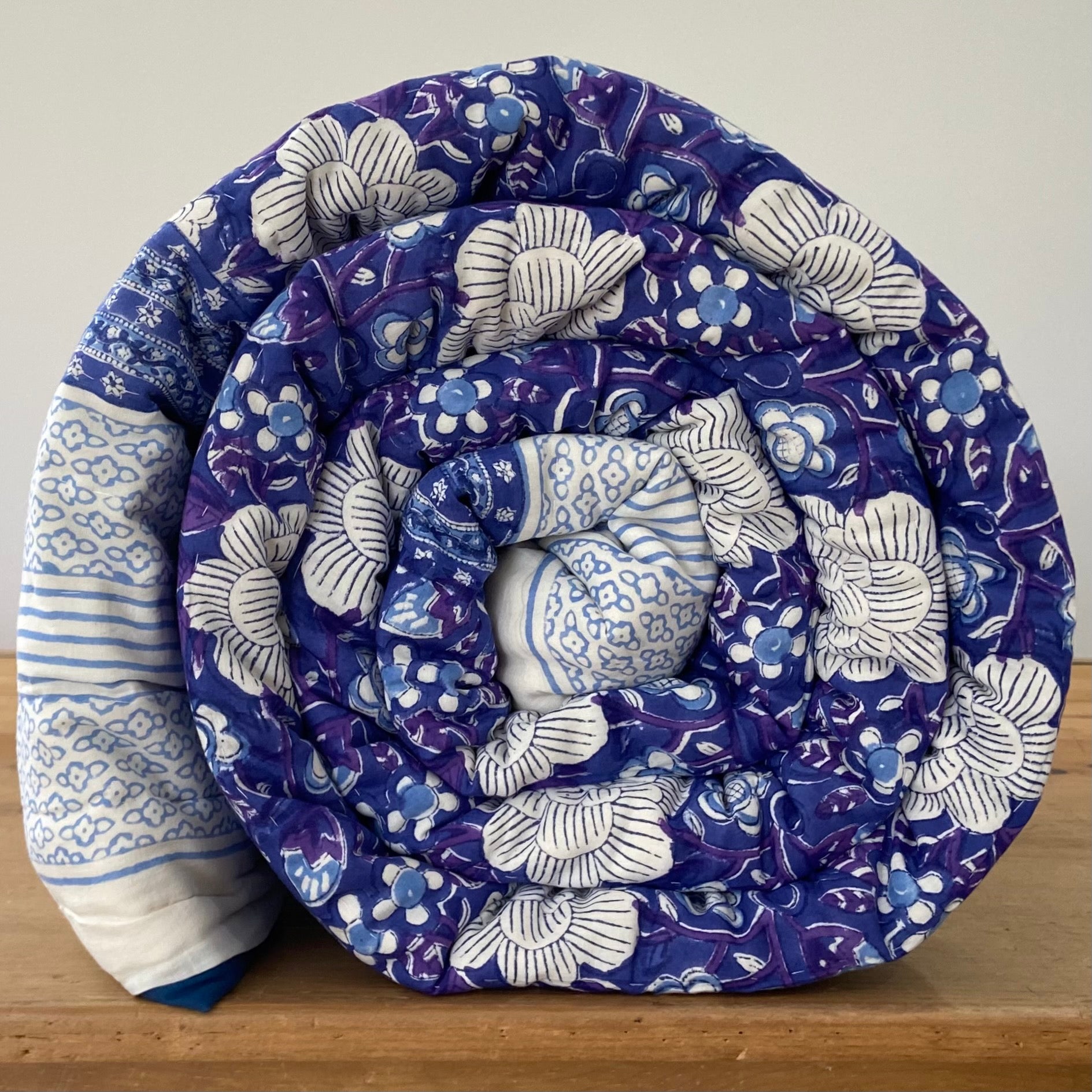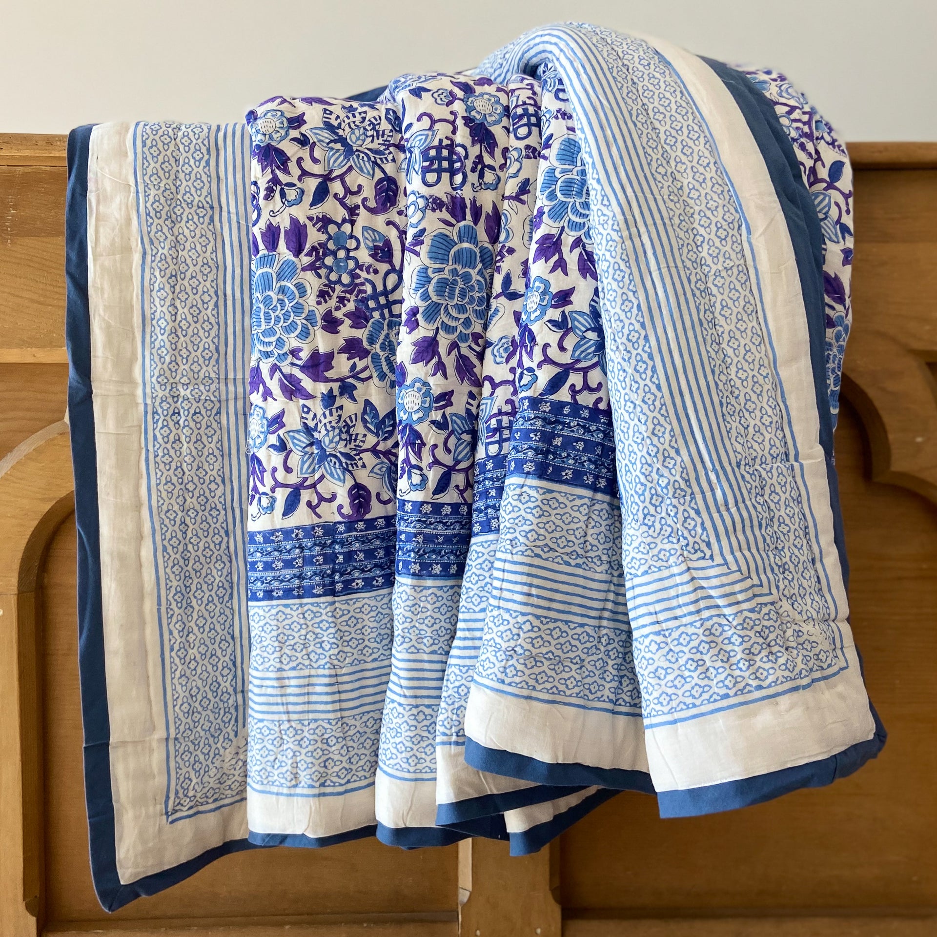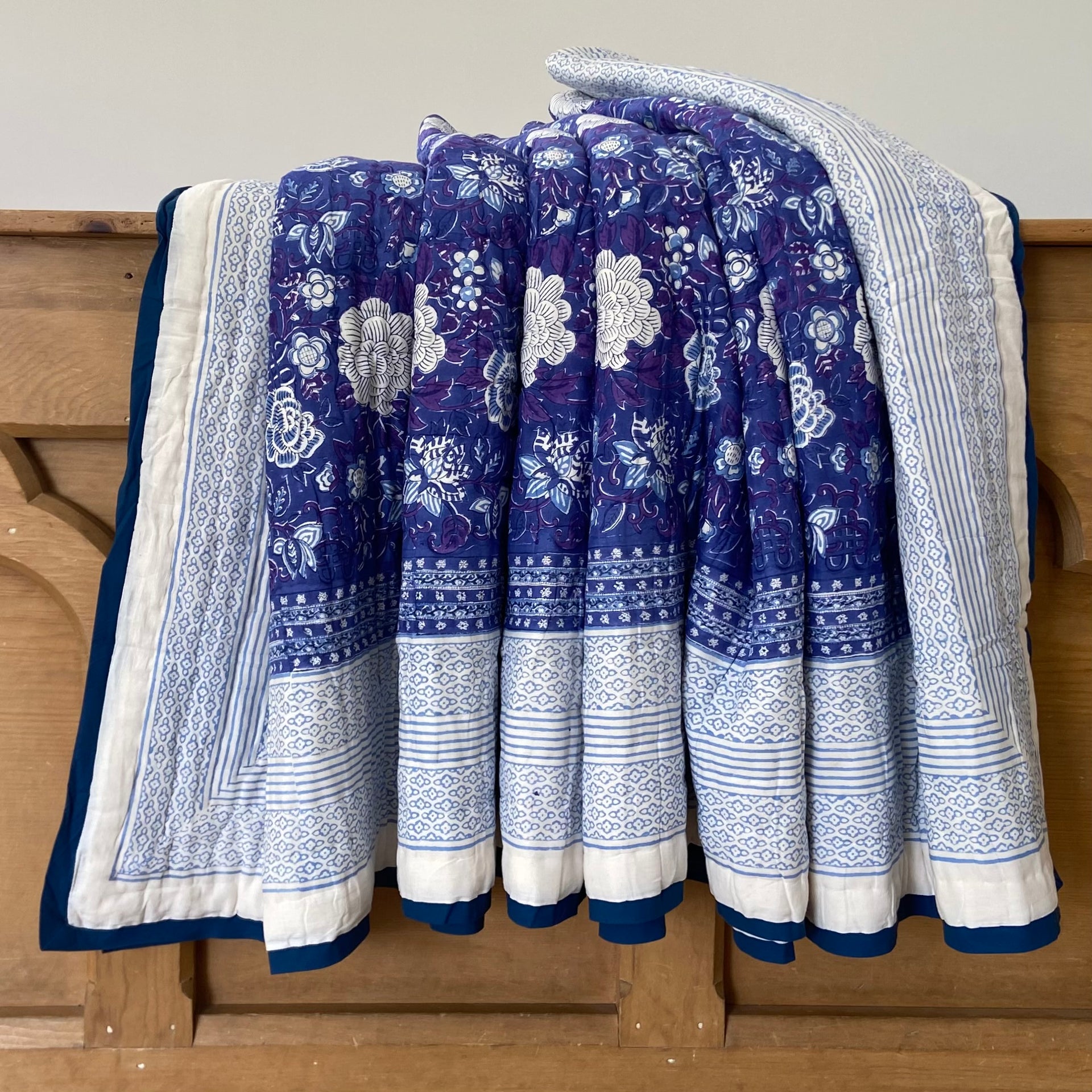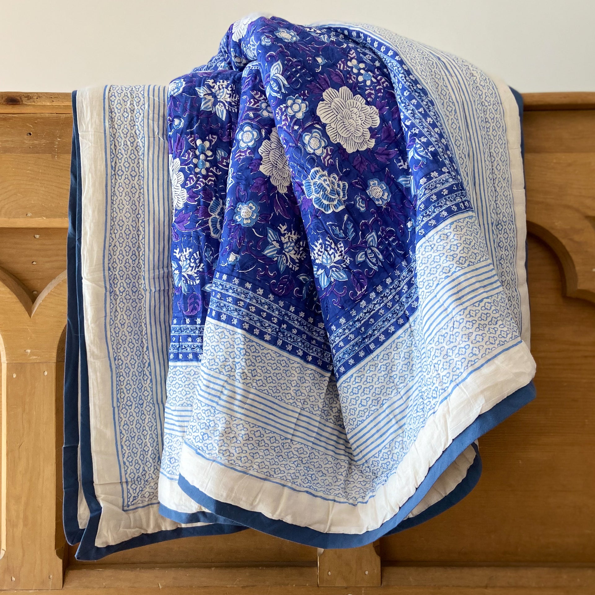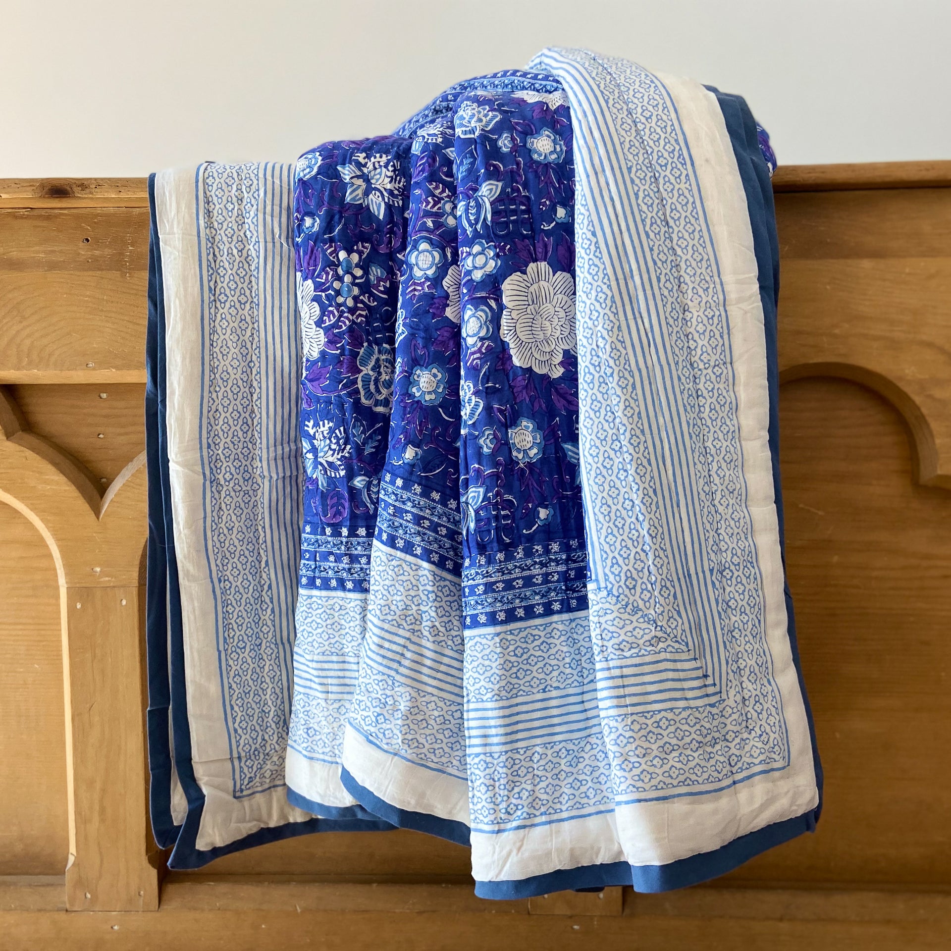 Beautiful blue hand block printed Indian Bed cover with soft cotton filling. Fair trade and eco conscious