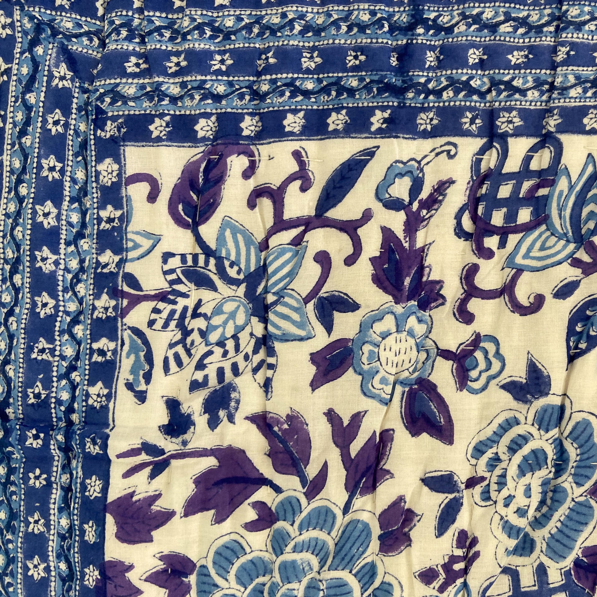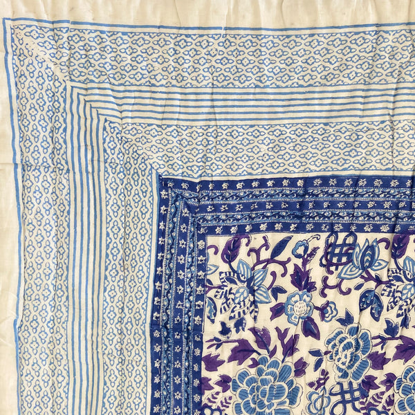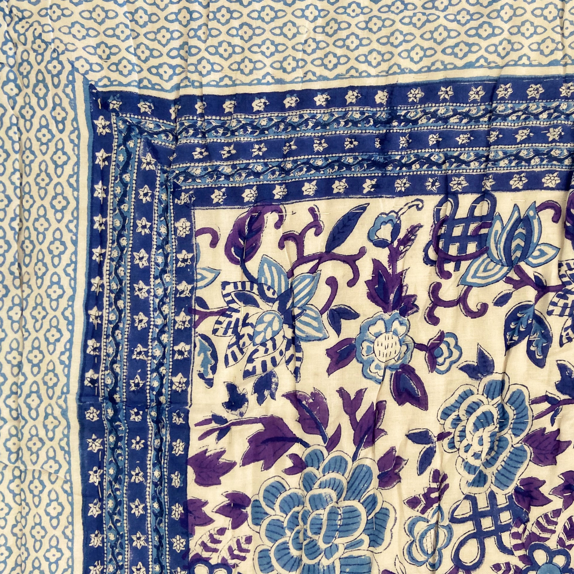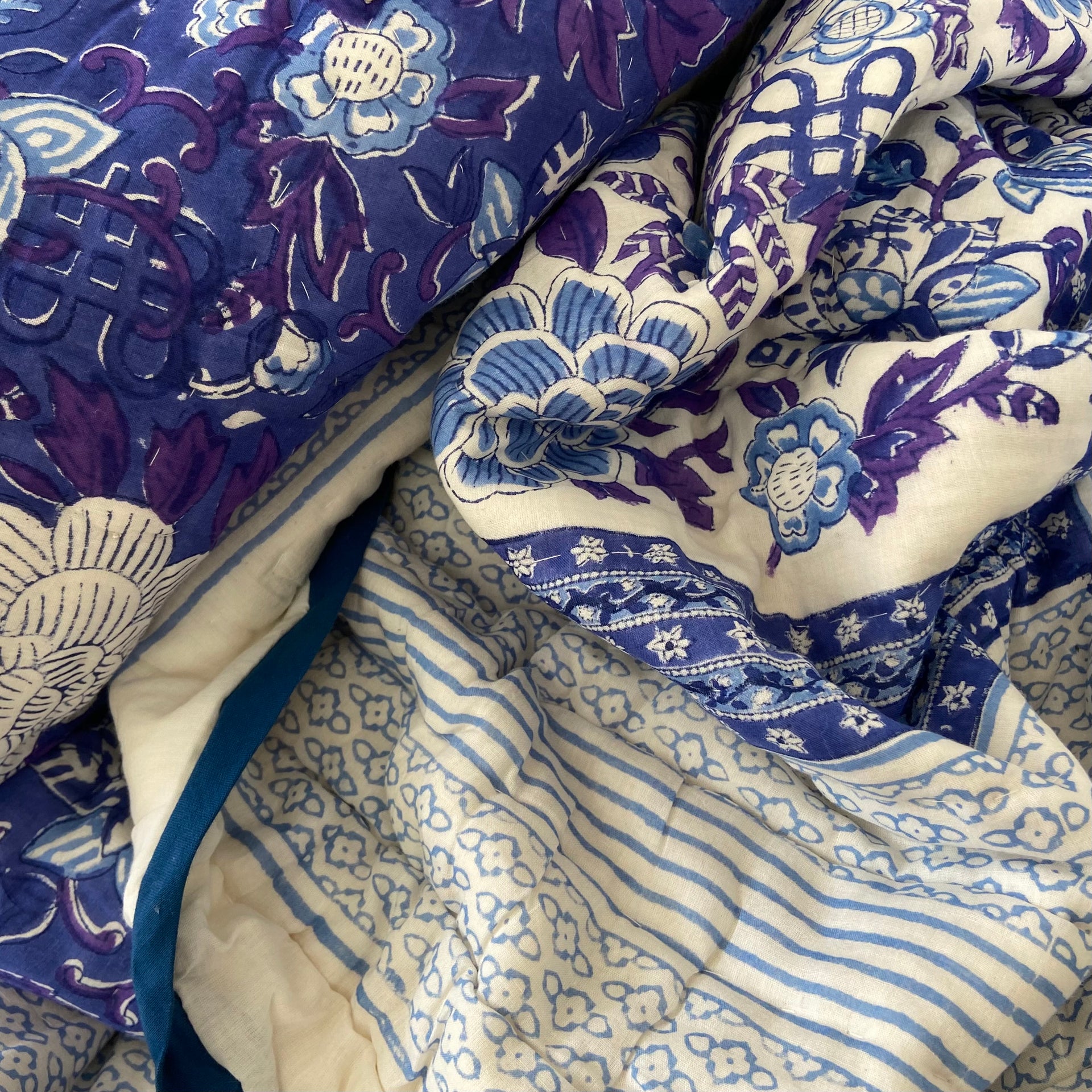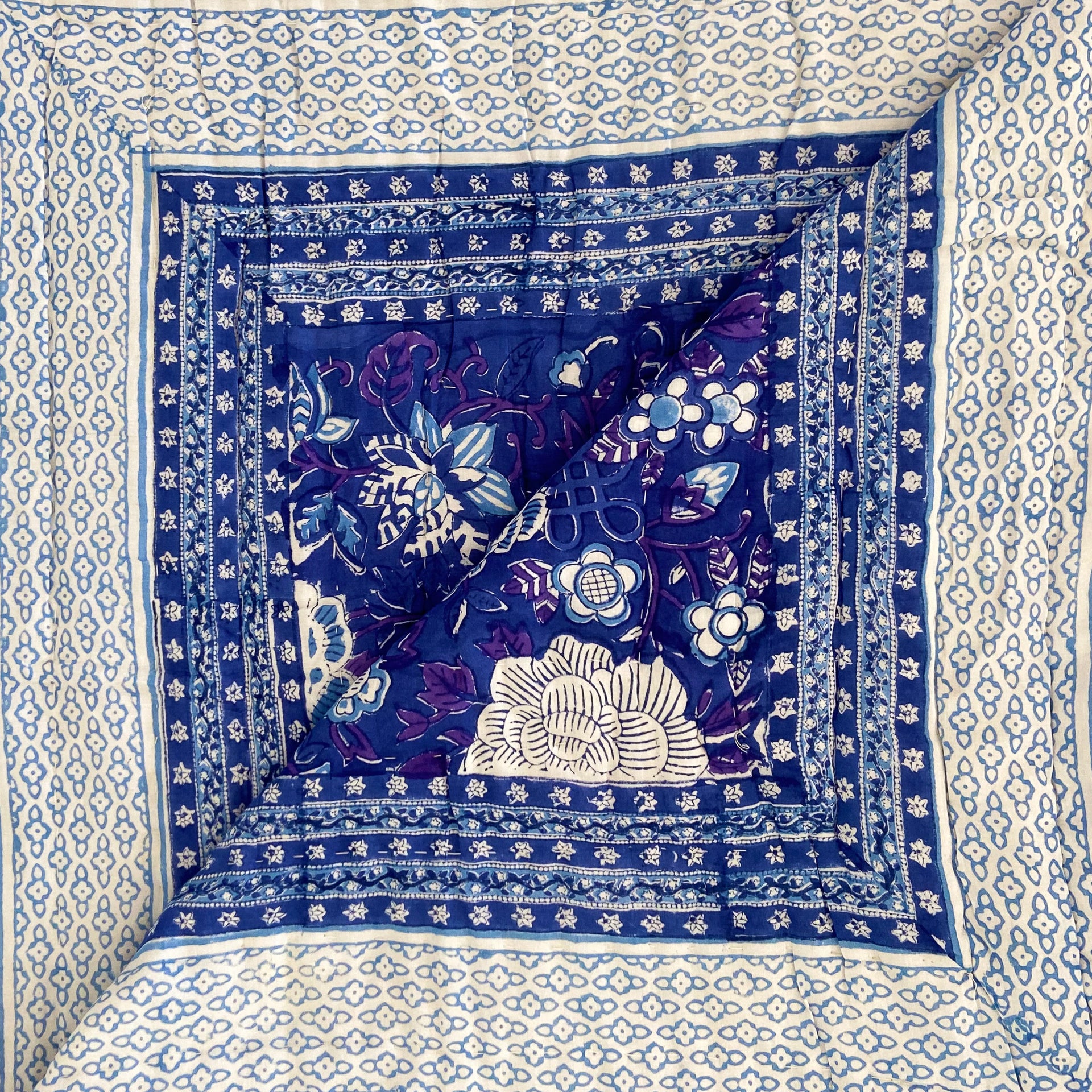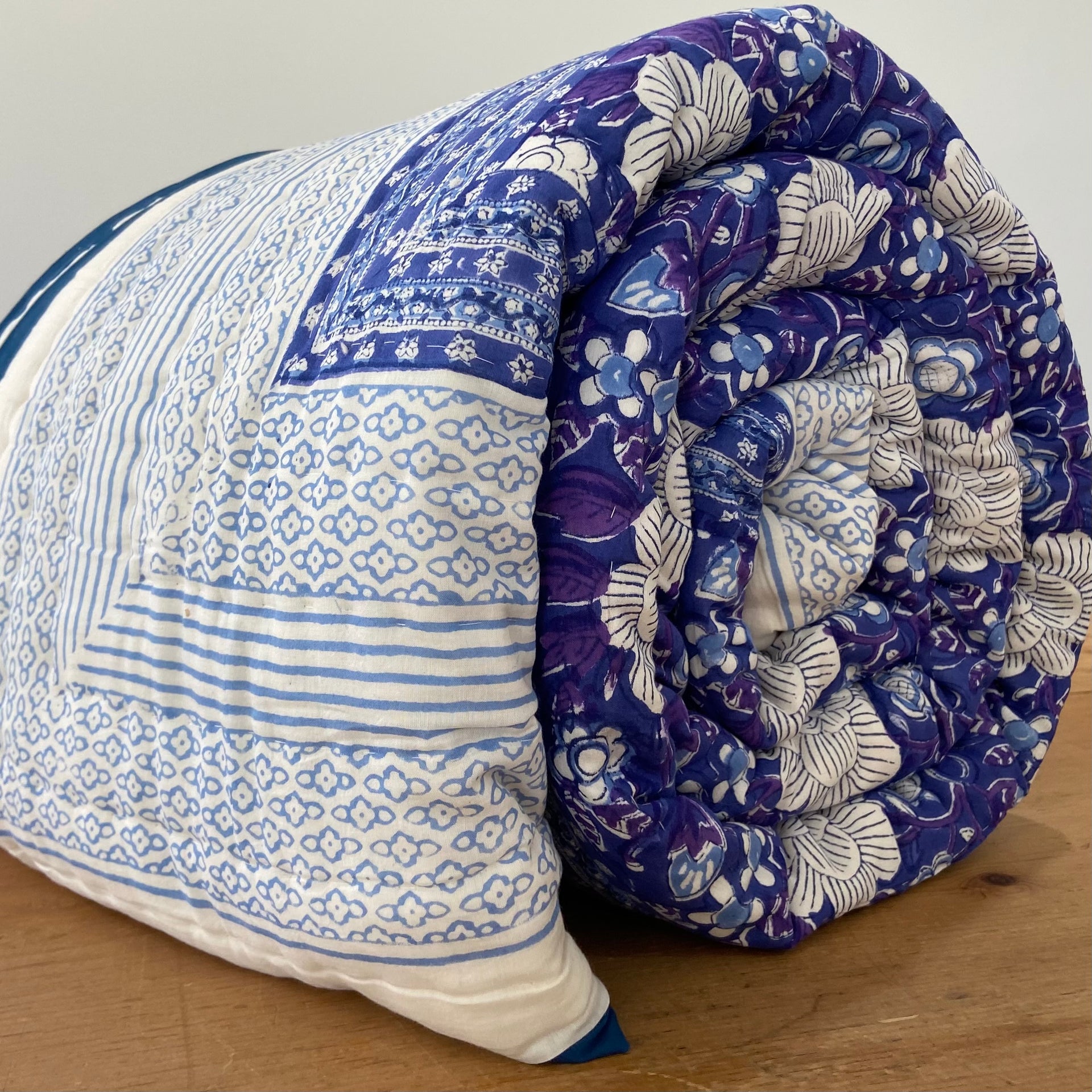 Beautiful blue hand block printed Indian Bed cover with soft cotton filling. Fair trade and eco conscious