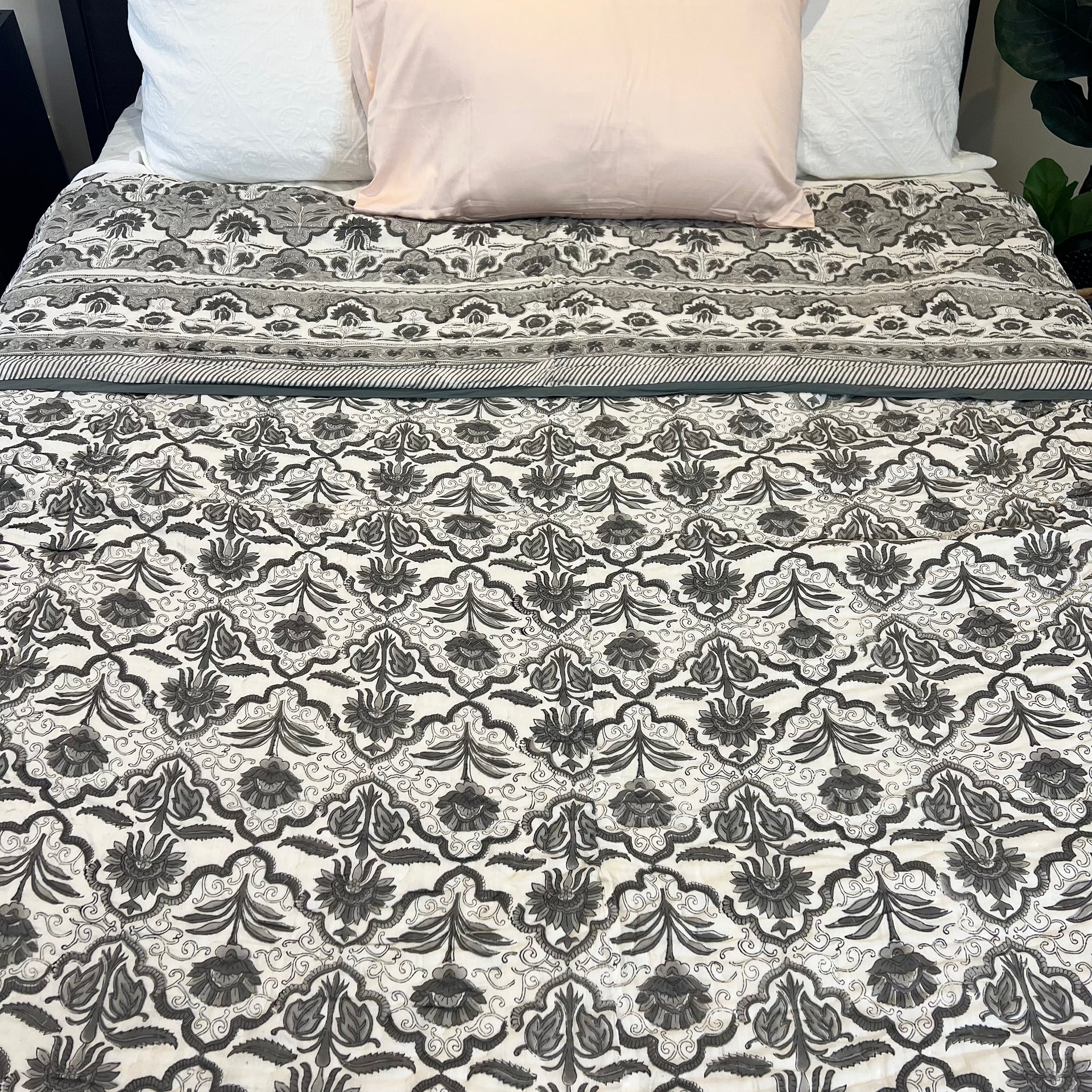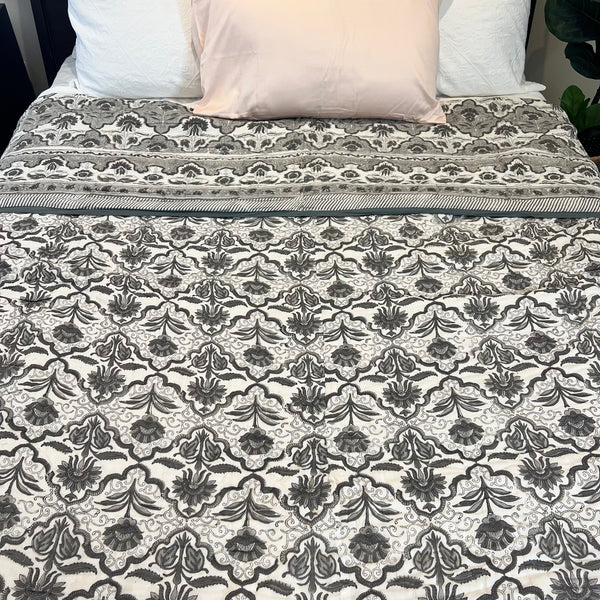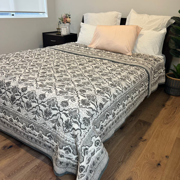 This stunning quilt features a soft  grey on a white background. Beautiful detailing and super soft lightweight 100% cotton voile. The only cover you will need in summer and perfect for an extra layer on your bed or sofa throw to...View more