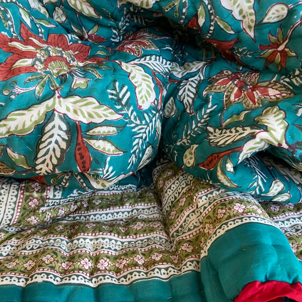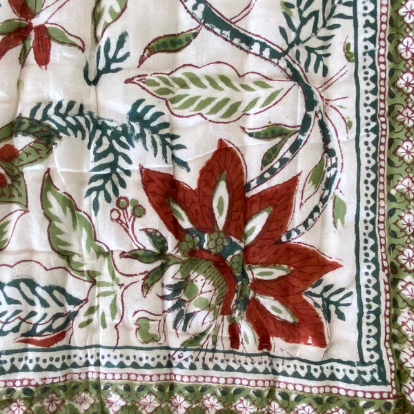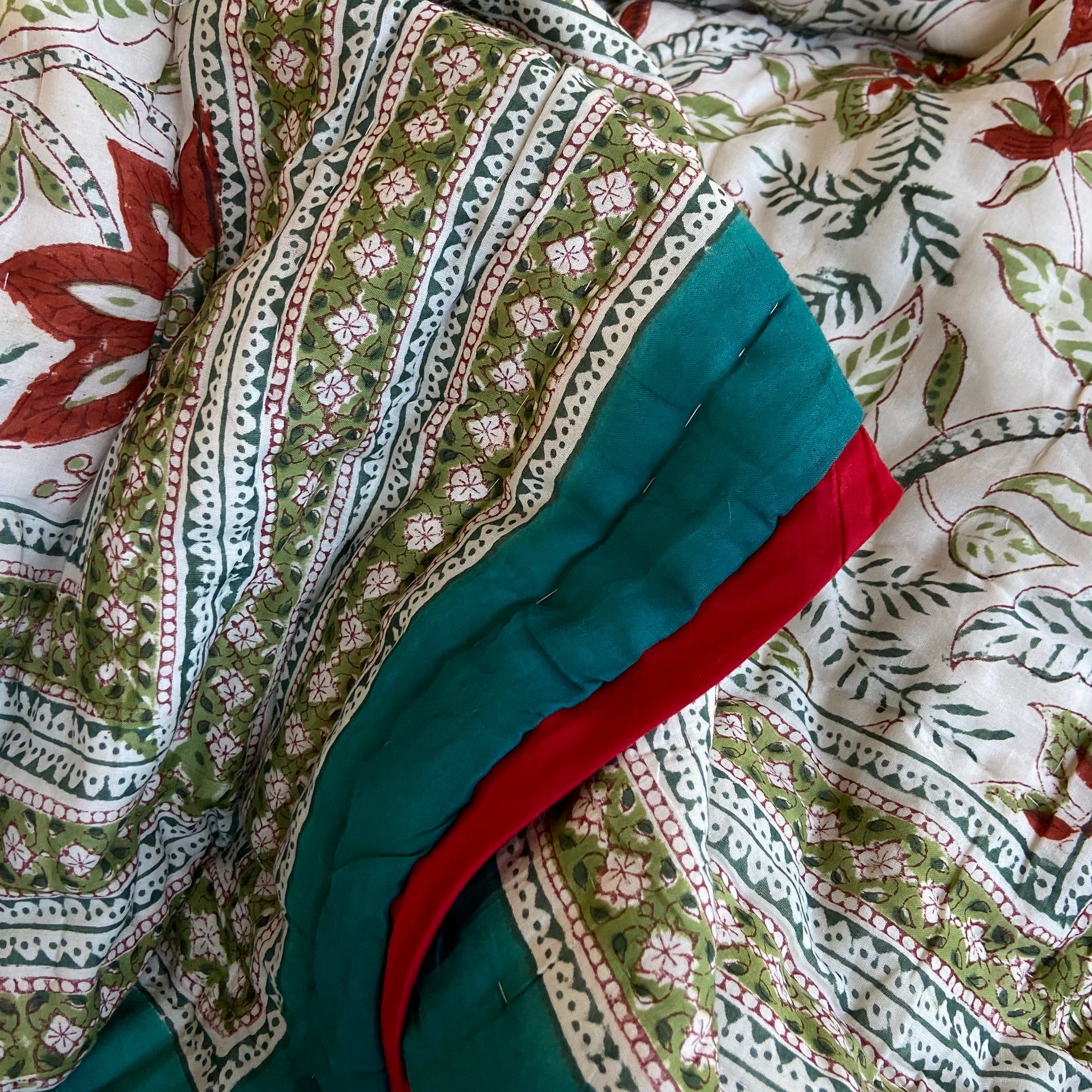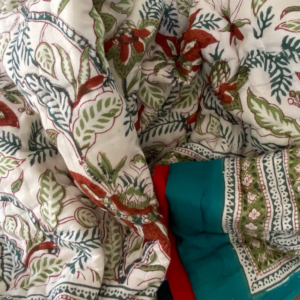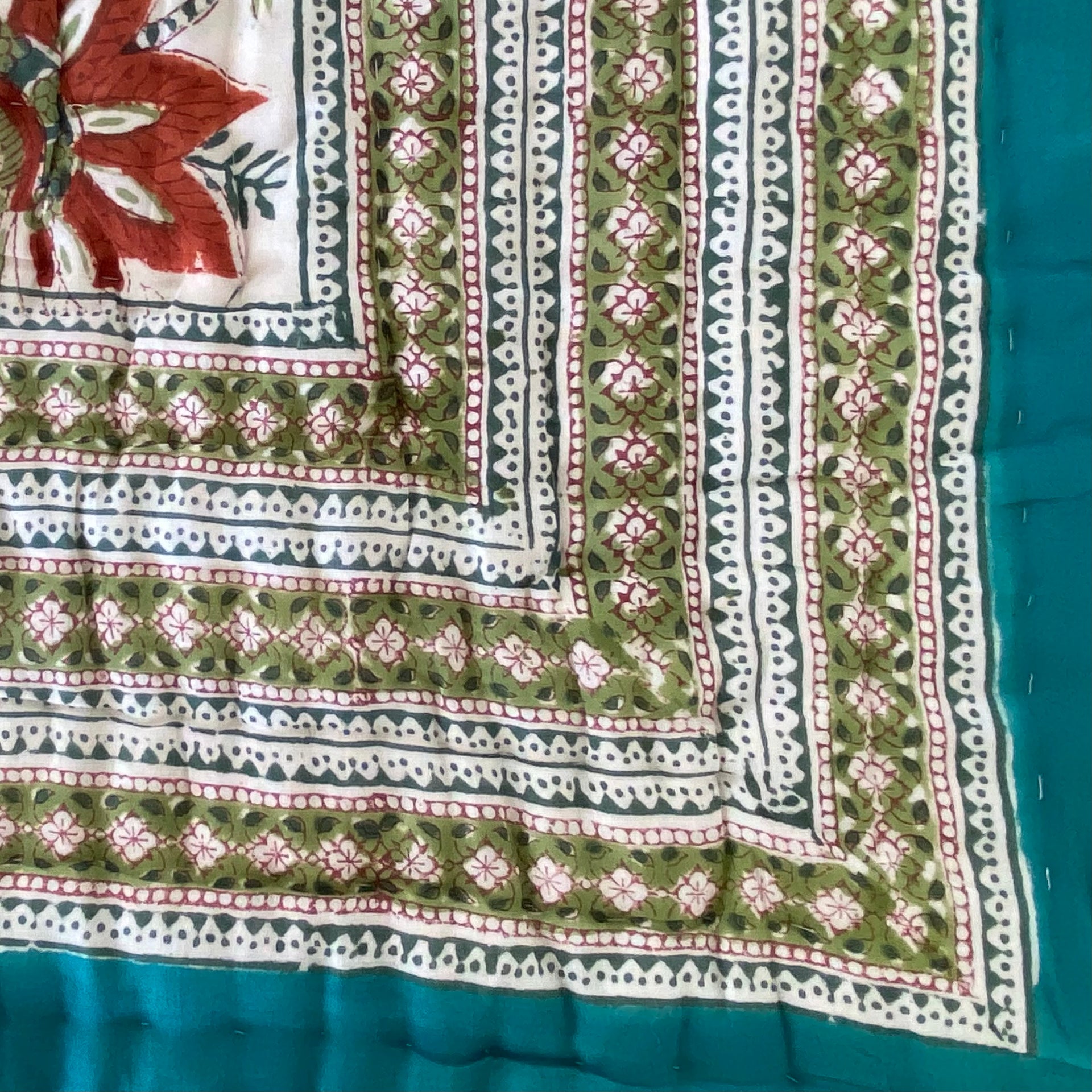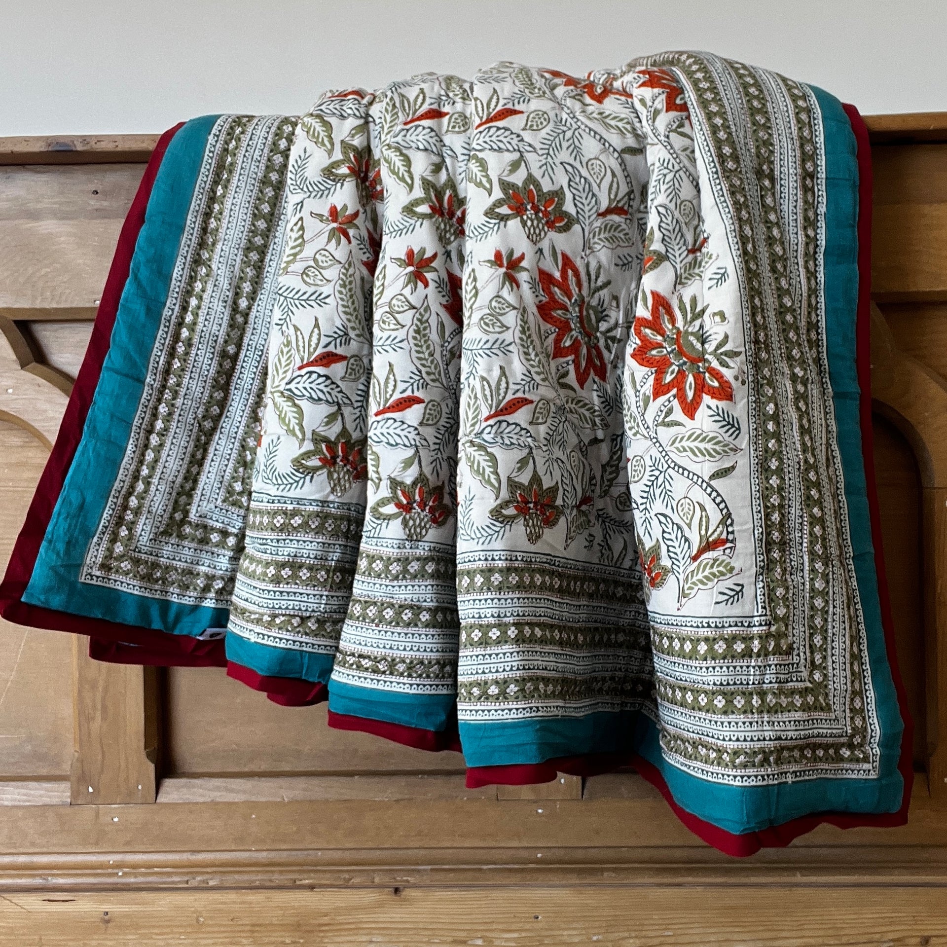 A stunning quilt in deep jade green with floral and leaf accents in orange and ochre. The reverse features the same floral and leaf accents on a white background and both sides feature a deep, striking, patterned border that highlights the central...View more