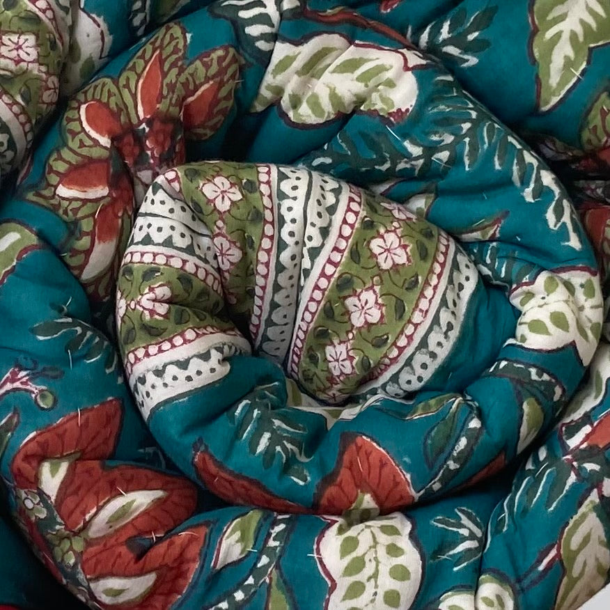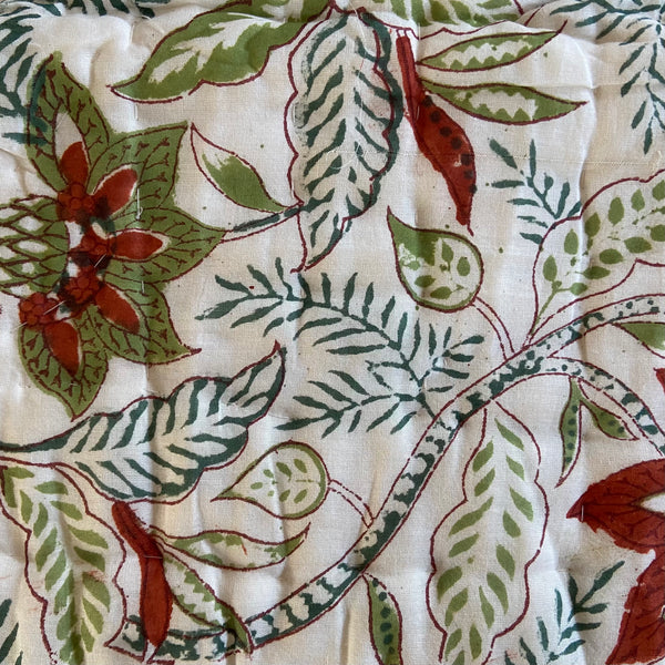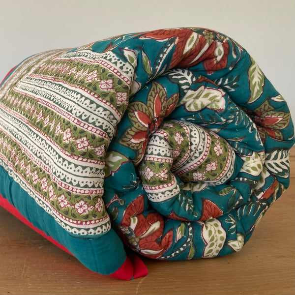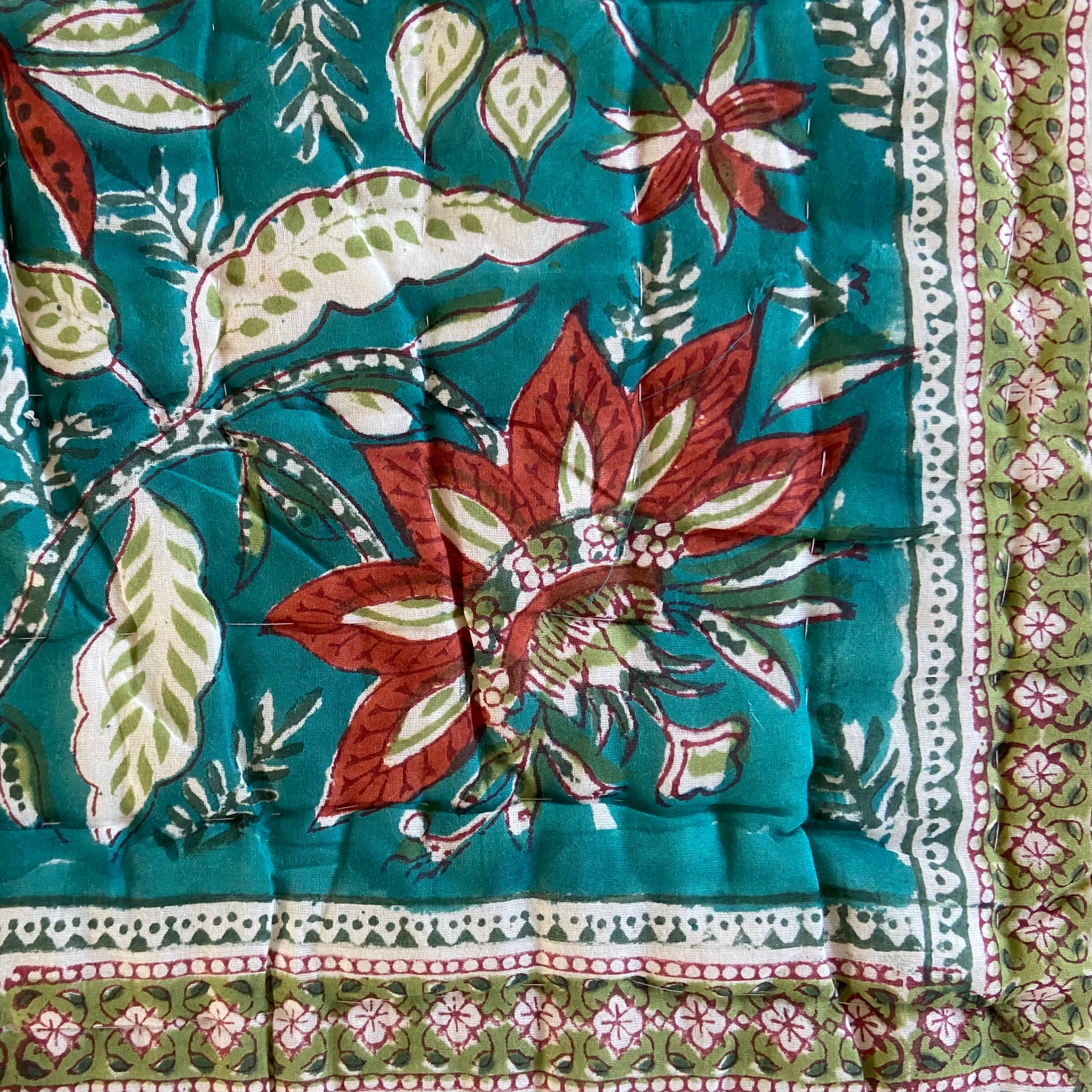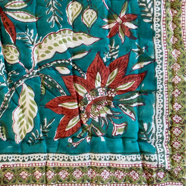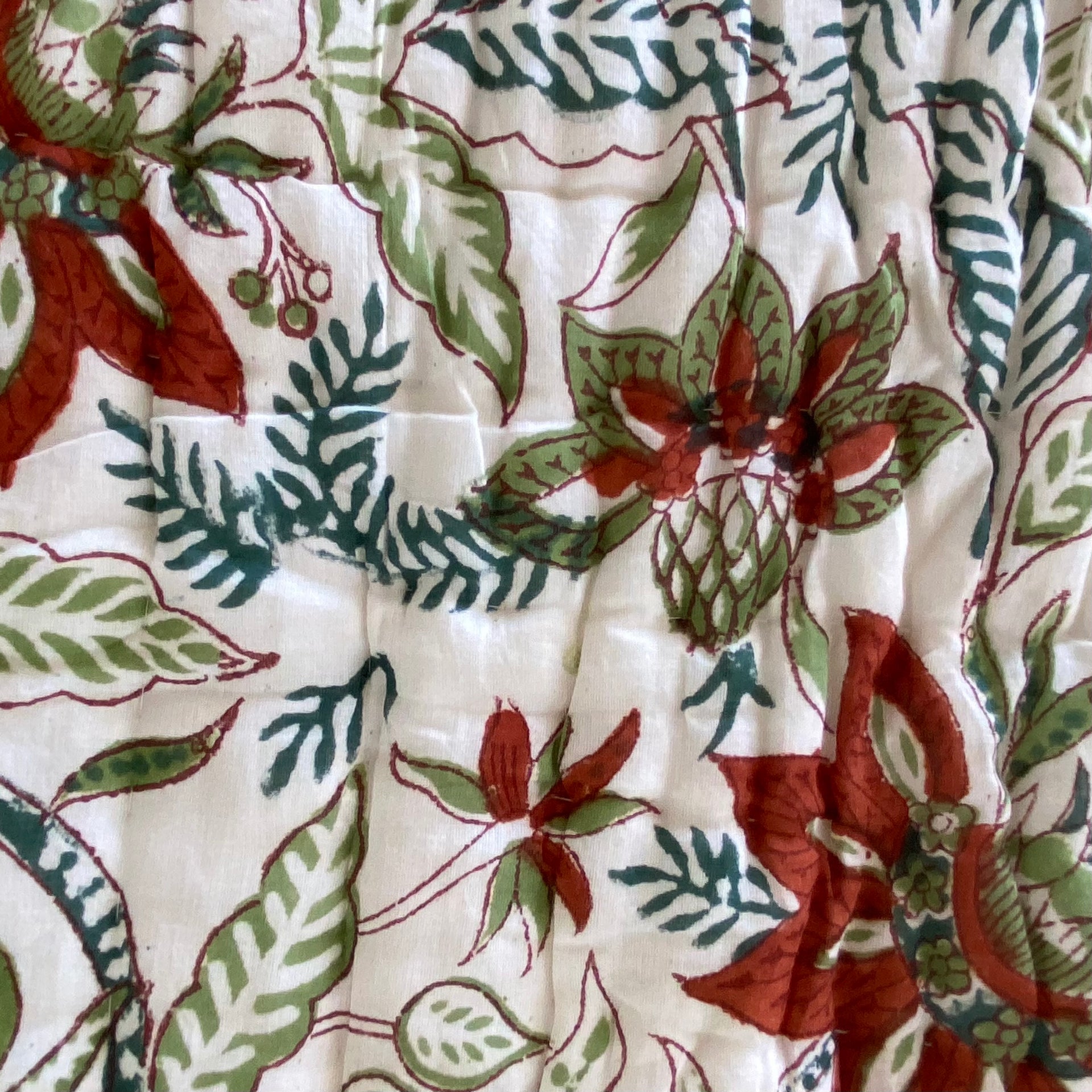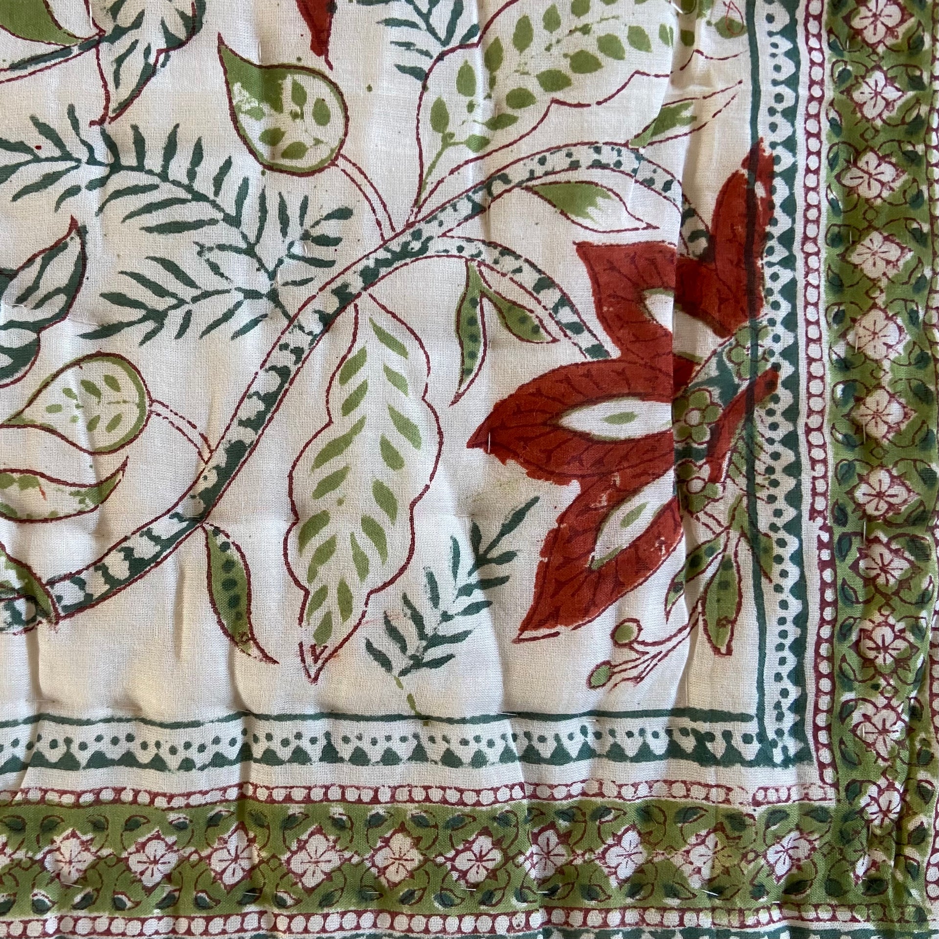 A stunning quilt in deep jade green with floral and leaf accents in orange and ochre. The reverse features the same floral and leaf accents on a white background and both sides feature a deep, striking, patterned border that highlights the central...View more