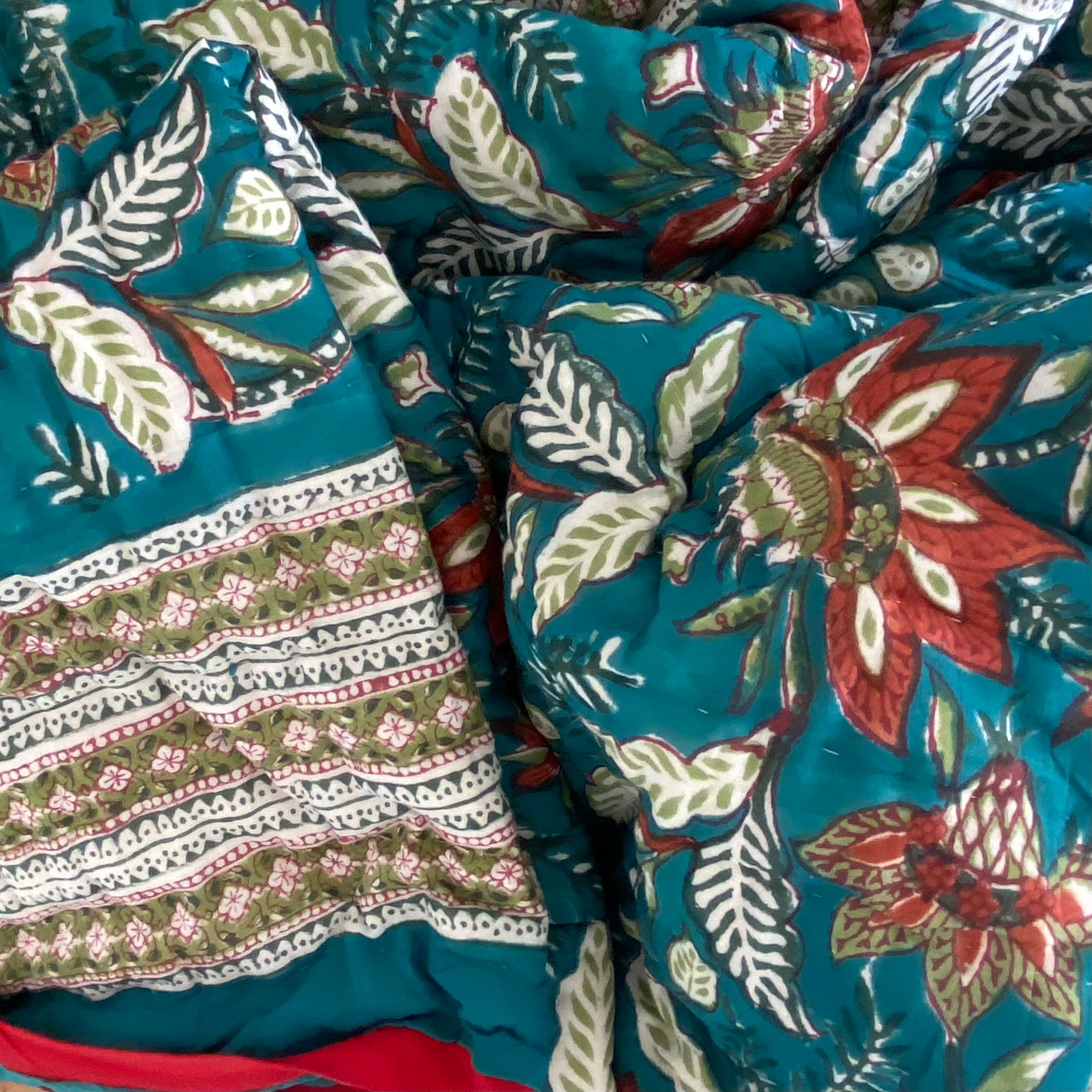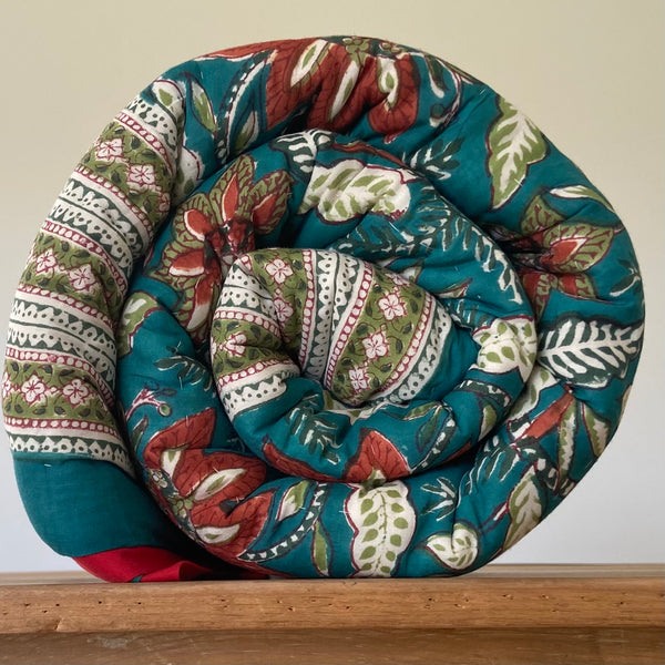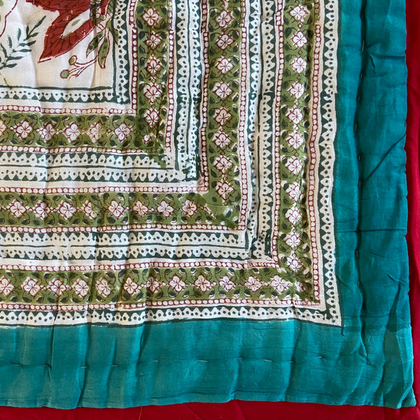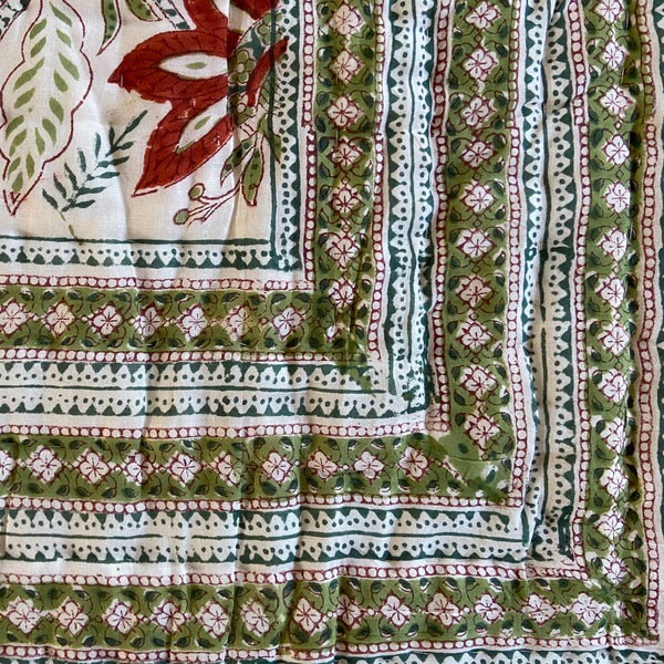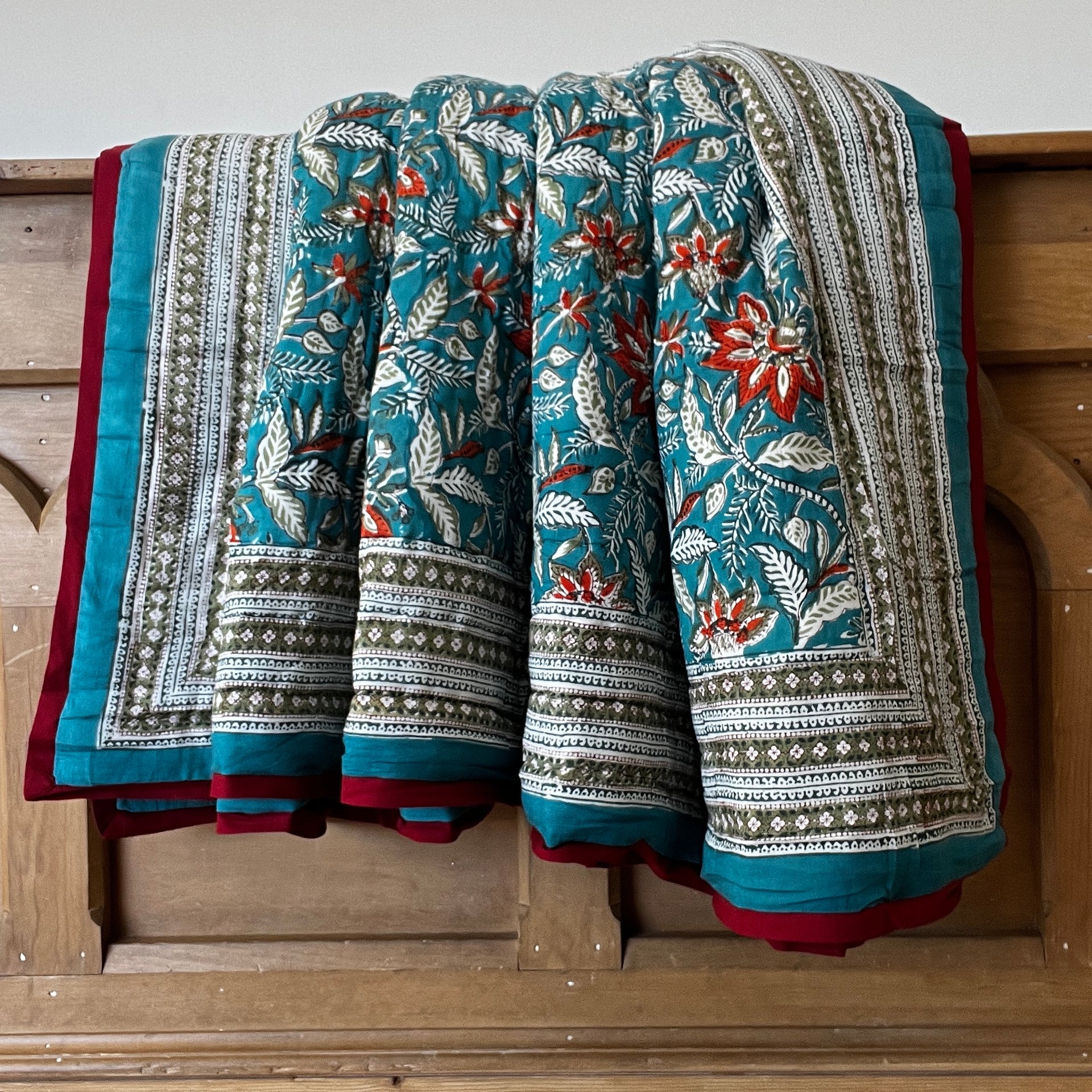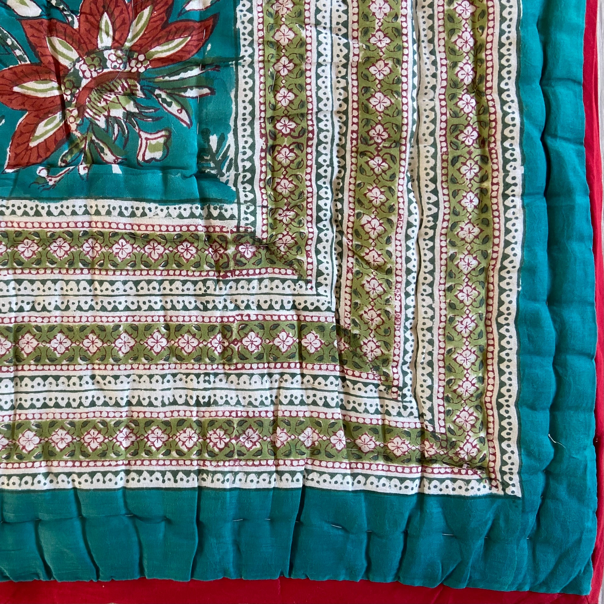 A stunning quilt in deep jade green with floral and leaf accents in orange and ochre. The reverse features the same floral and leaf accents on a white background and both sides feature a deep, striking, patterned border that highlights the central...View more