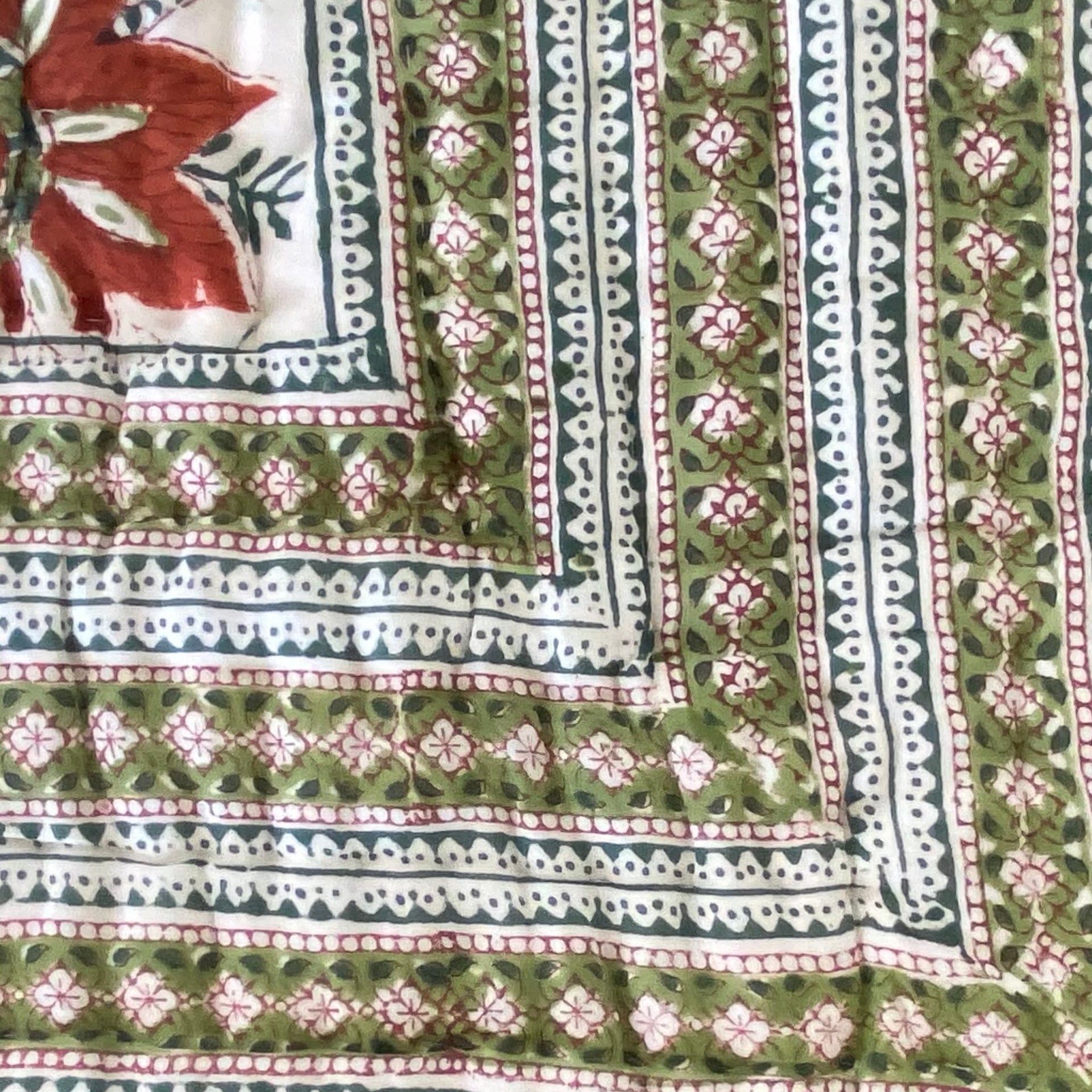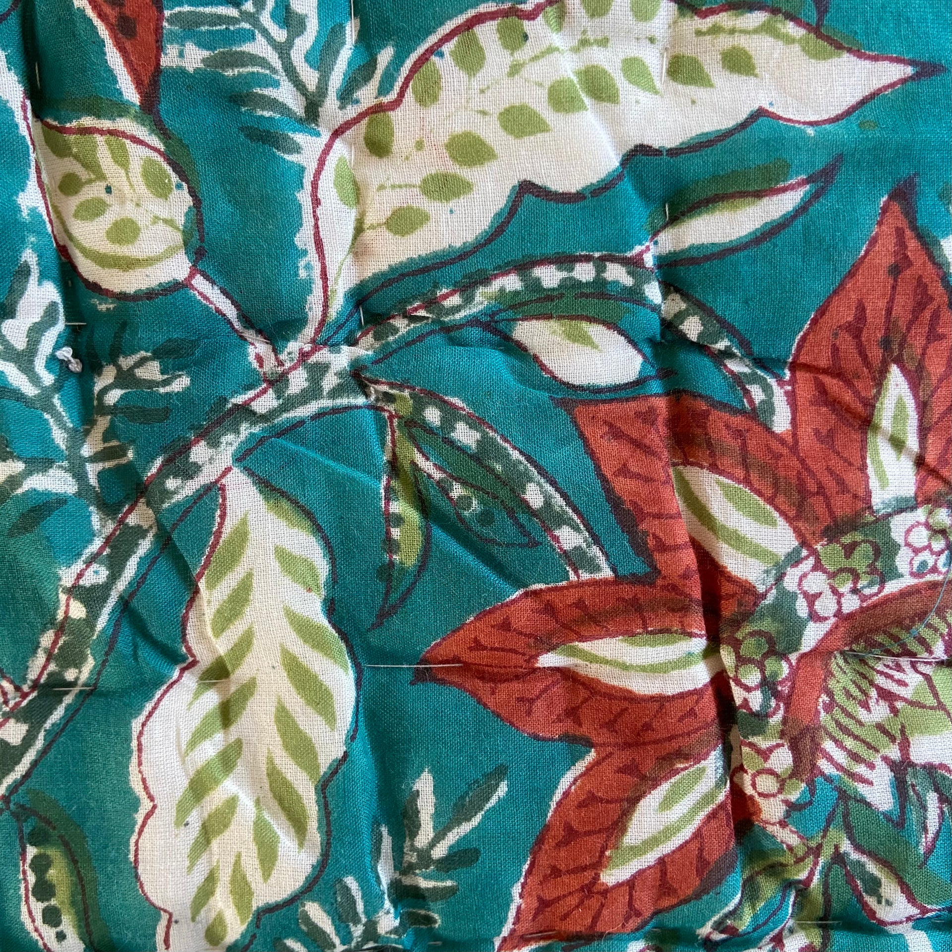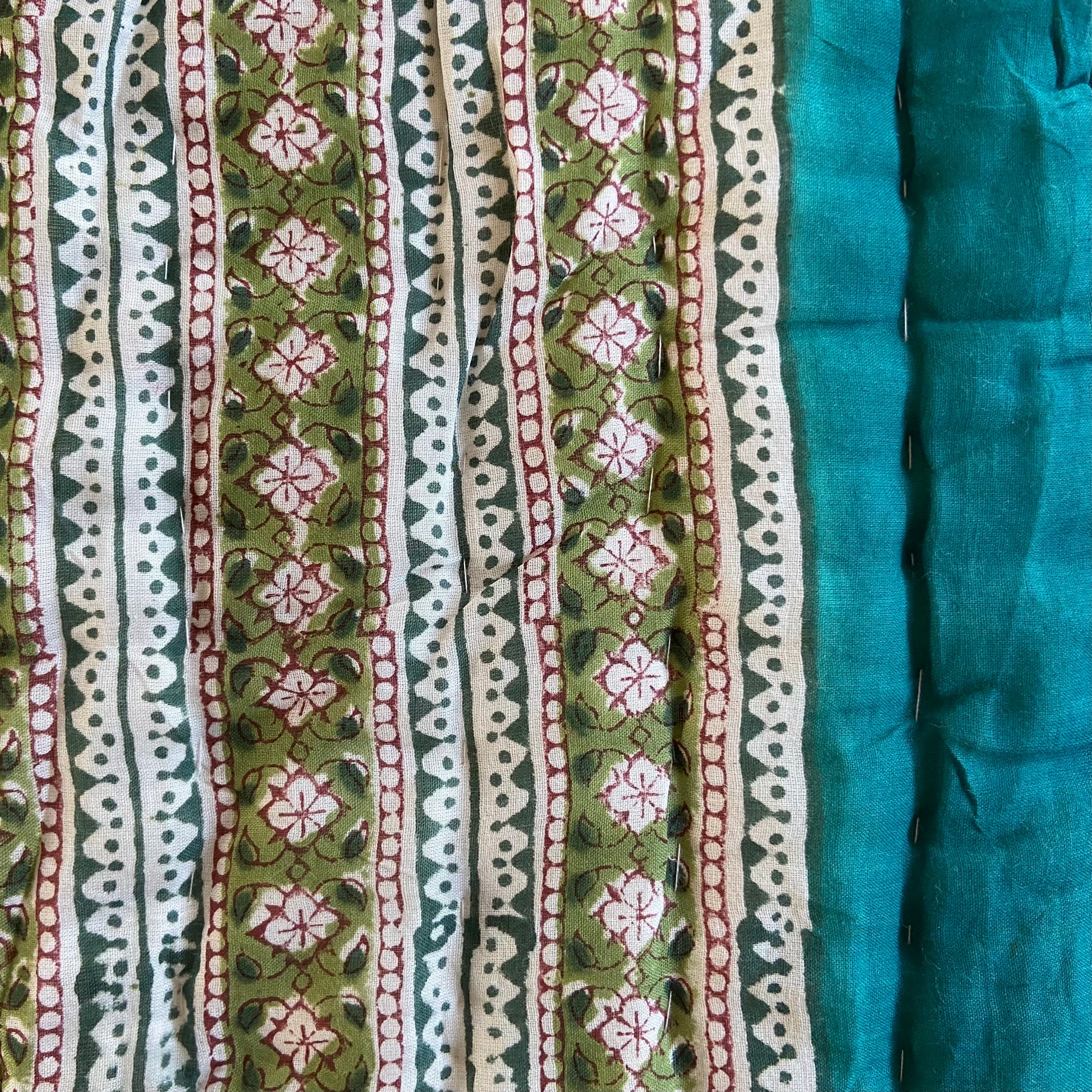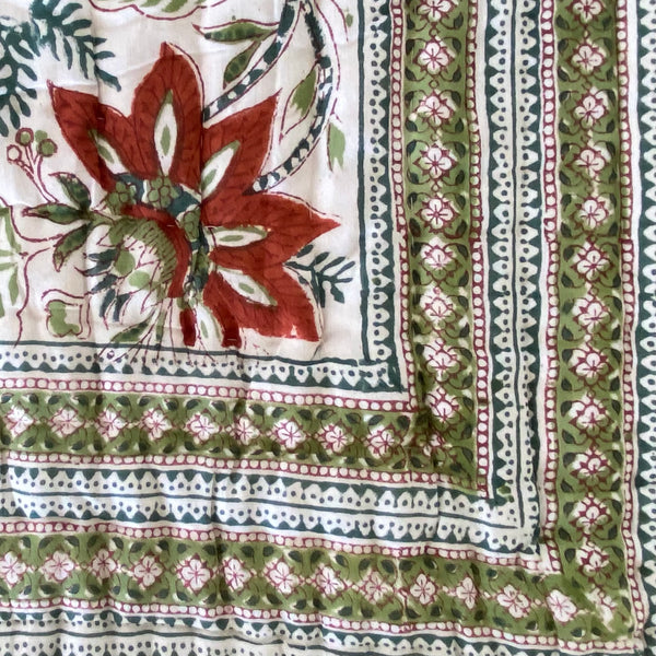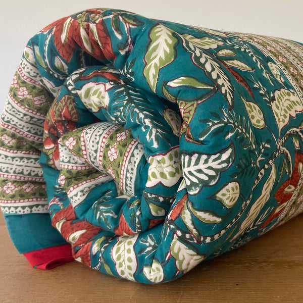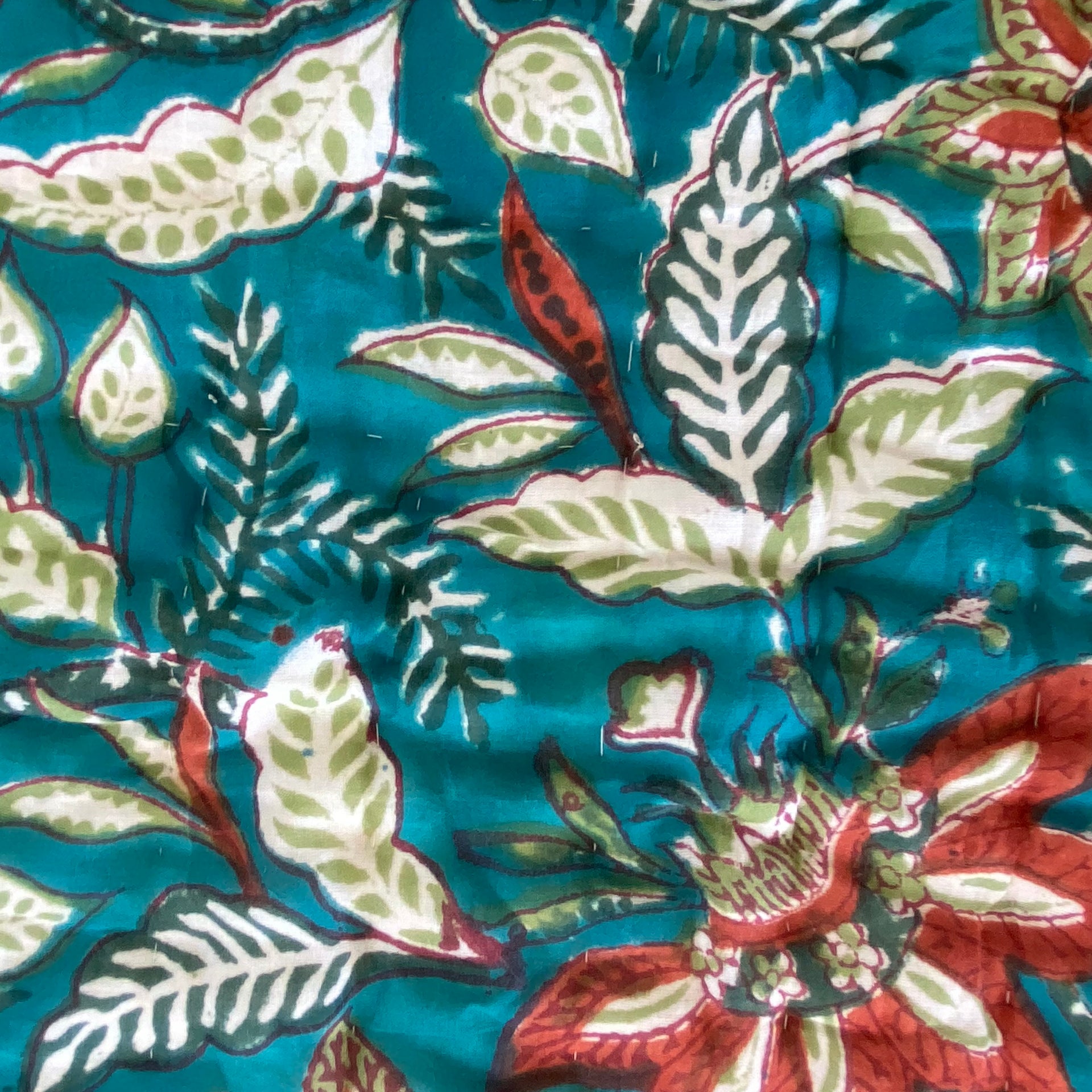 A stunning quilt in deep jade green with floral and leaf accents in orange and ochre. The reverse features the same floral and leaf accents on a white background and both sides feature a deep, striking, patterned border that highlights the central...View more