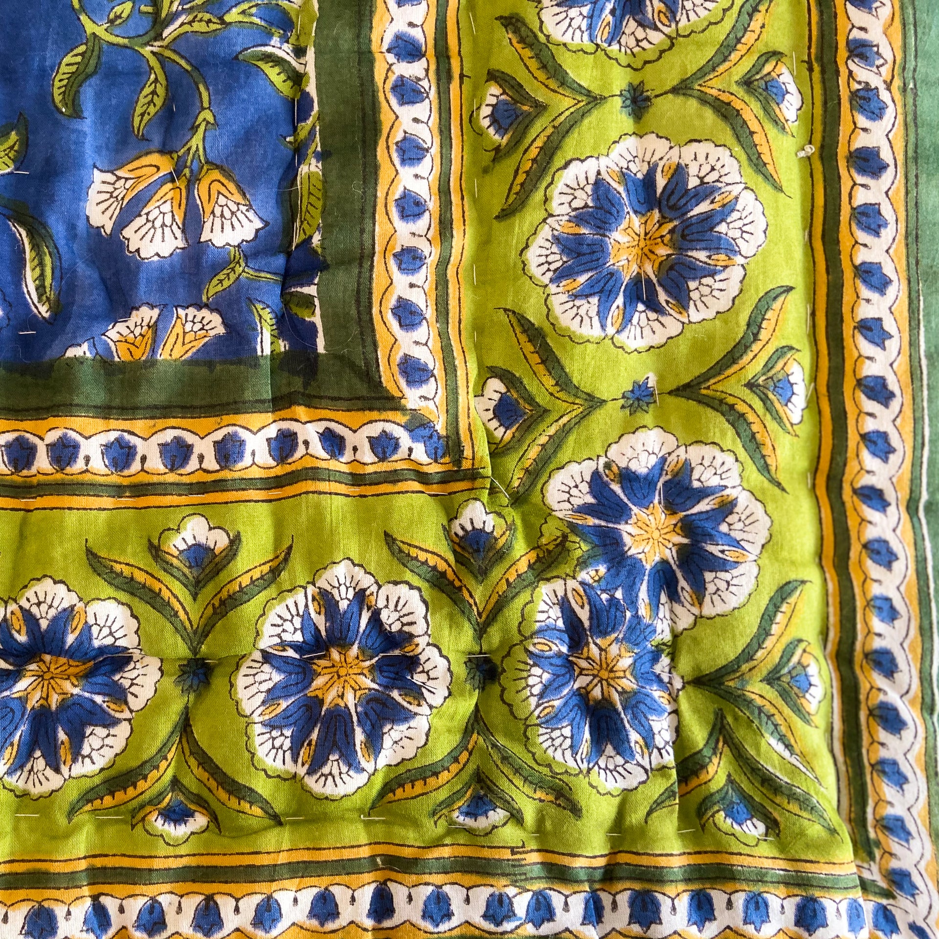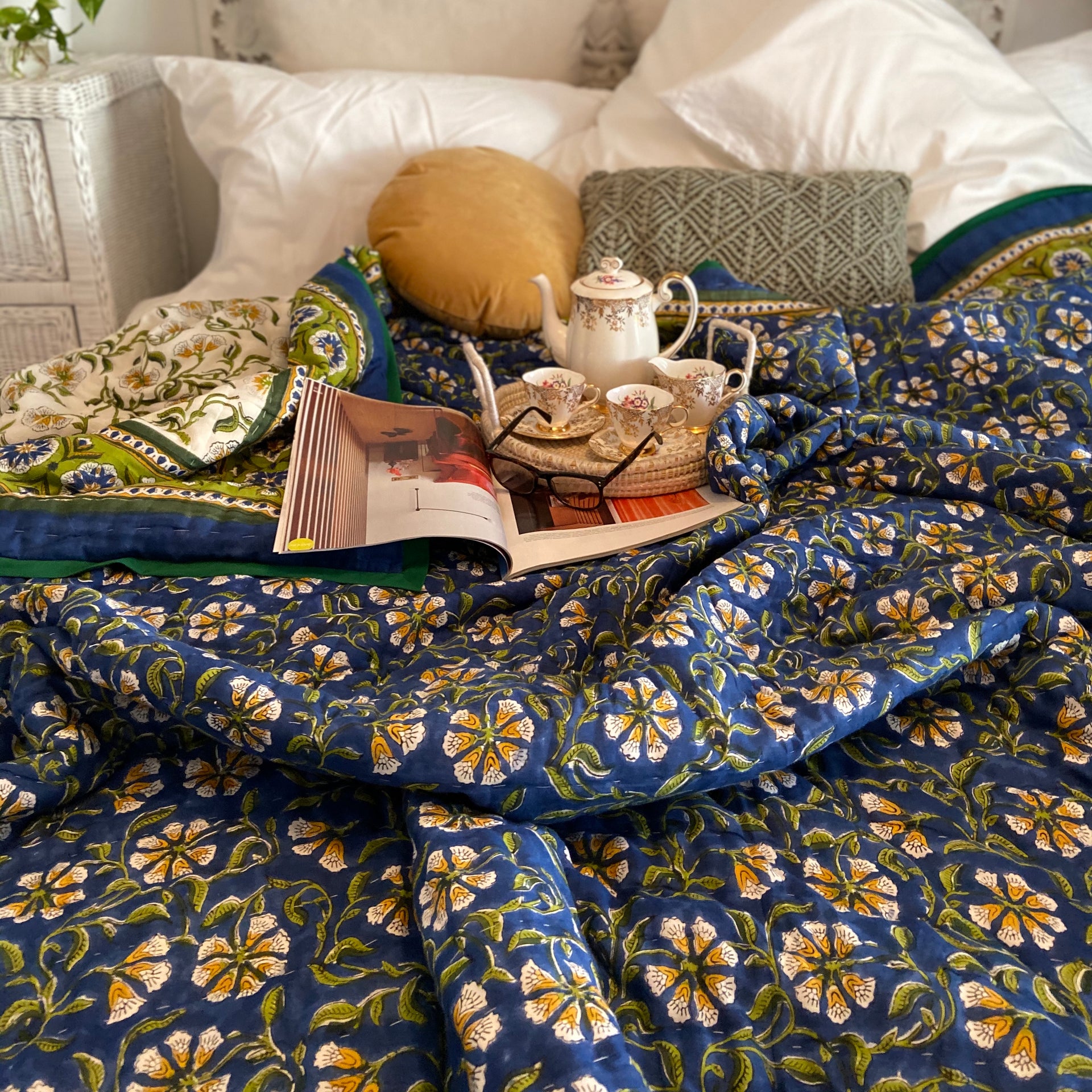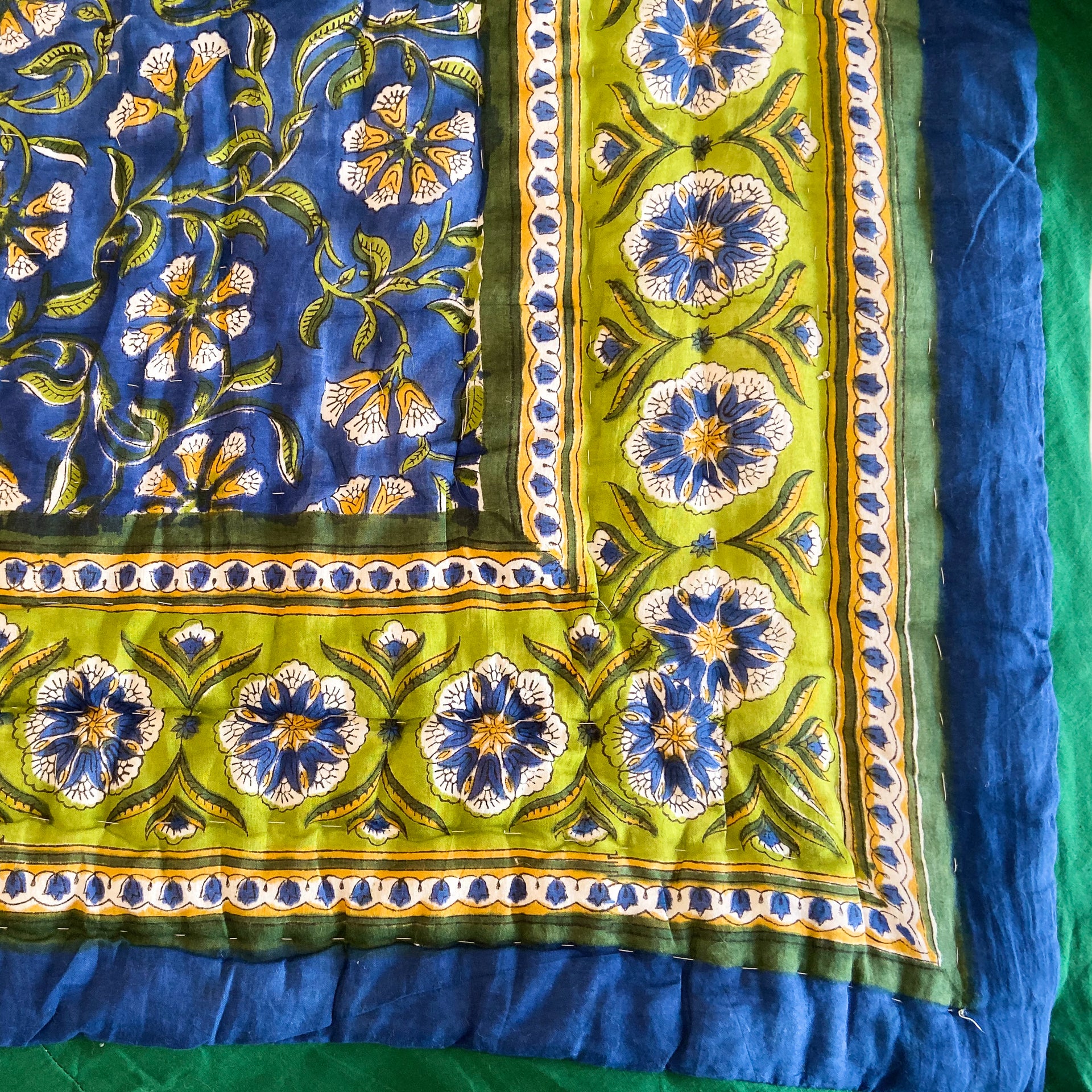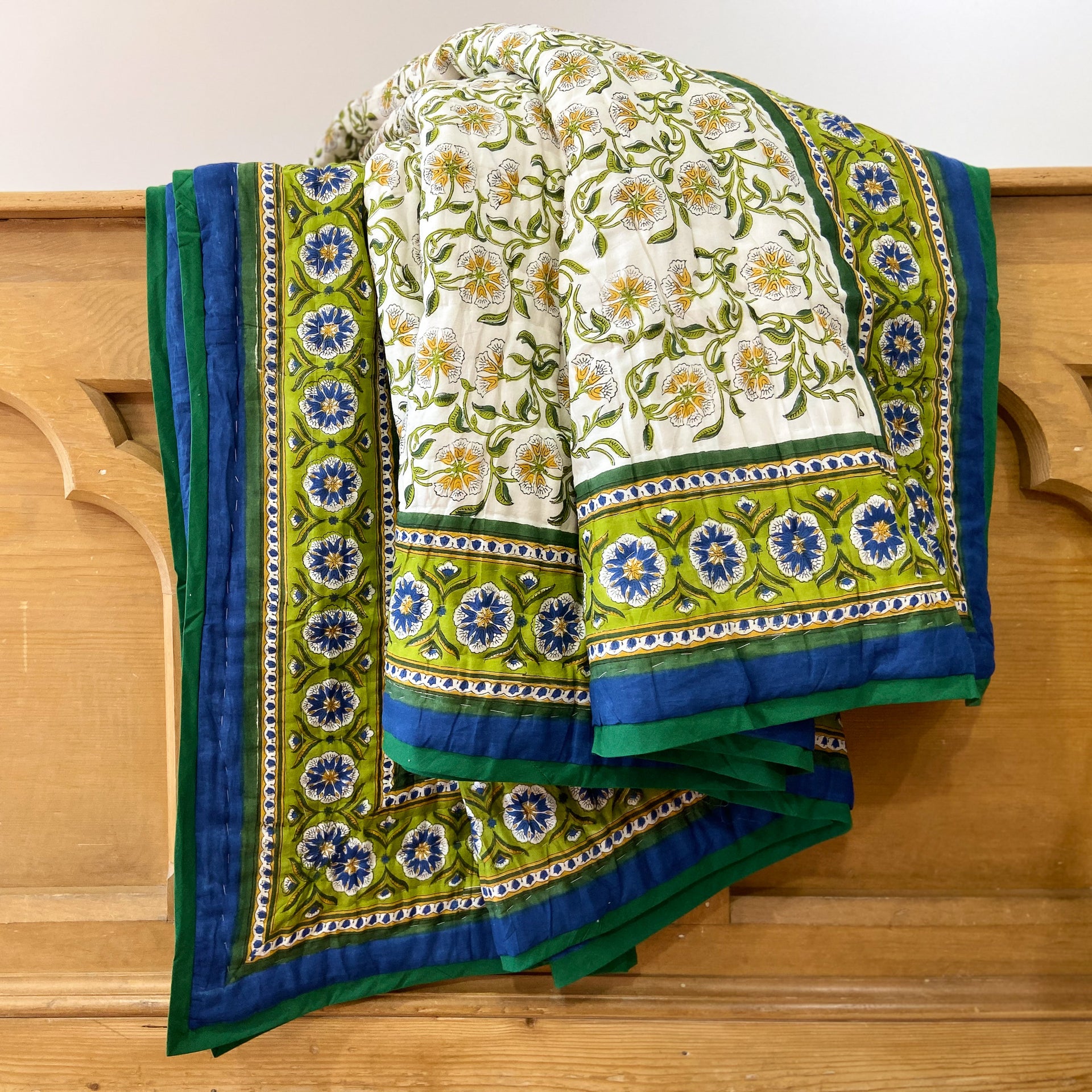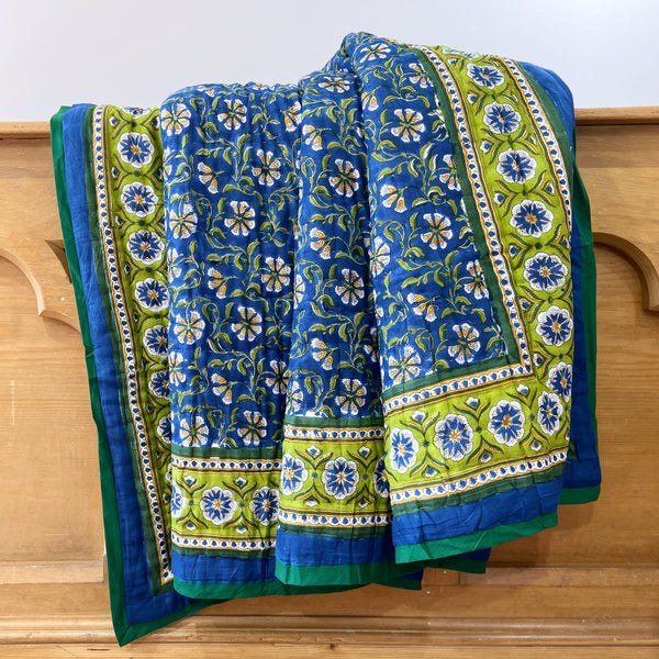 If you love colour, this is the quilt for you! Bright, rich blues and lime and soft green florals on one side with white, blue and green on the reverse. Both sides feature a deep complimentary border. Beautiful detailing and...View more