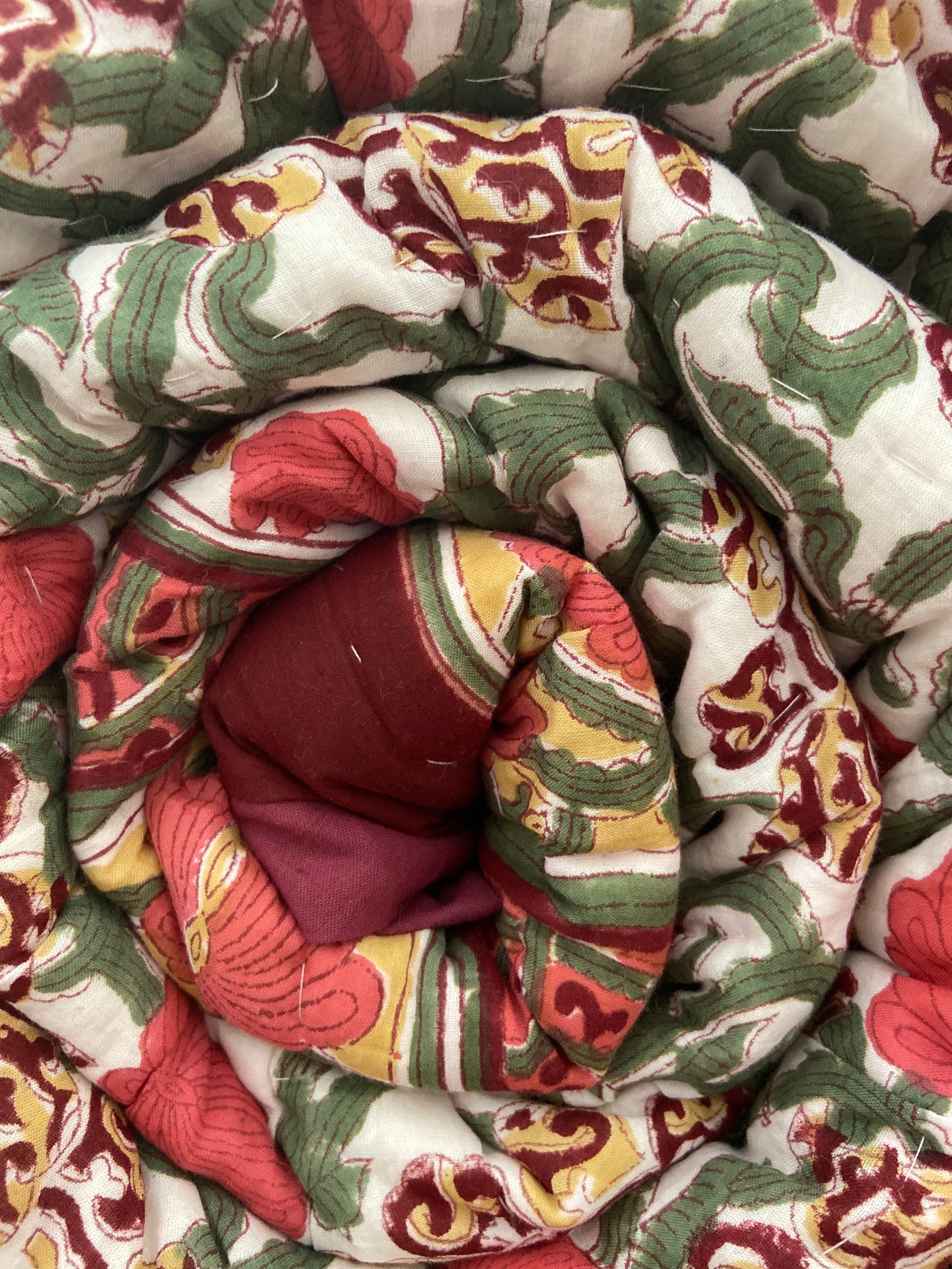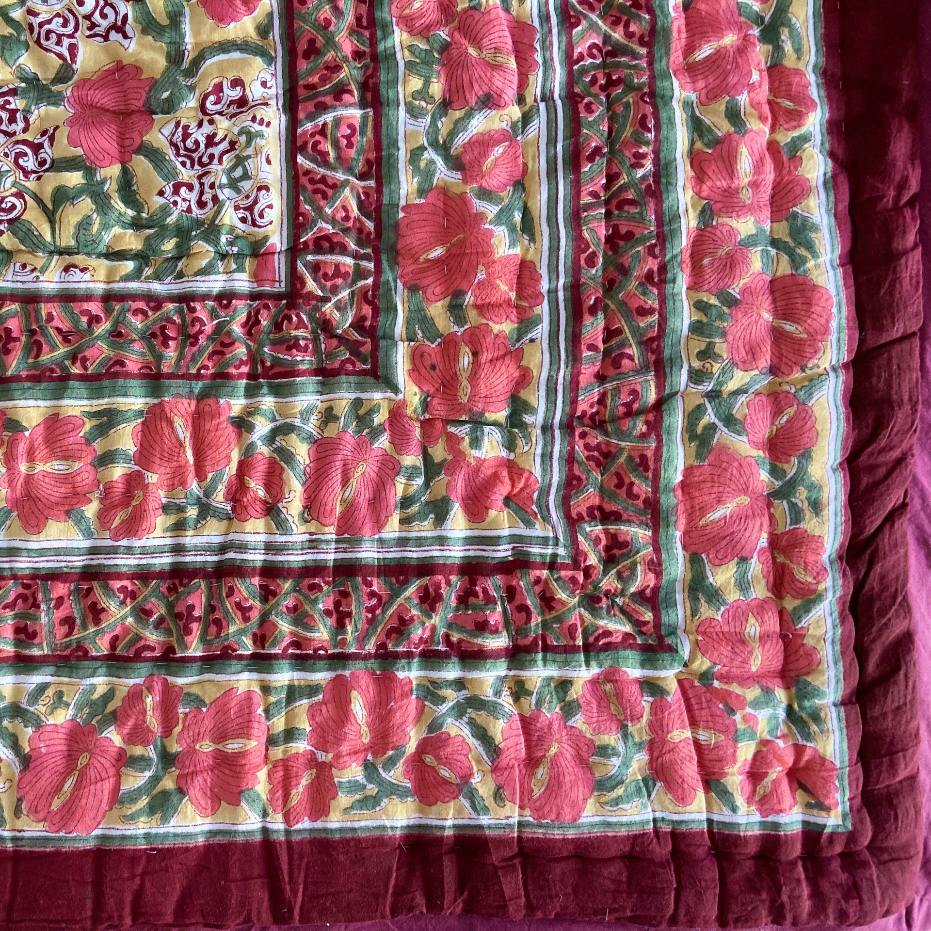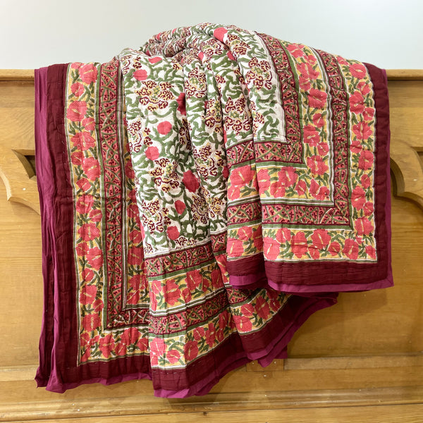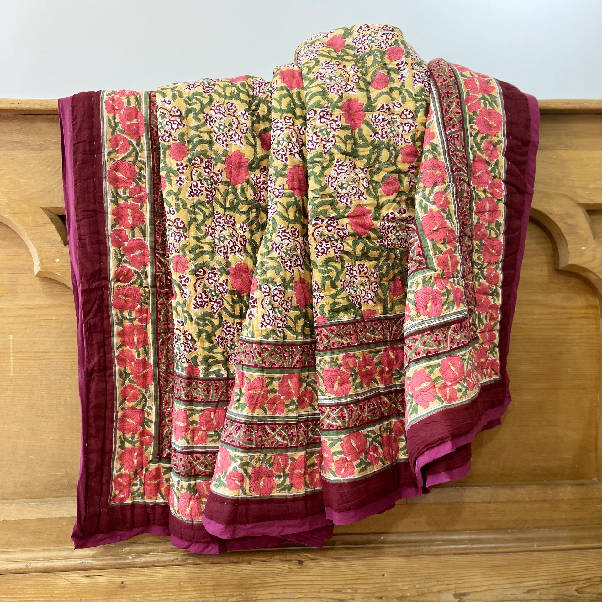 A delightful intricate floral design on both sides, one on an ochre background and one on white in pretty deep pinks and green. Both sides are framed by a deep double complimentary border. Created using 100% soft and snuggly cotton...View more