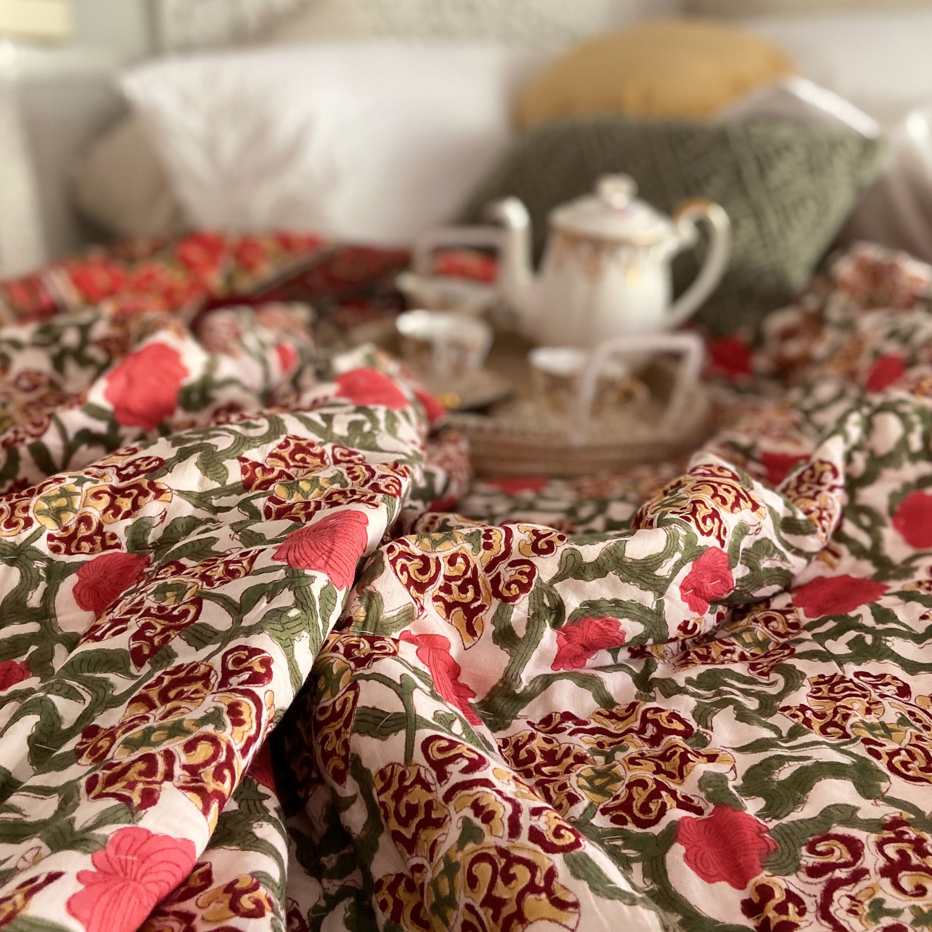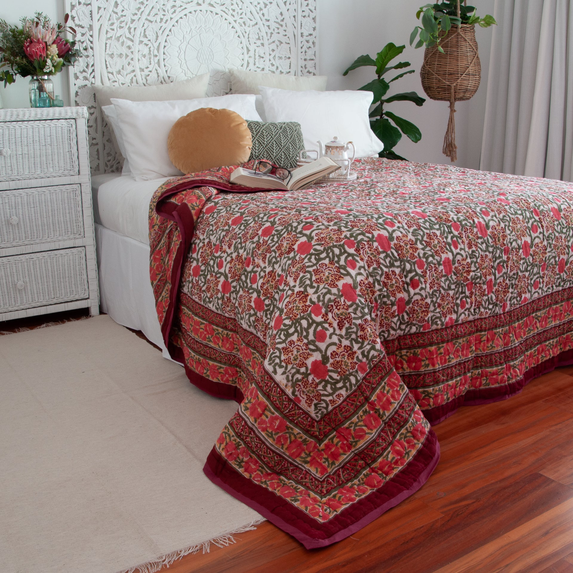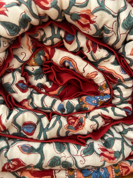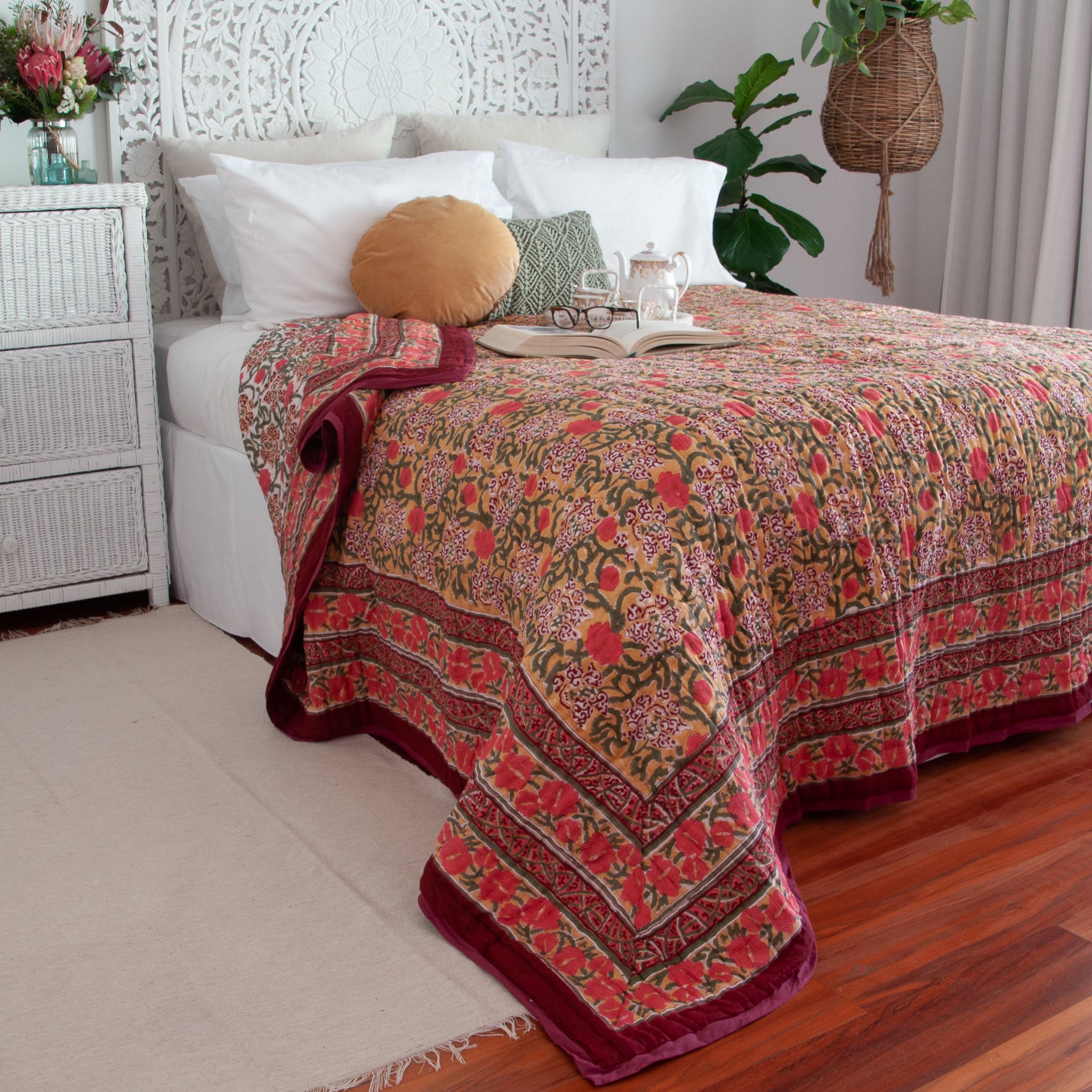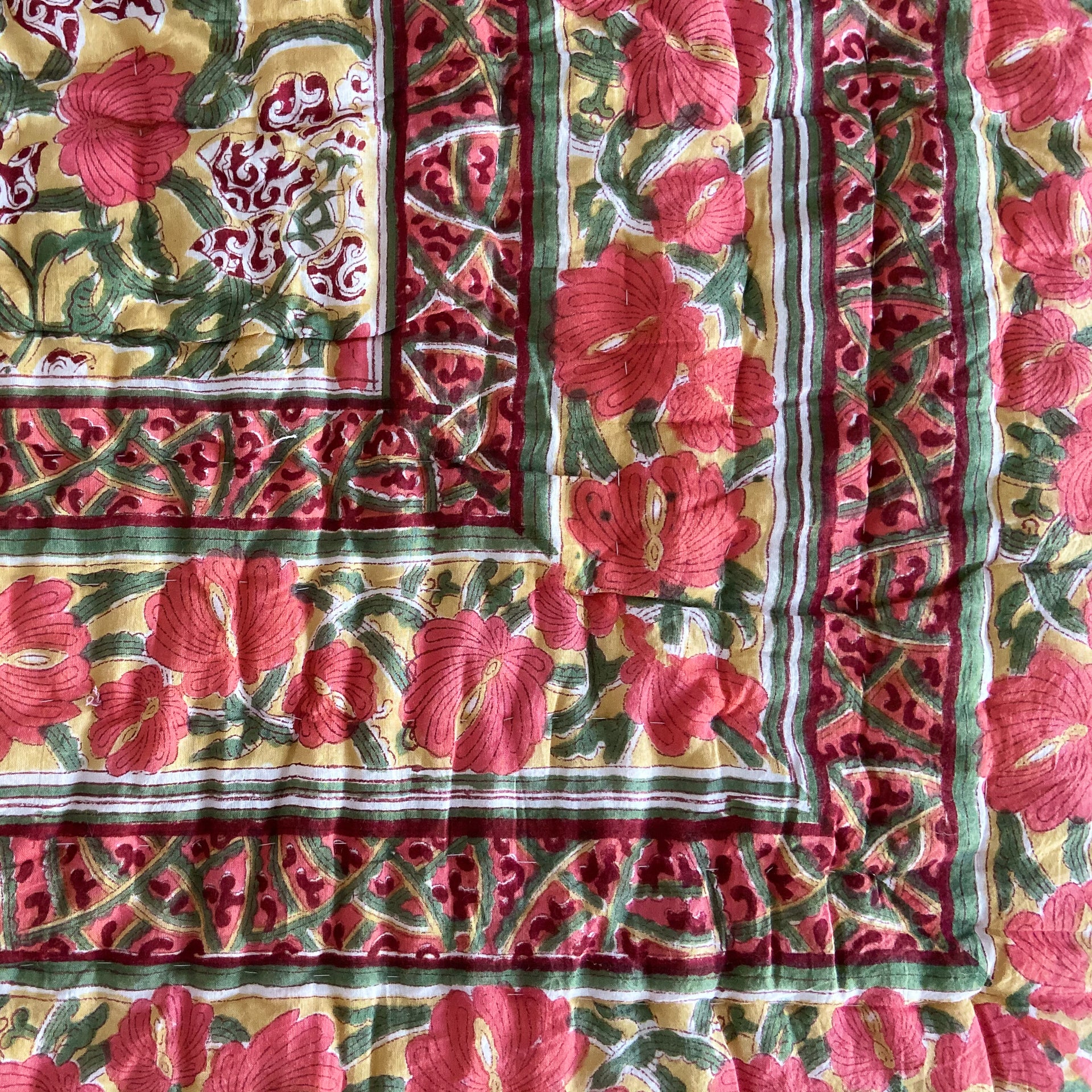A delightful intricate floral design on both sides, one on an ochre background and one on white in pretty deep pinks and green. Both sides are framed by a deep double complimentary border. Created using 100% soft and snuggly cotton...View more