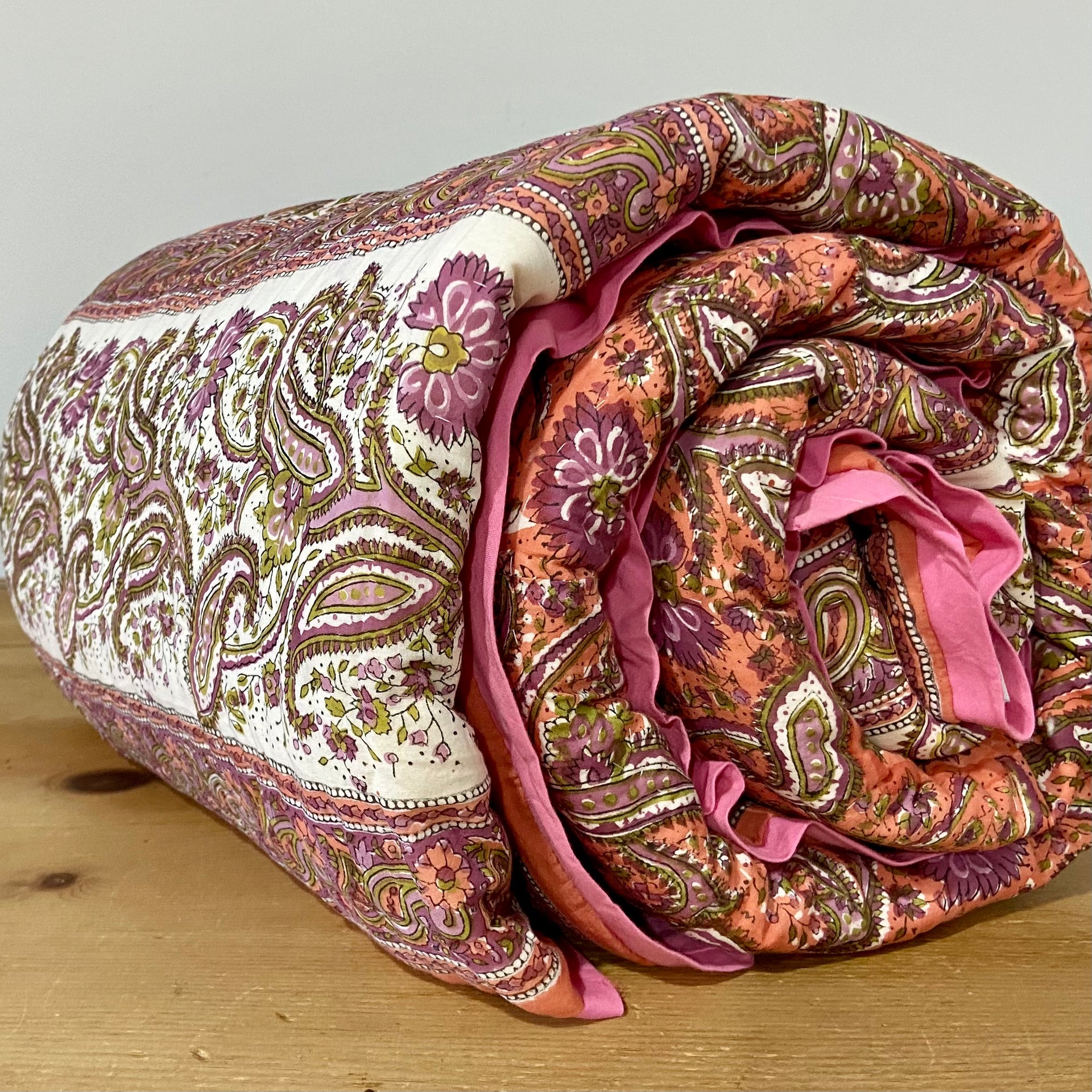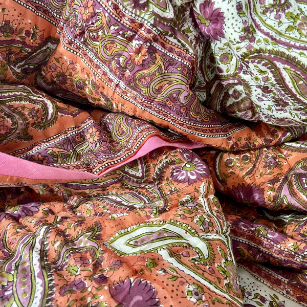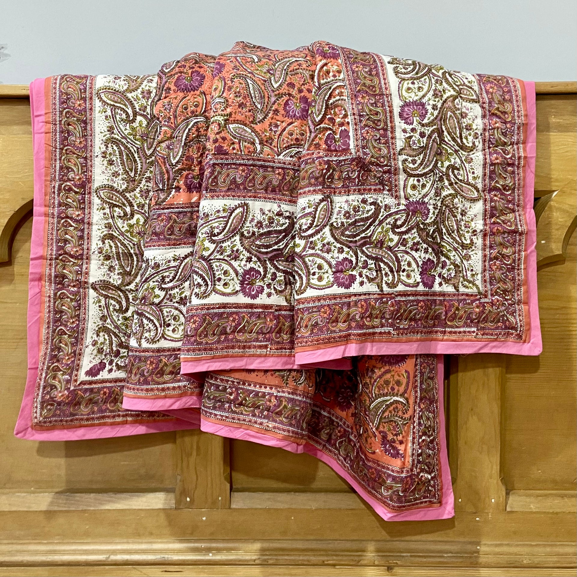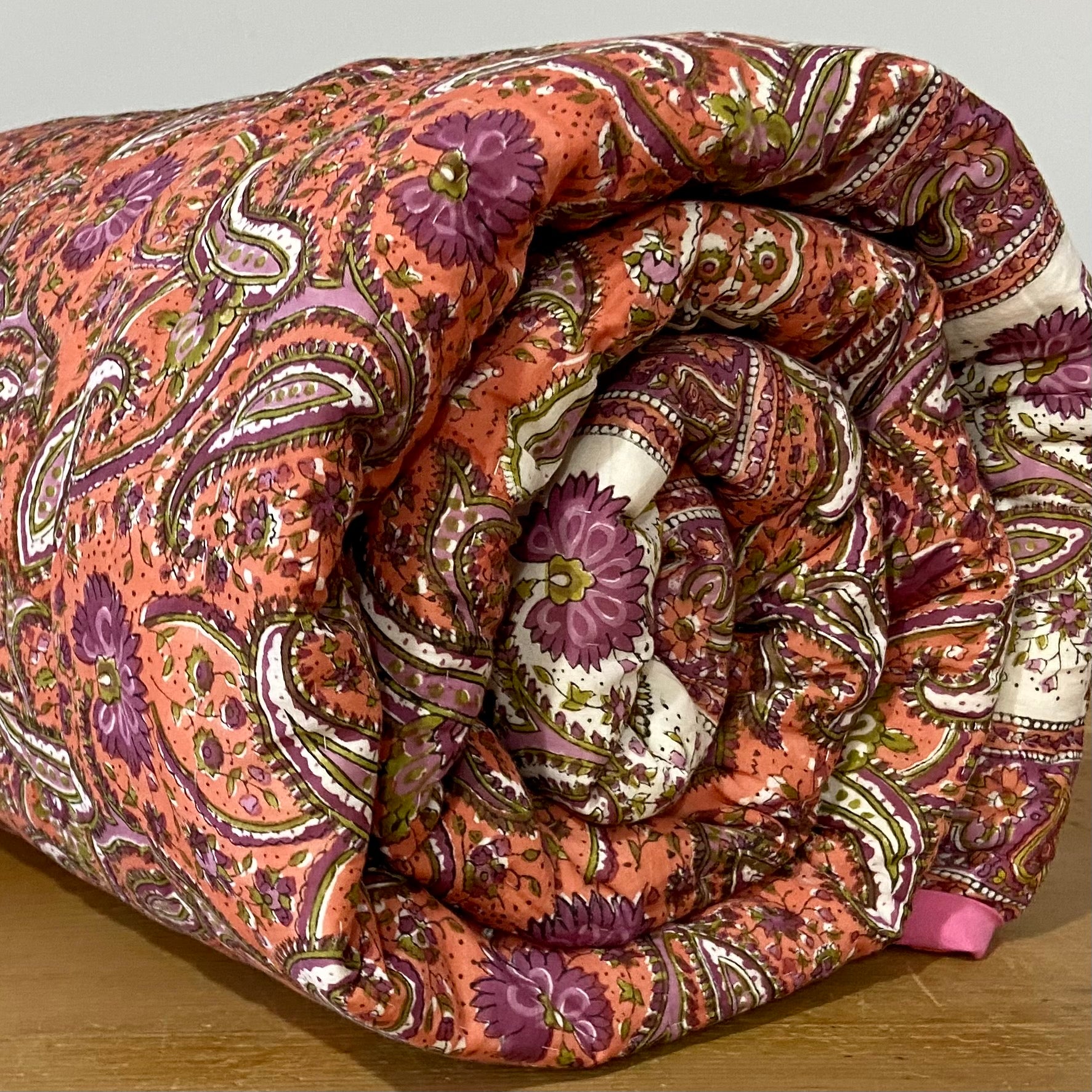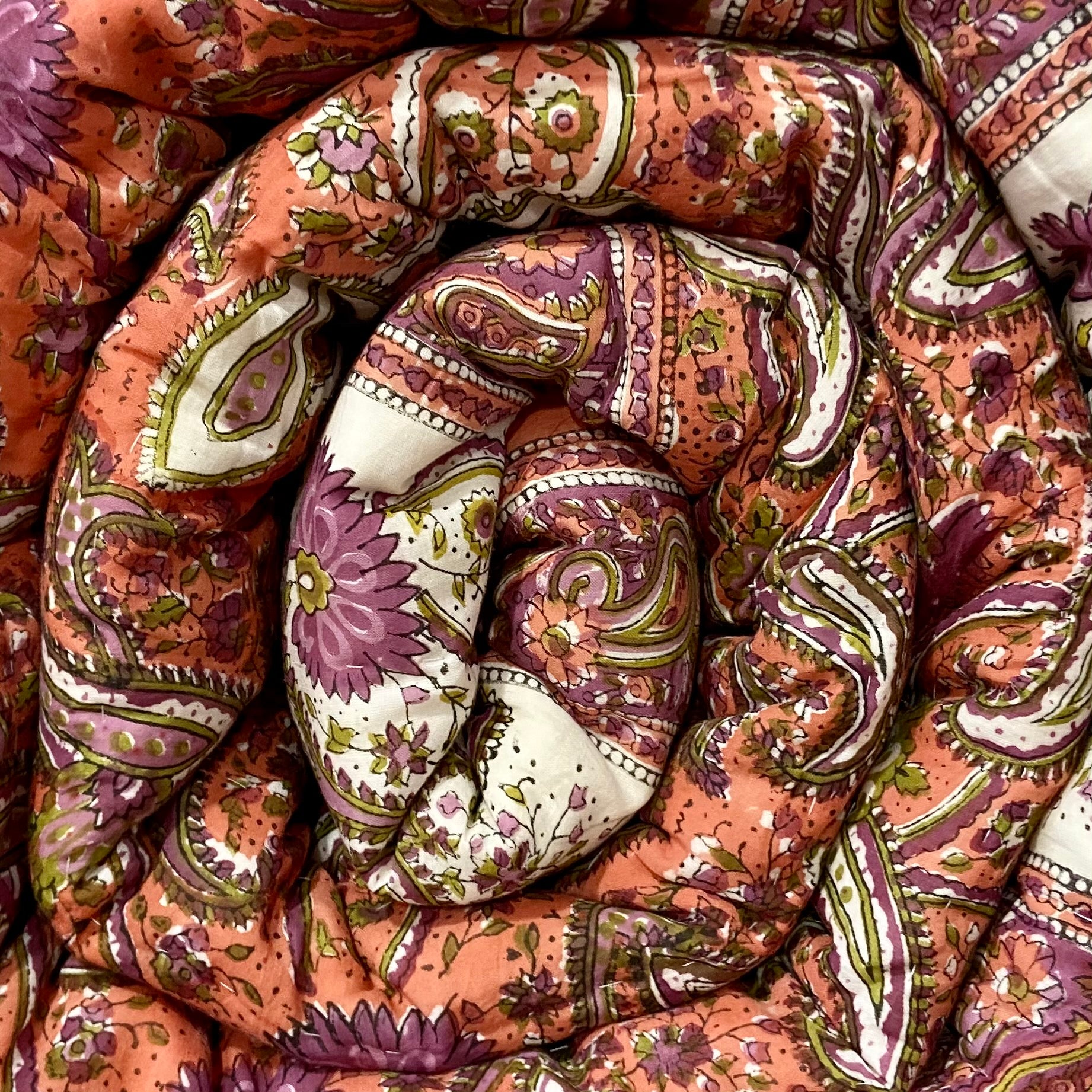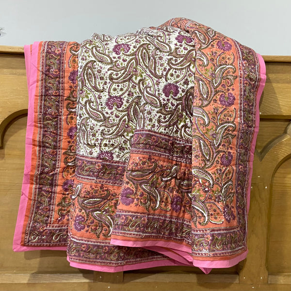 hand block printed queen quilt in apricot and pink shades in paisley print. Soft cotton filled