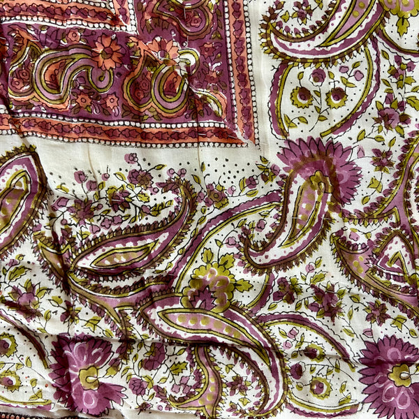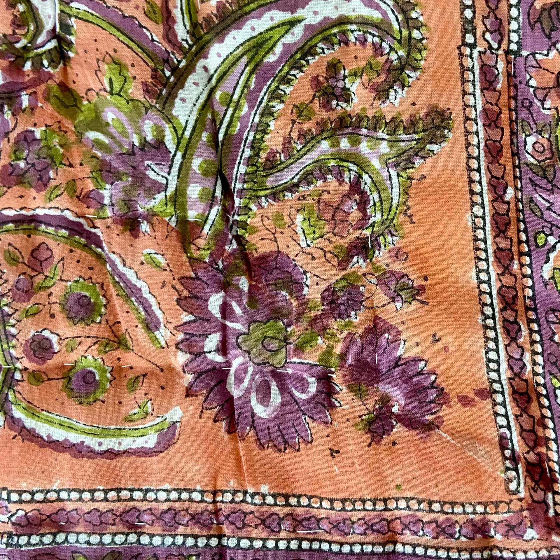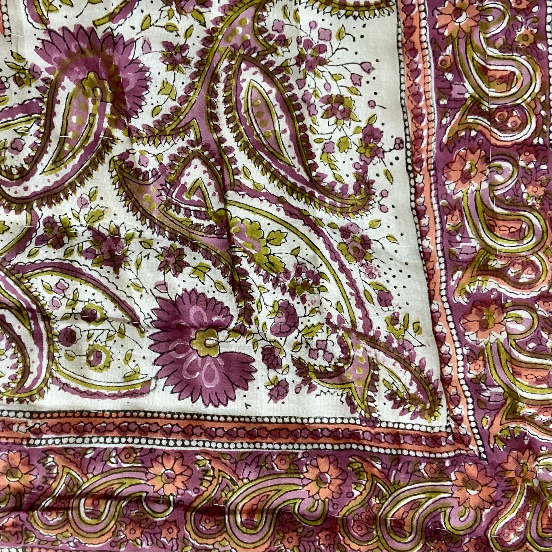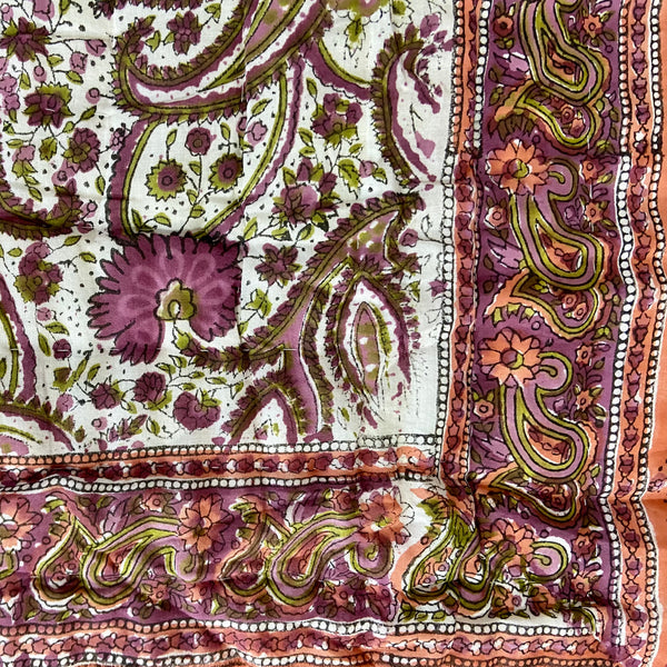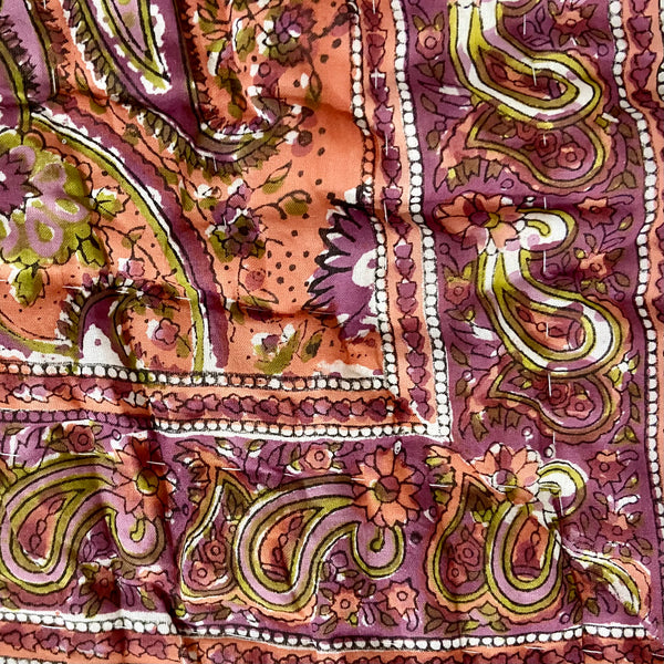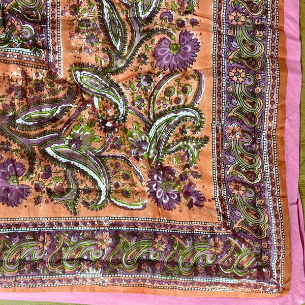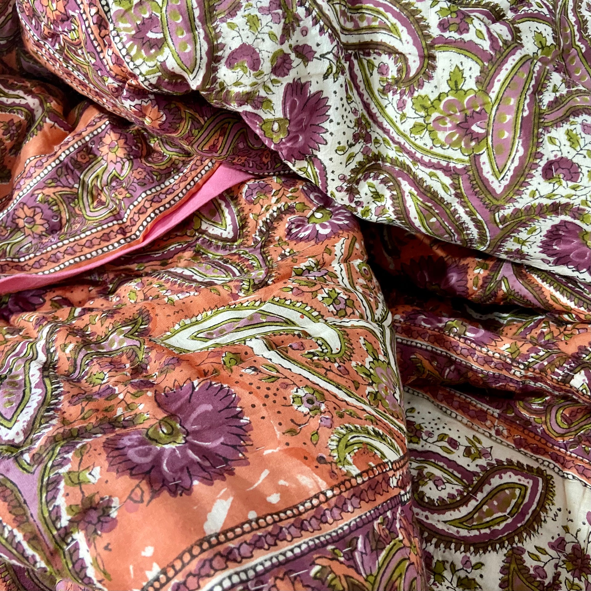 hand block printed queen quilt in apricot and pink shades in paisley print. Soft cotton filled