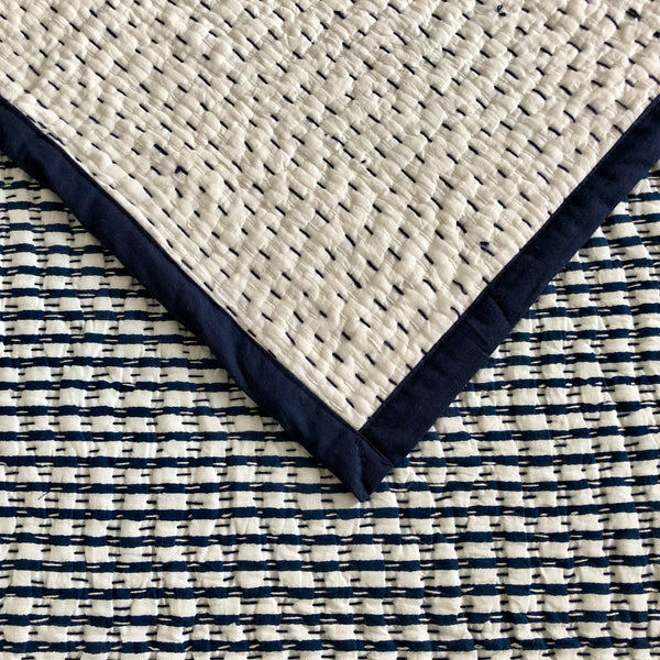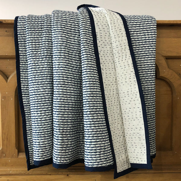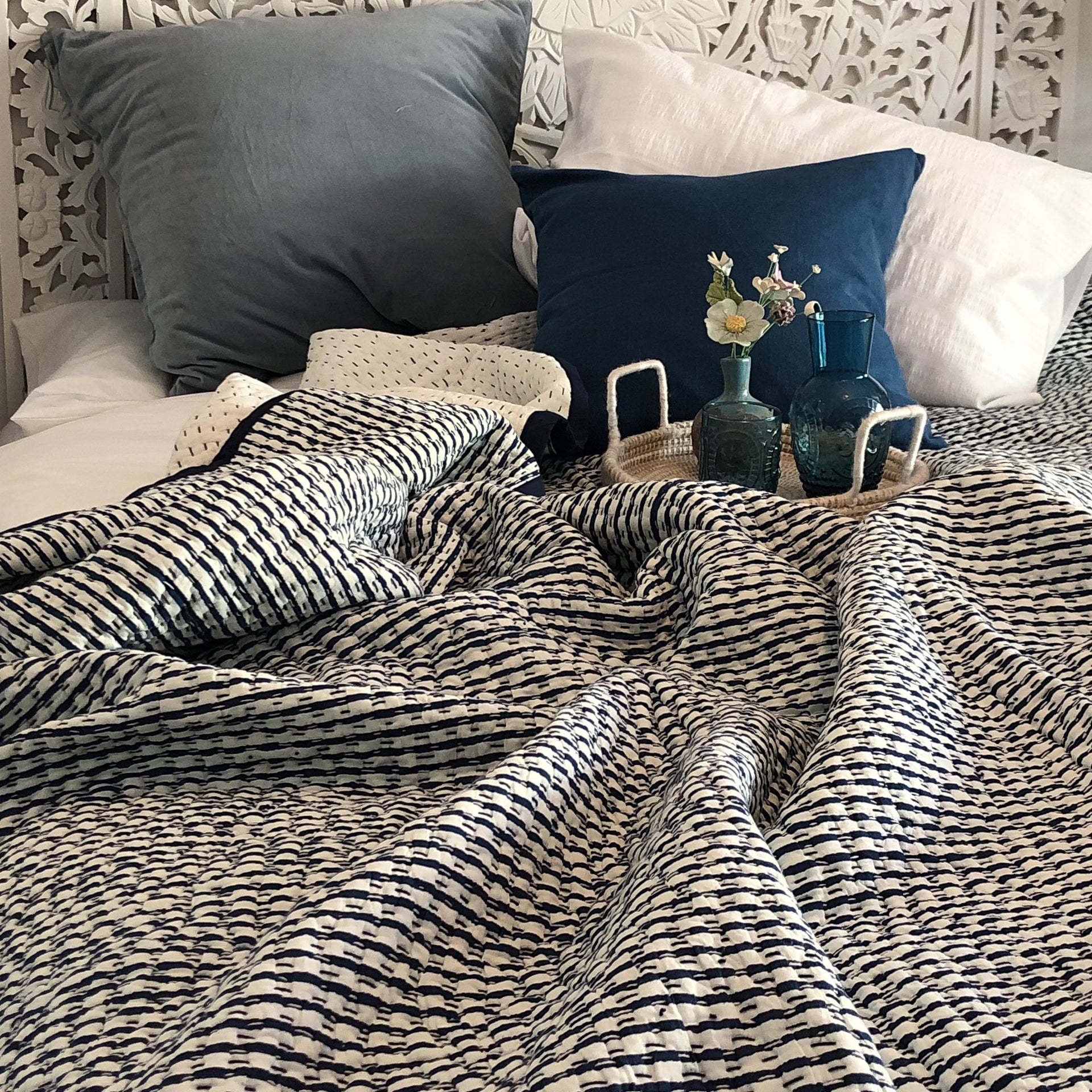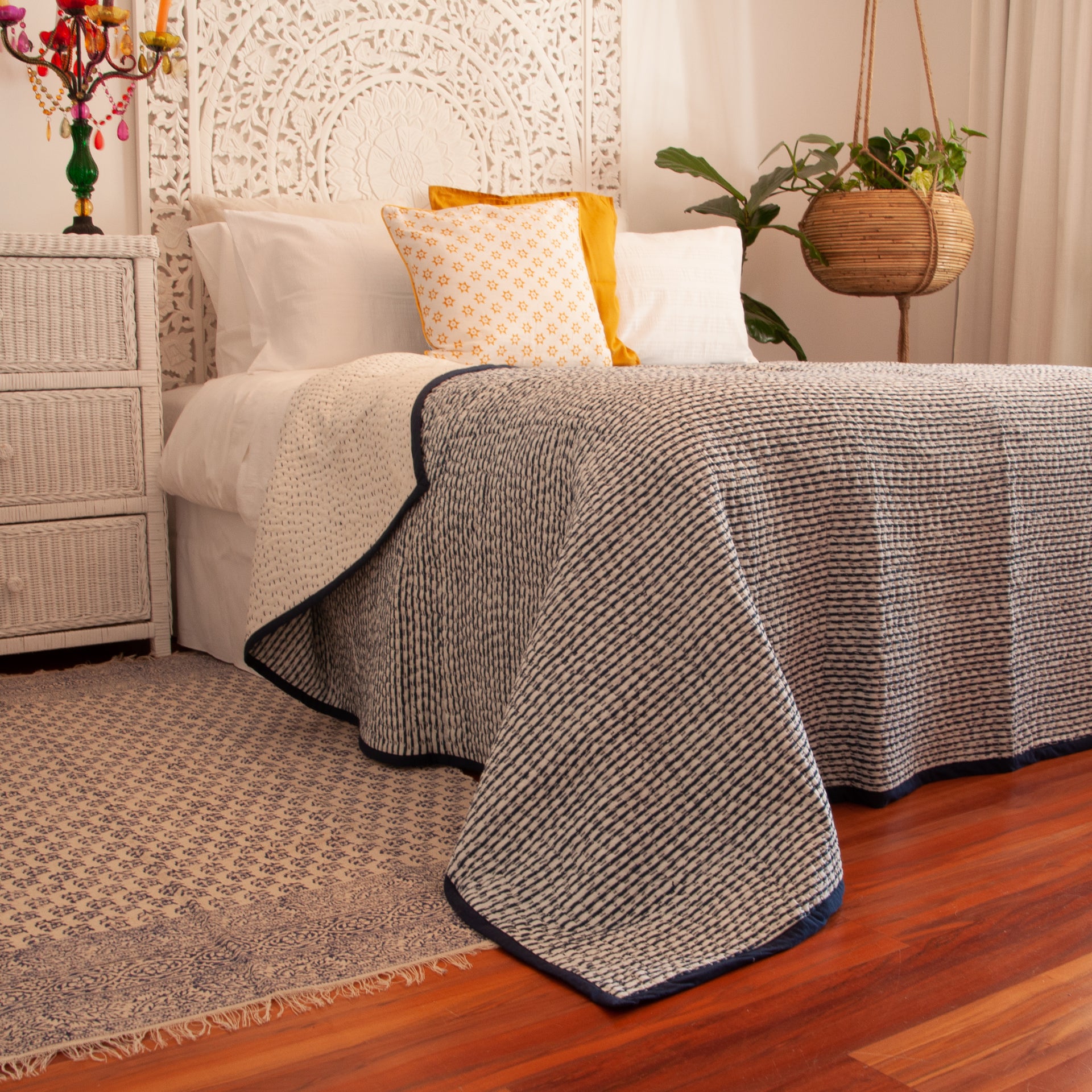 Hand Block Printed Kantha Quilt - Indigo Waterfall