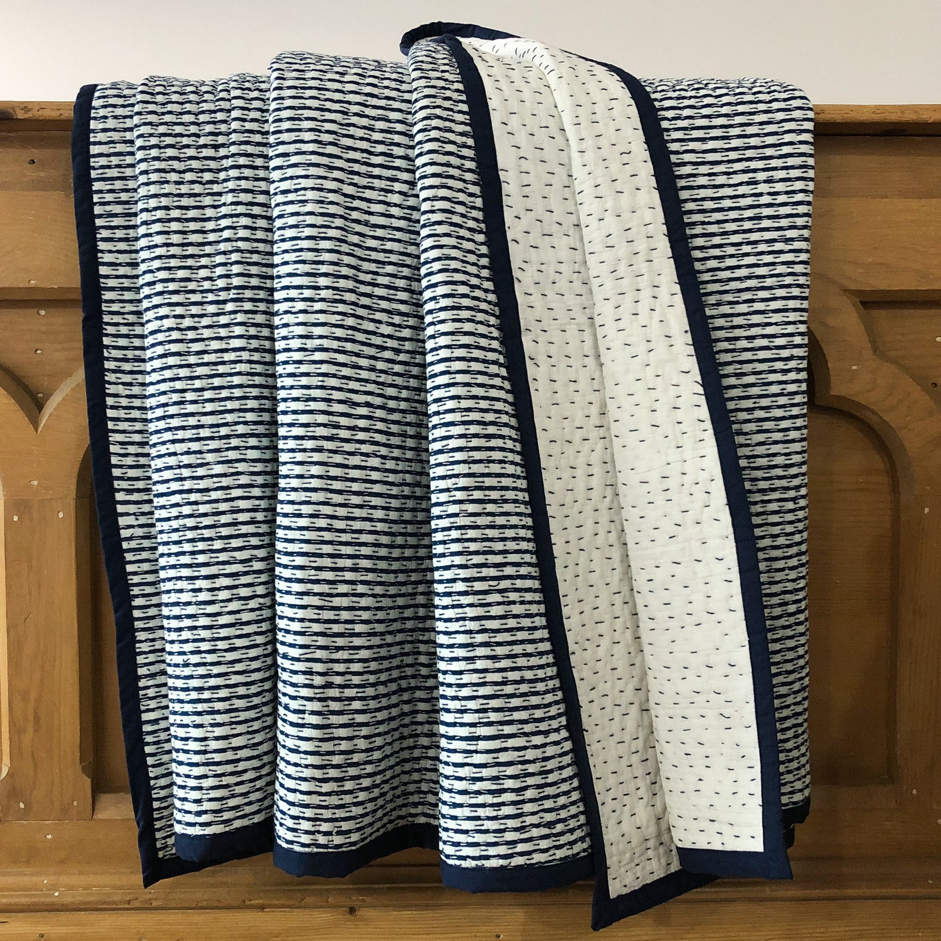 This Gorgeous, soft 100% cotton quilt features a blue and white stripe design on one side together with corresponding white and blue kantha stitches in lovely, neat rows. The reverse is white and fresh and both sides are narrowly bordered...View more