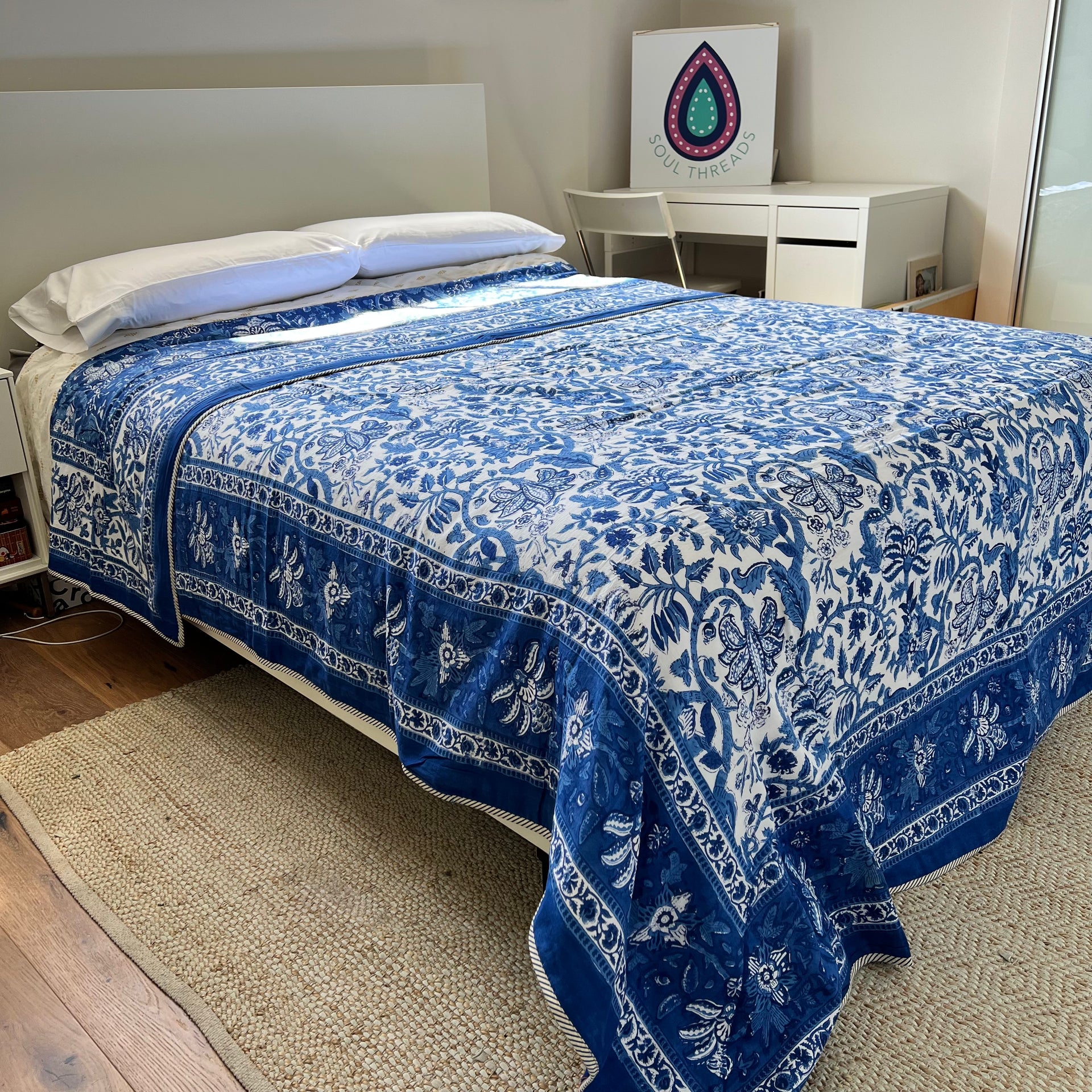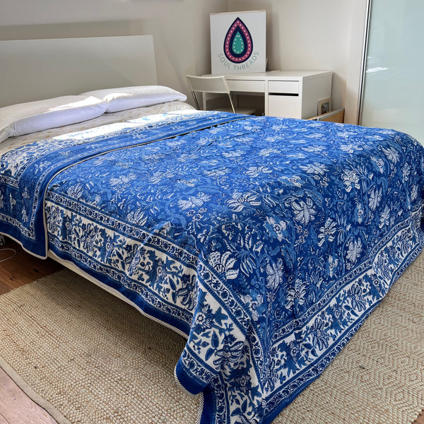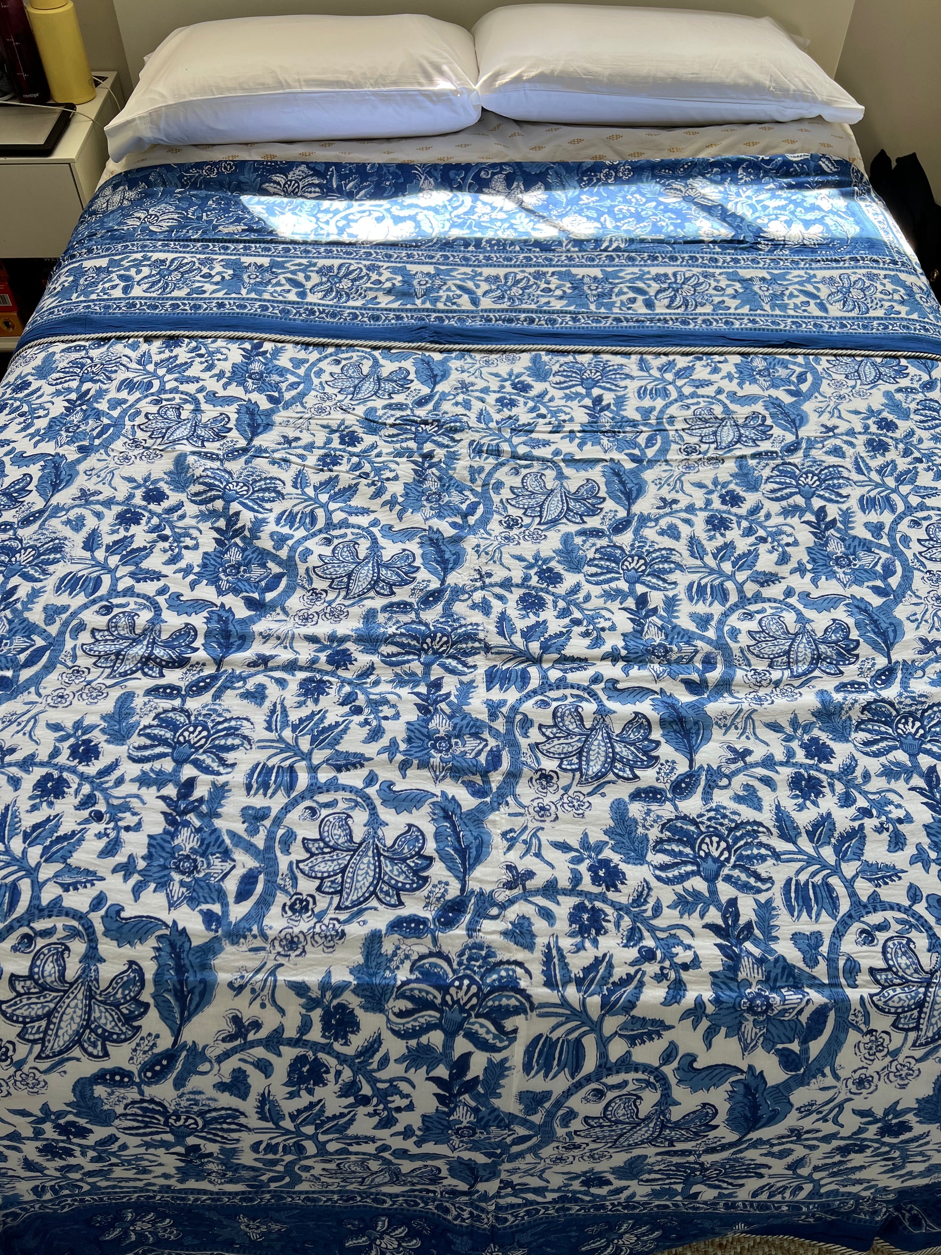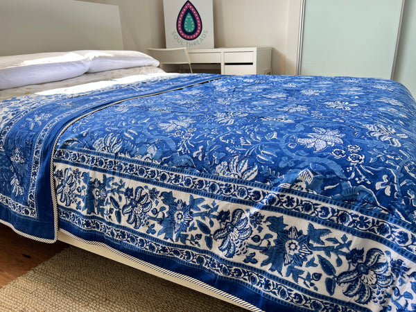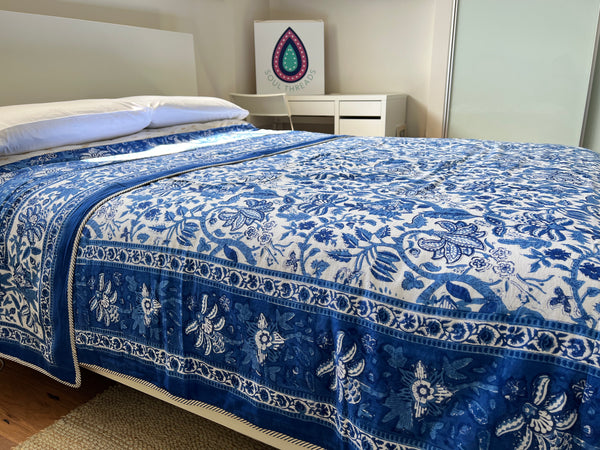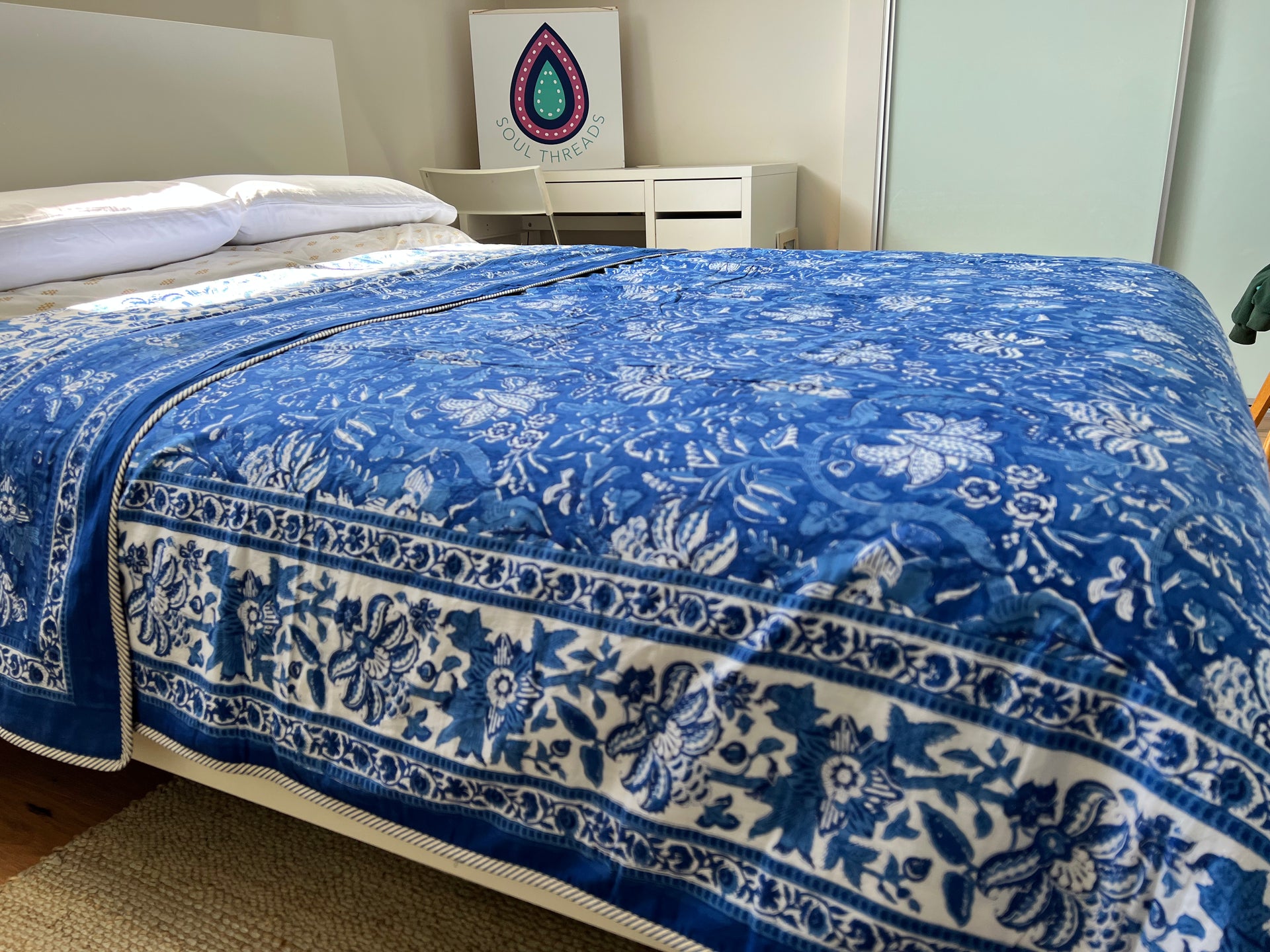 hand block printed fair trade Indian Dohar in Flower Blossom Sea Green. Sustainable.