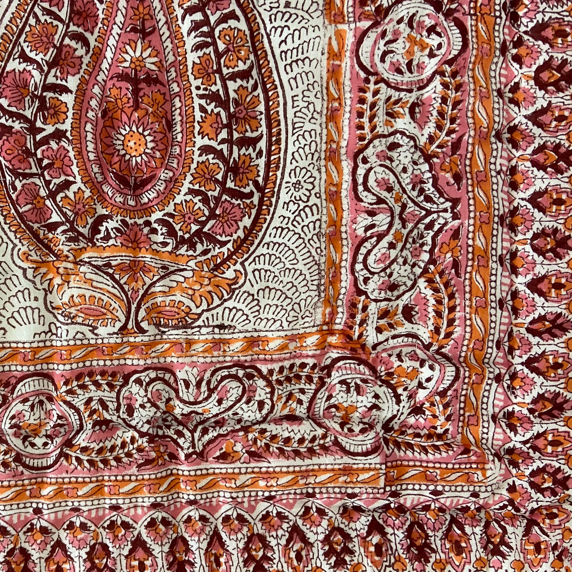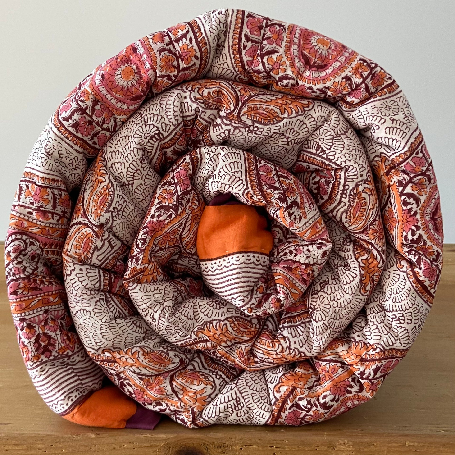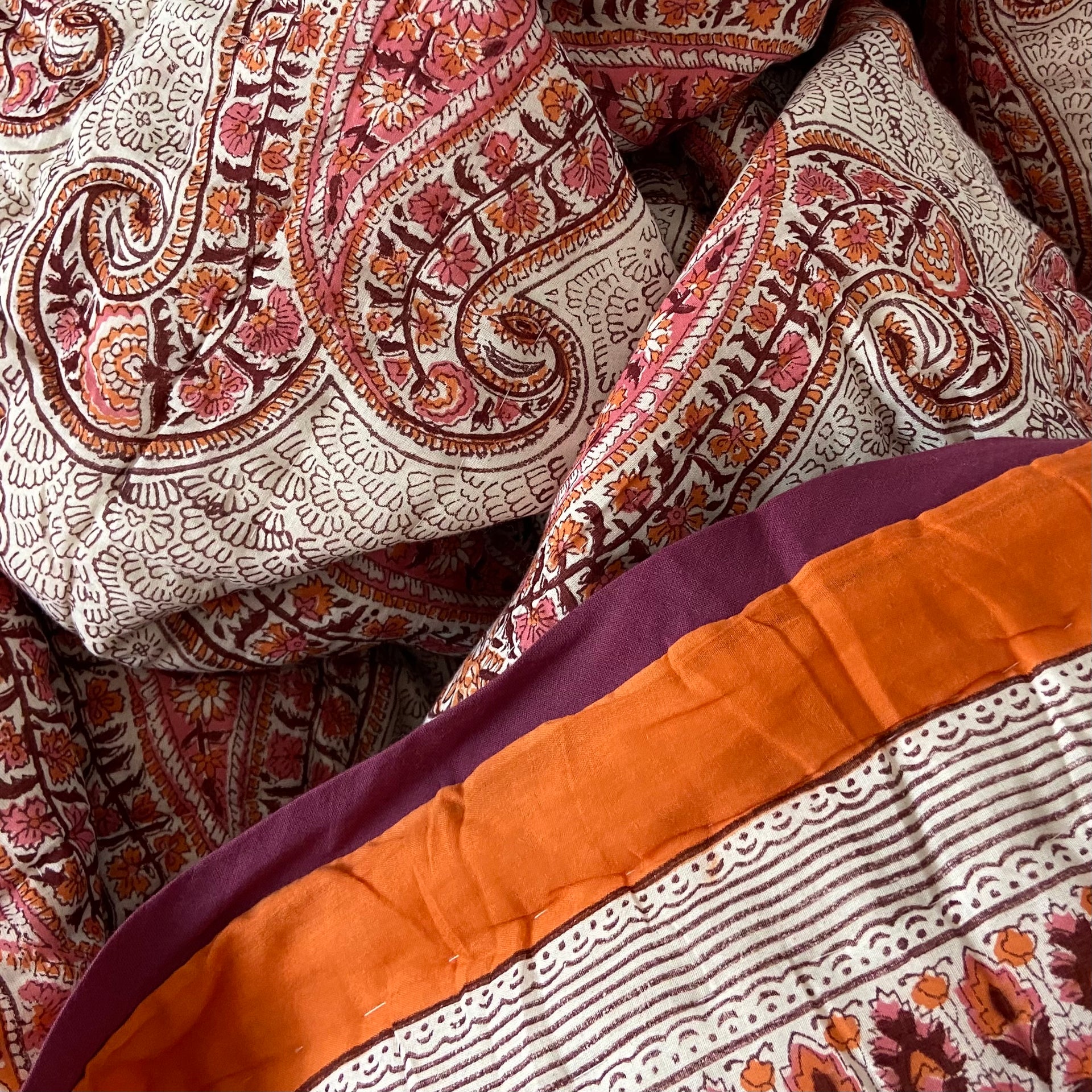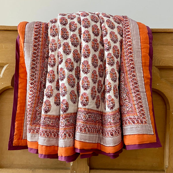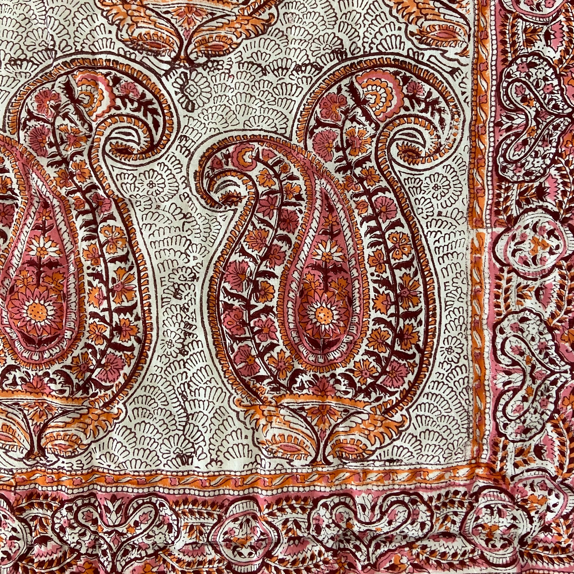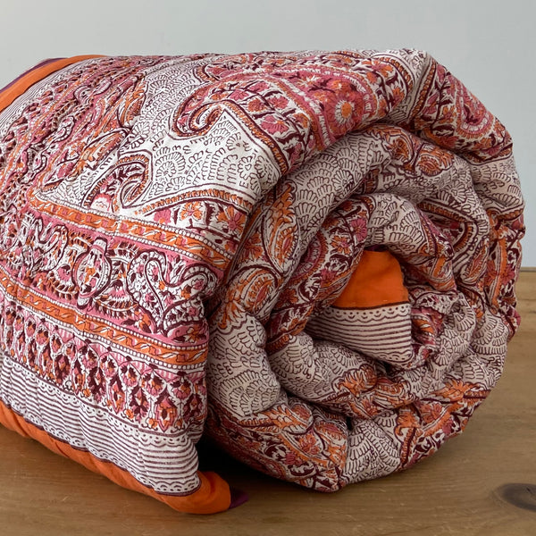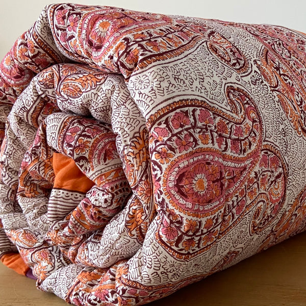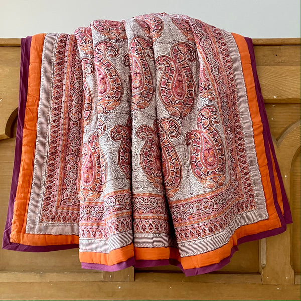Hand Block Printed Quilt - Big Paisley Pink/Orange