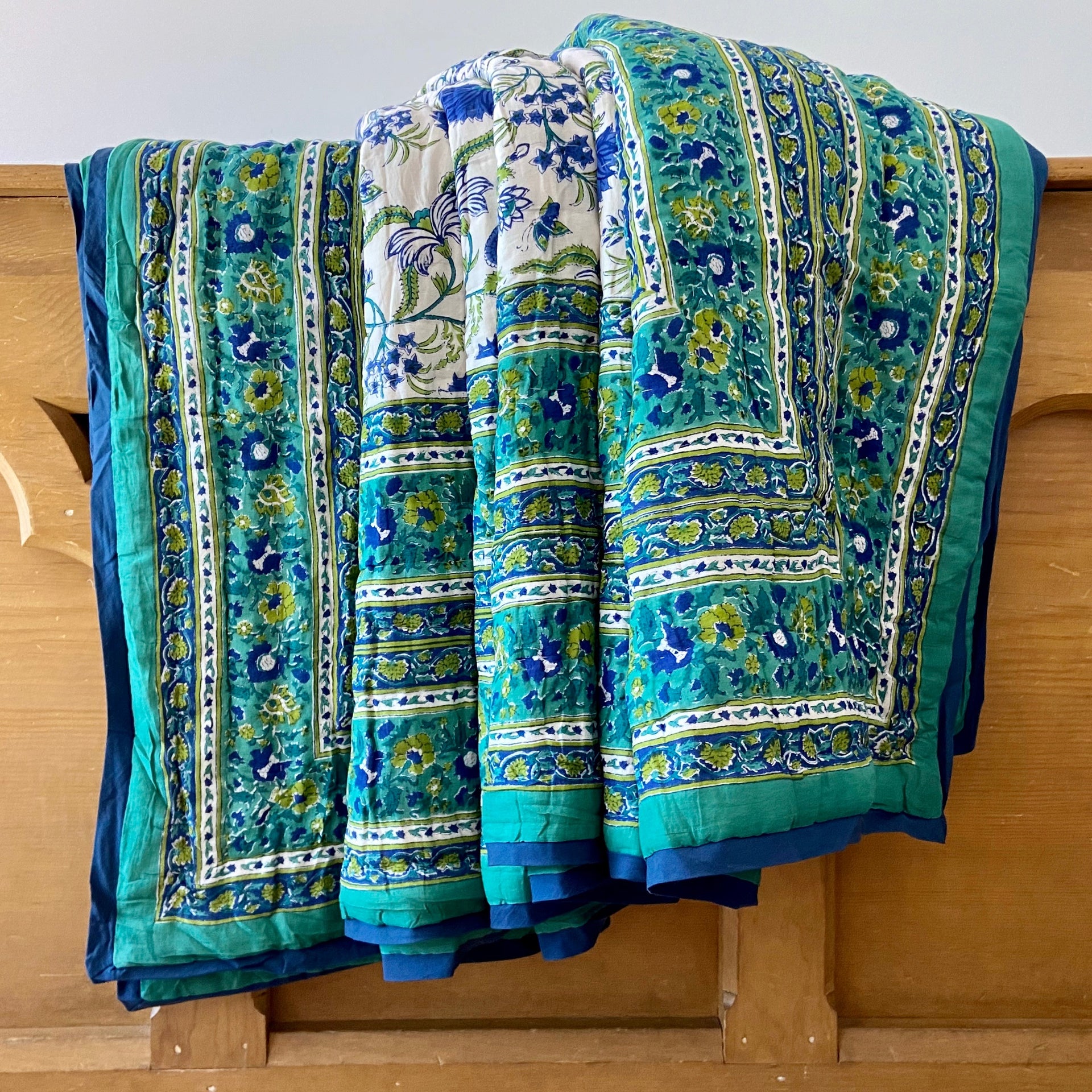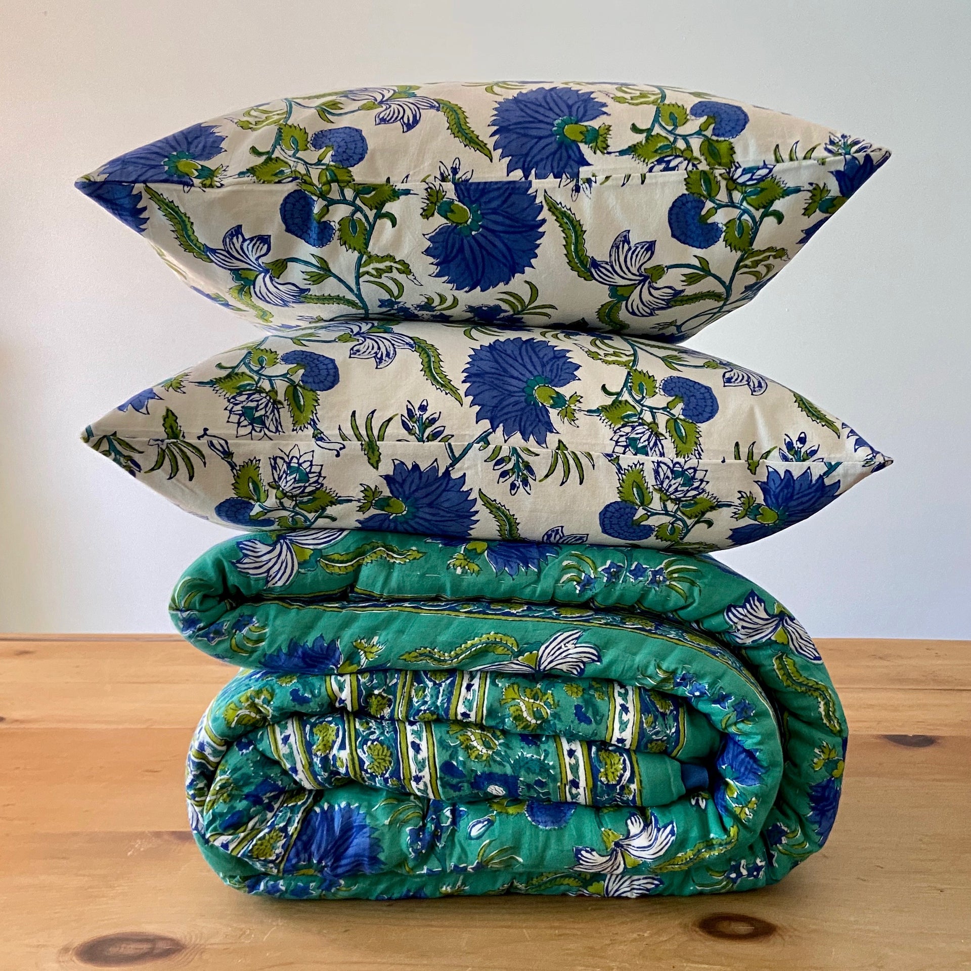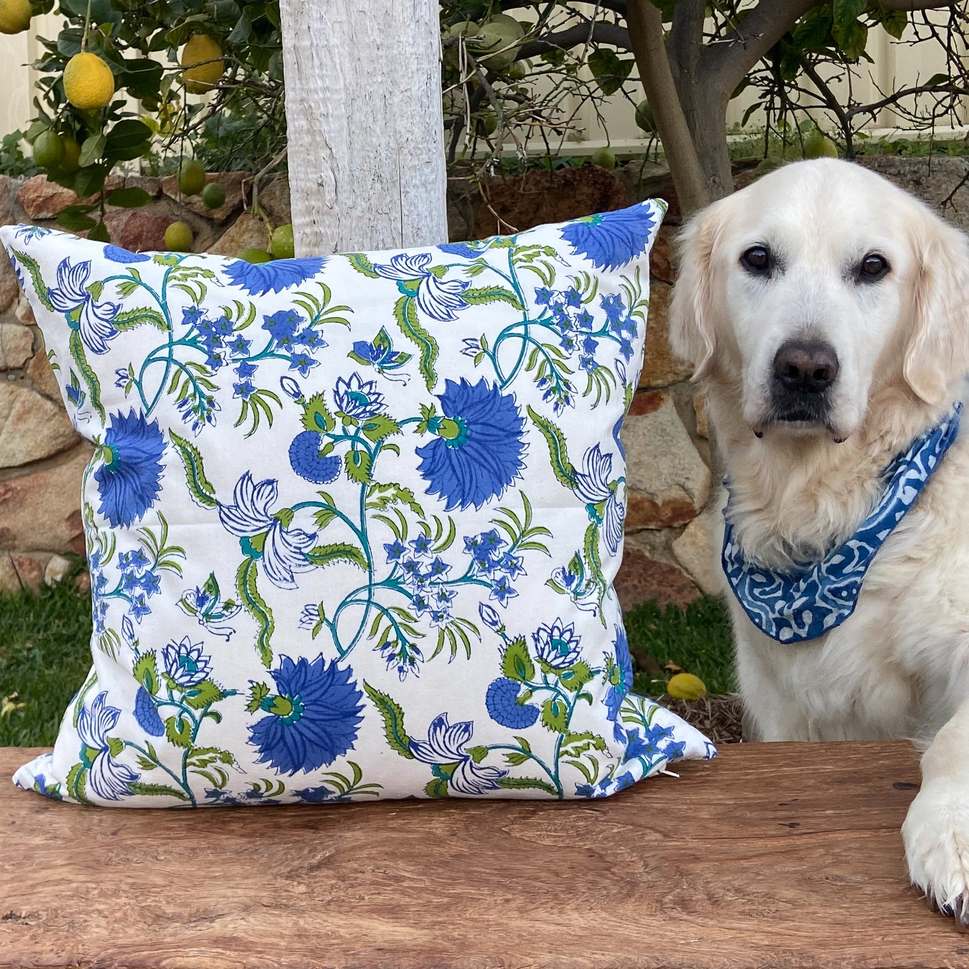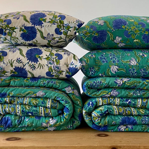 Beautiful and colourful cushion cover in rich shades of blue and green with splashes of white and yellow on a crisp white background to truly brighten up a dull space. These also go perfectly with our soft cotton-filled quilts in...View more