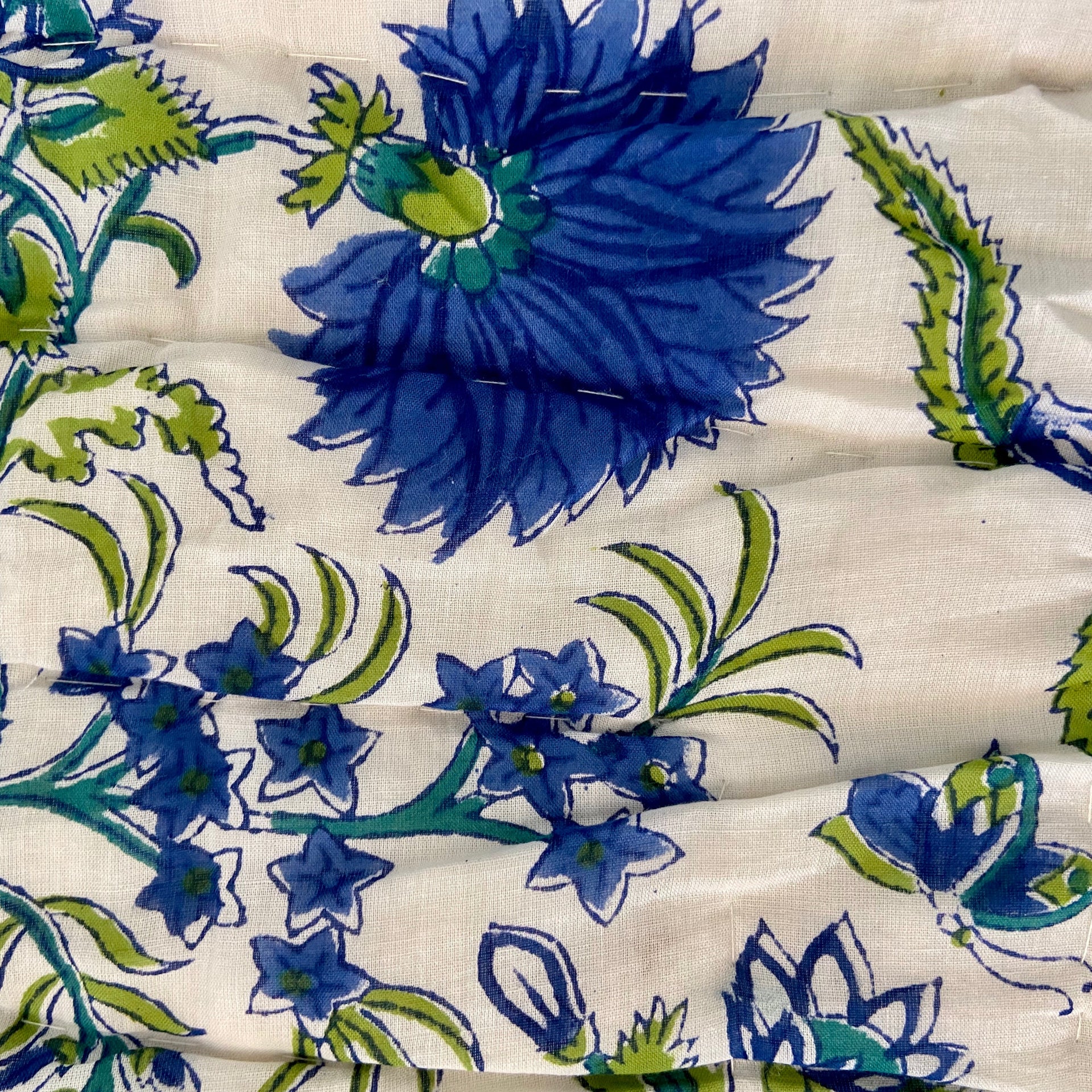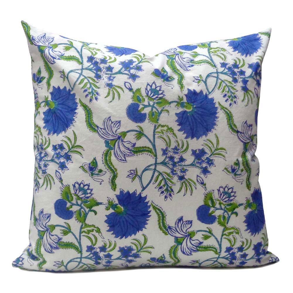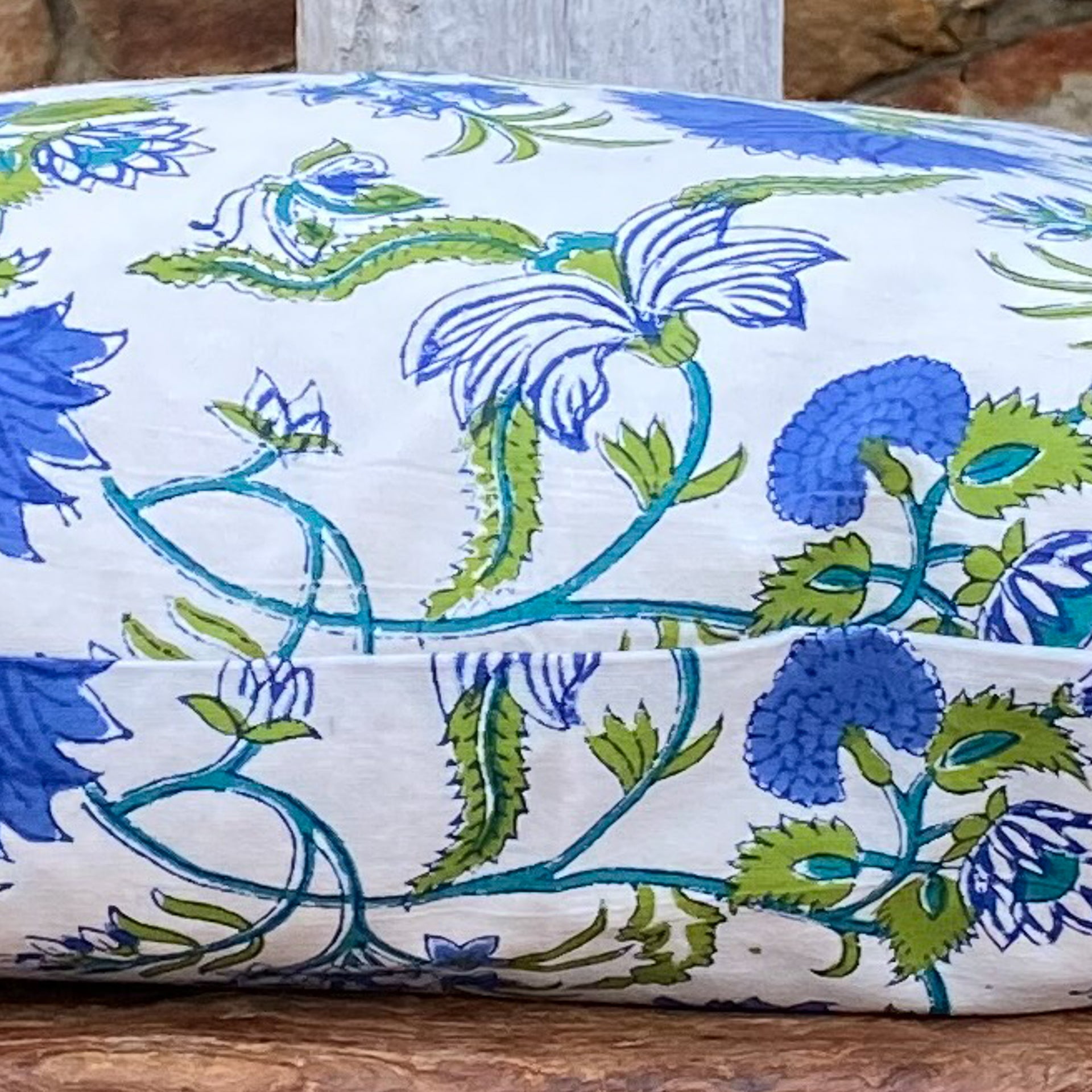 hand block printed pure cotton 50cm square cushion cover in flower blossom sea green open