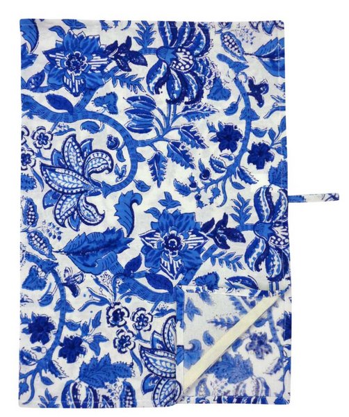This pretty cotton tea towel comes in a blue and white floral motif. It has hanging tapes for ease and will soften with each wash. They make great gifts!  Details you'll love... Hand block printed on 100% Cotton canvas Handcrafted...View more