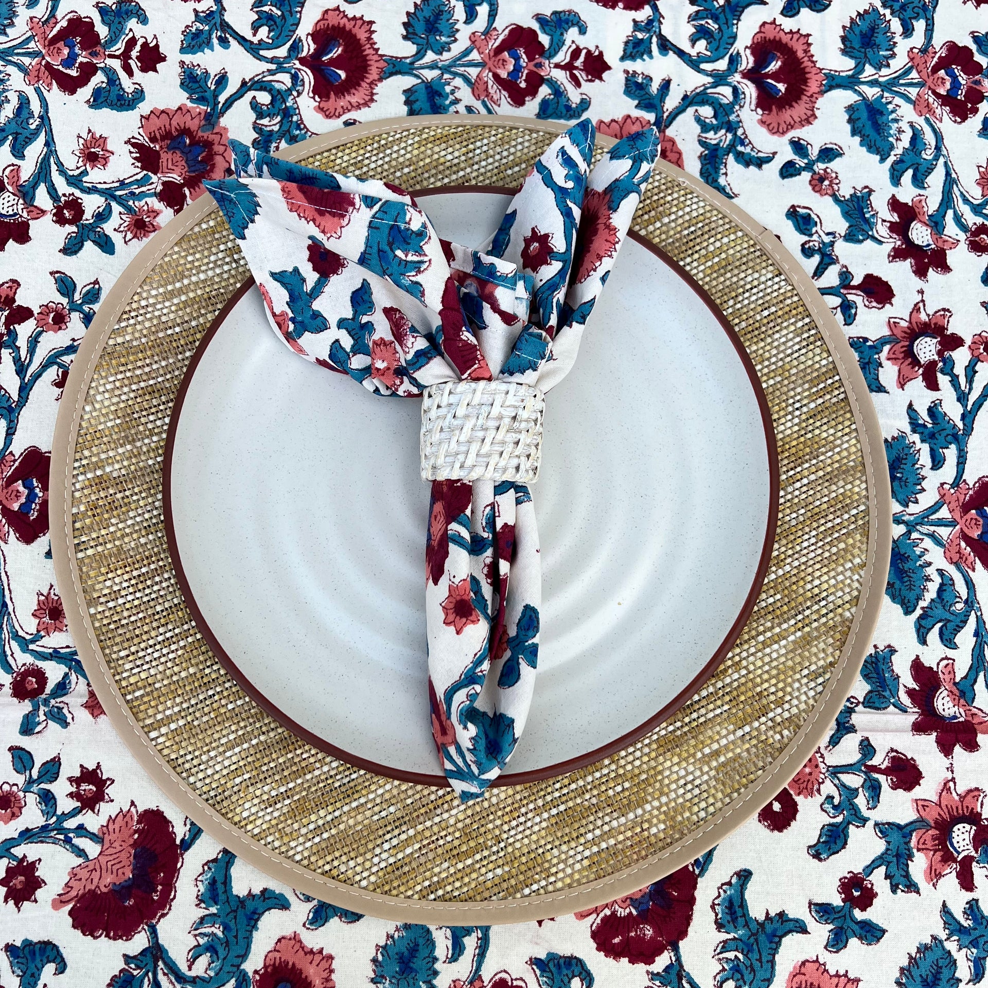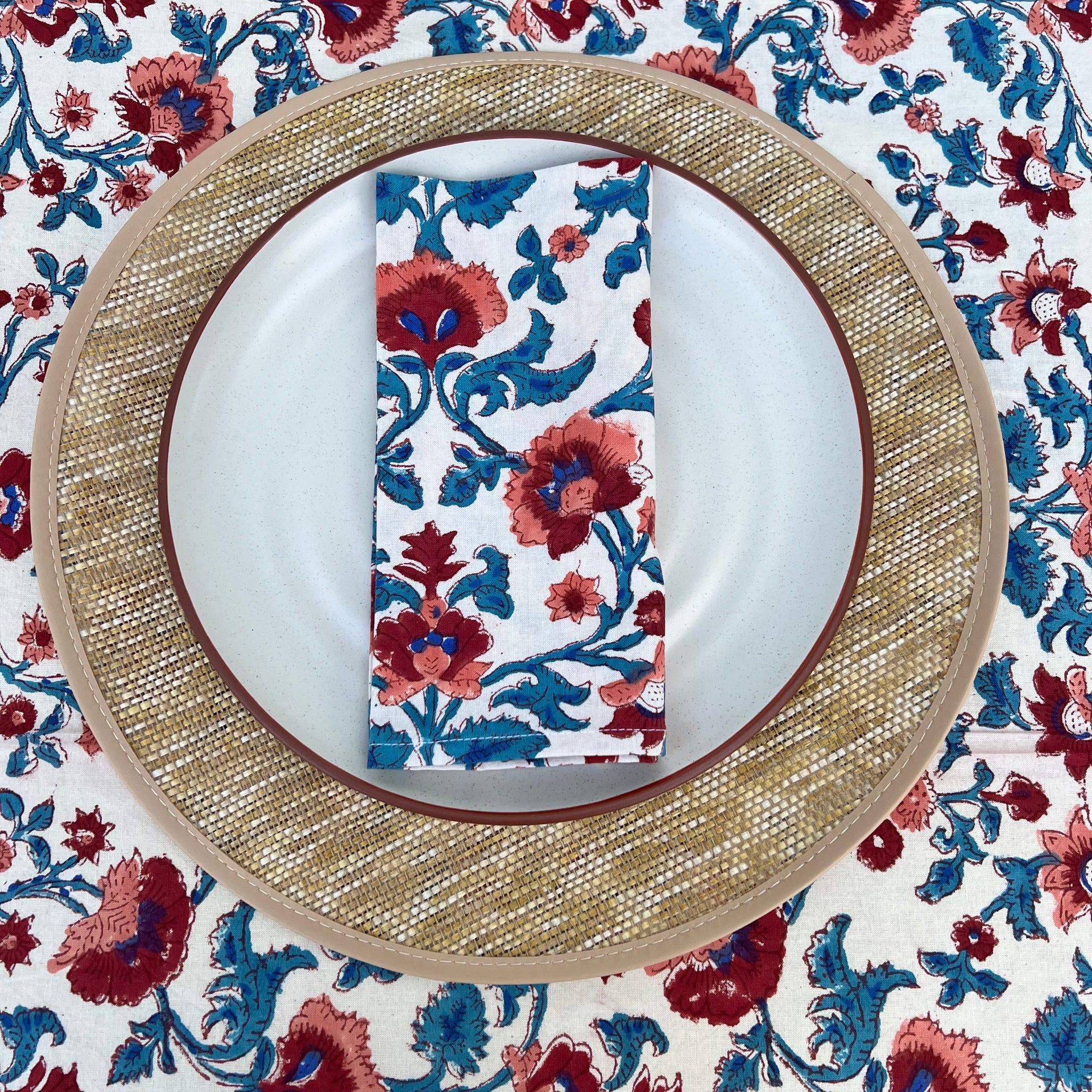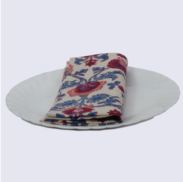 More photos to come!  Complete your indoor/outdoor table with napkins as a small, extravagant luxury. Made from 100% cotton and hand block printed in a deep red, blue and white design with. Add a beautiful, personal touch to your dining experience...View more