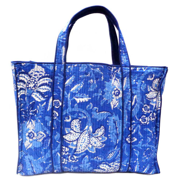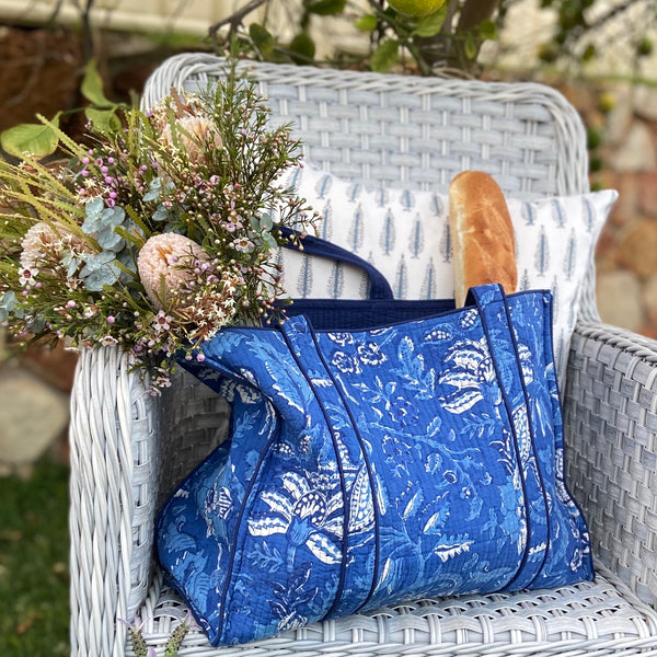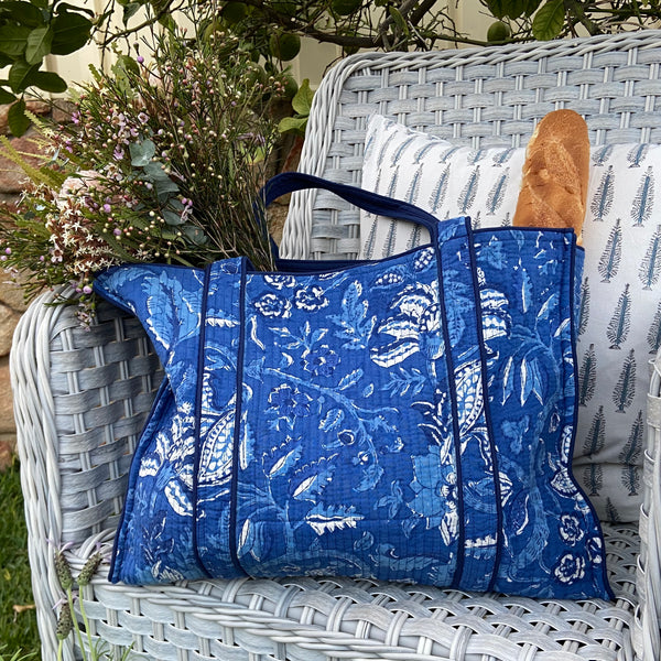 Hand Block Printed Quilted Tote Bag - Anarkali Blue