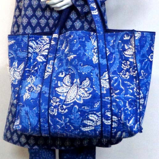 Pretty, quality, quilted, hand block printed tote bag in our stunning Anarkali Blue design finished with contrasting piping. It is perfect for the beach, shopping, school, picnic, the gym, home storage, or traveling... Details you'll love... FREE SHIPPING Spacious Hand...View more