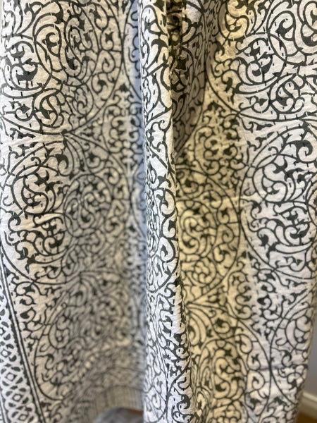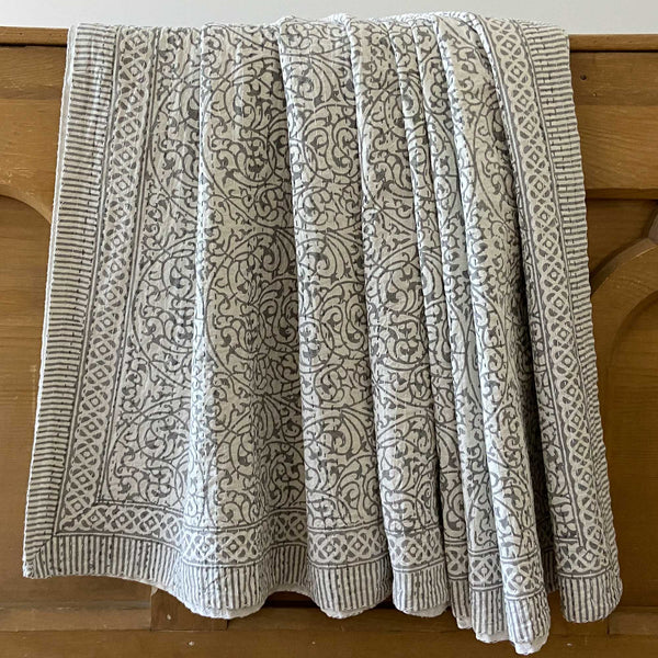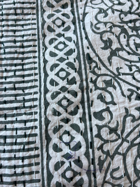 This gorgeous Kantha features a delicate Grey Vine print on a soft white background, with a plain white reverse.  It is finished with delicate filigree and striped border, corresponding Kantha stitching which is highlighted on the reverse and cross-stitched edges.  Perfect for the warmer...View more