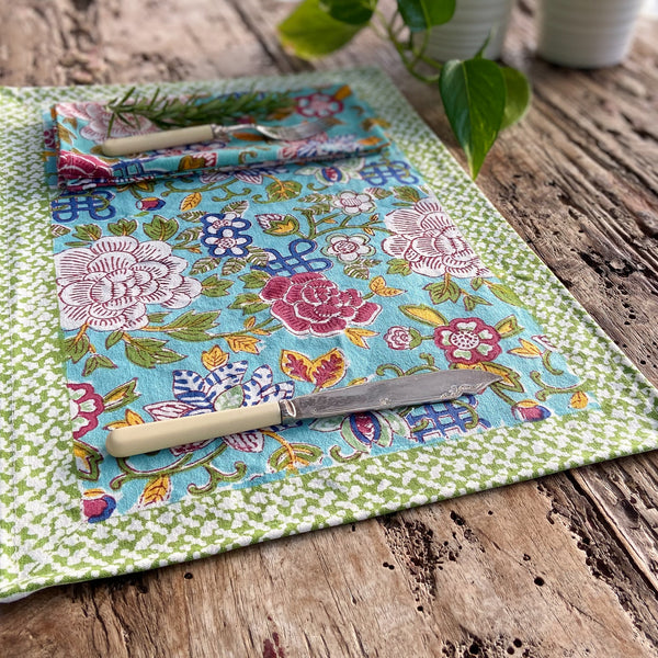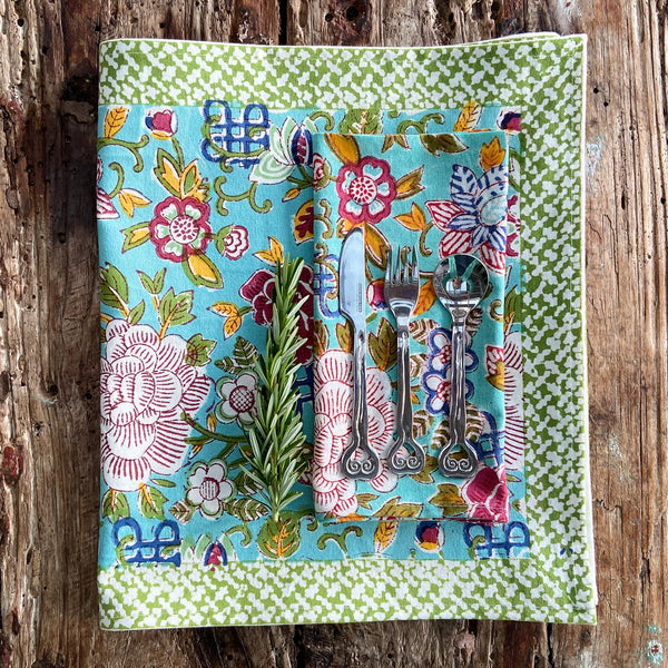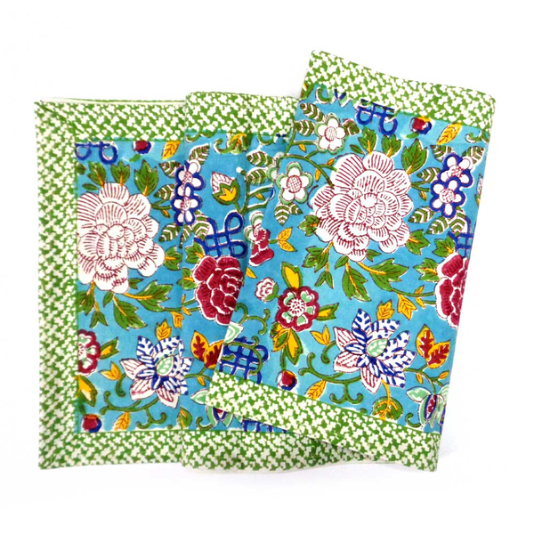 Beautiful, bright, and colourful table runner to enrich your dining experience! Pretty blue jade background with a delightful floral design in deep pink, blue, yellow, and green, printed on heavy-duty cotton with a bright green border. Have a look at...View more