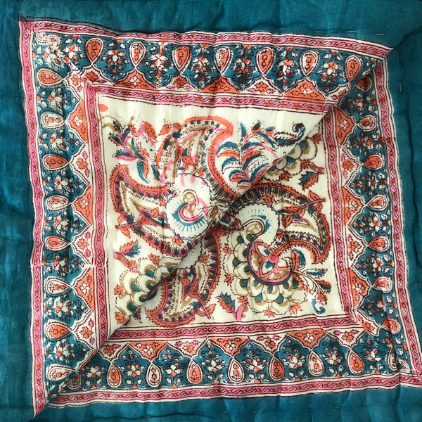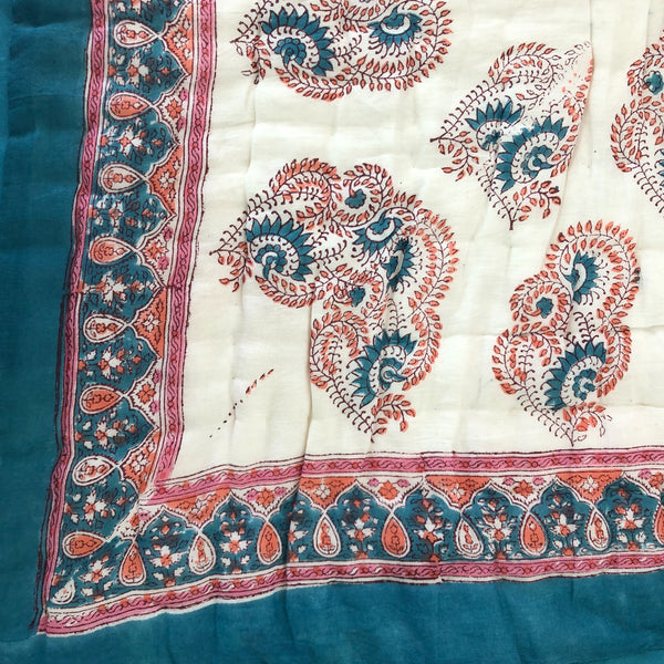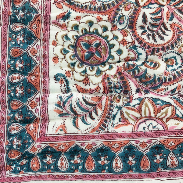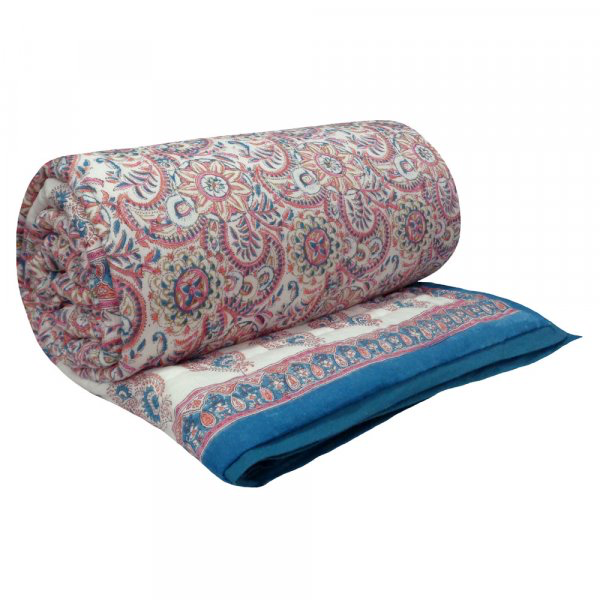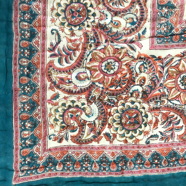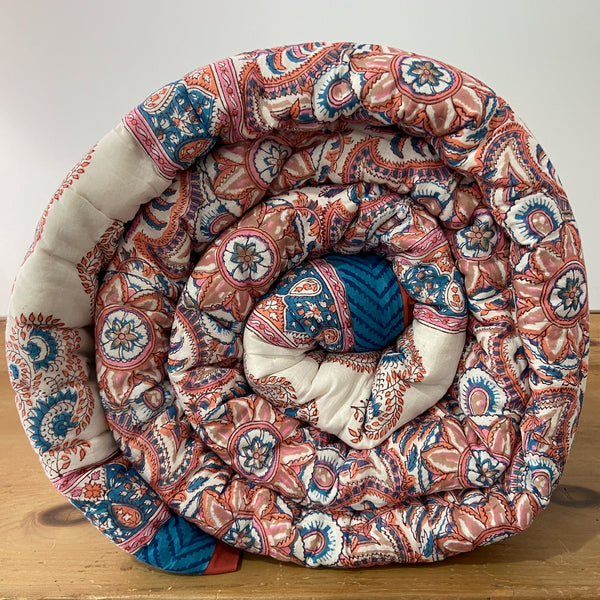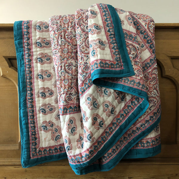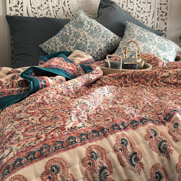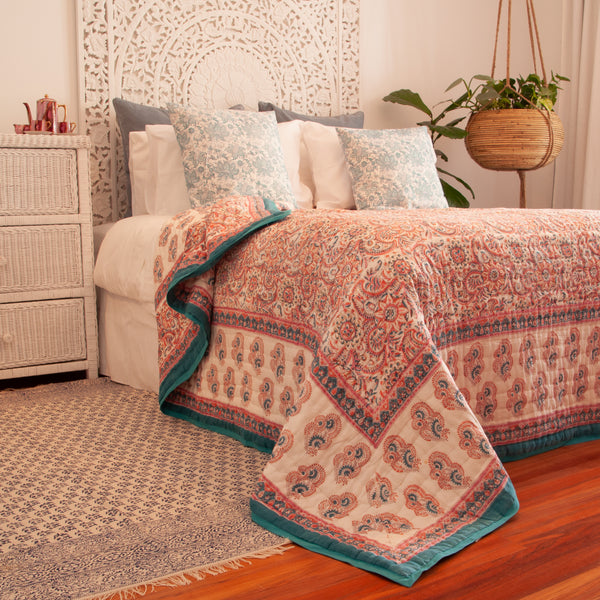 These quilts are lovingly hand block printed by skilled artisans in Jaipur, India using traditional techniques. They are then filled with natural cotton padding and hand quilted by a skilled group of beautiful ladies in a labour of love that shines through in these beautiful heirloom quilts. Due to their handcrafted nature, irregularities may occur rendering each piece unique.